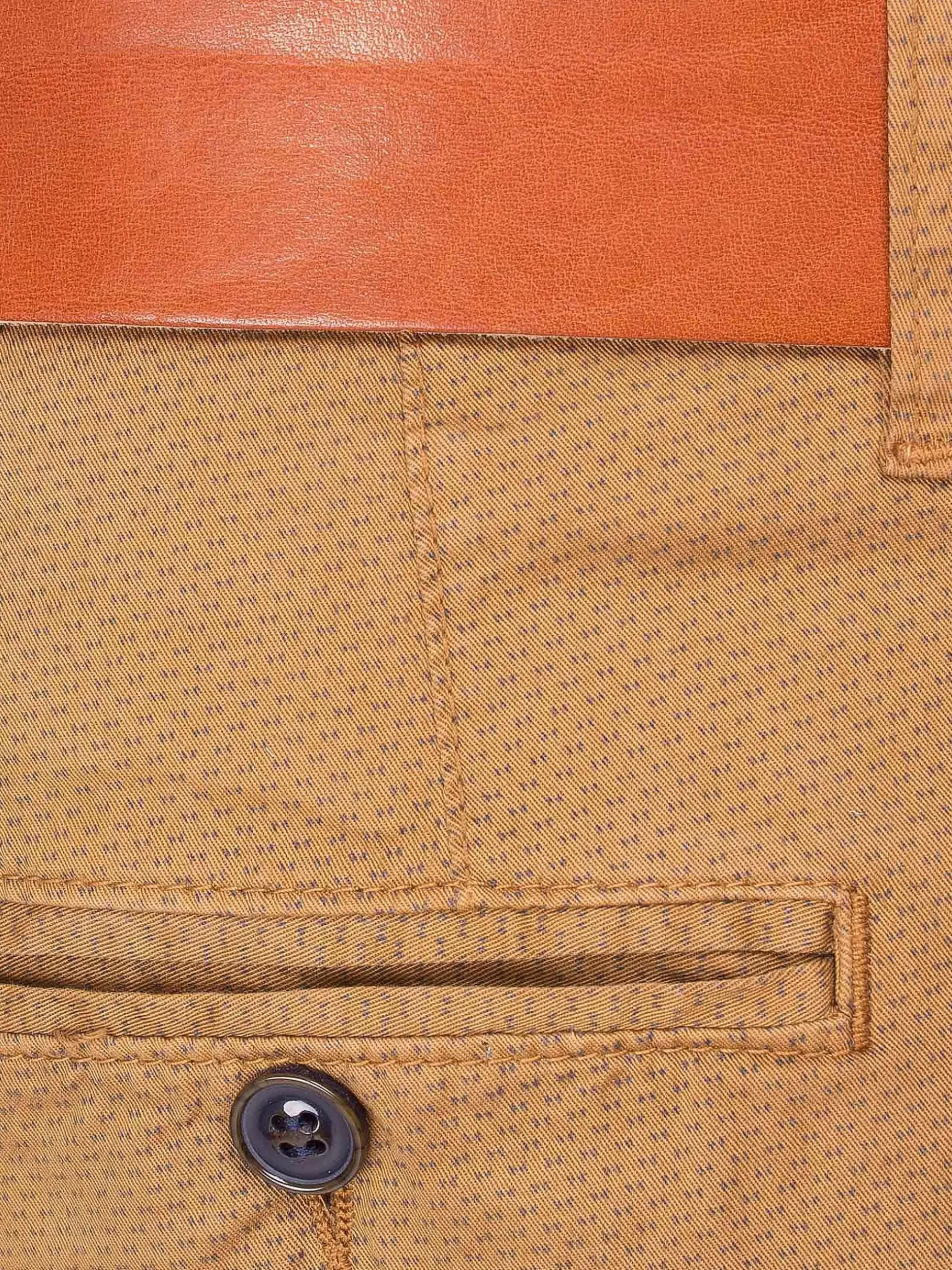 Deze Chino Heeft Een Subtiel Patroon In De Stof Verwerkt. Door De Kleur Is De Chino Gemakkelijk Te Combineren Voor Een Stoere Maar Ook Een Casual Look. De Broekzakken Op De Achterkant Sluiten Met Donkerbruine Knopen.