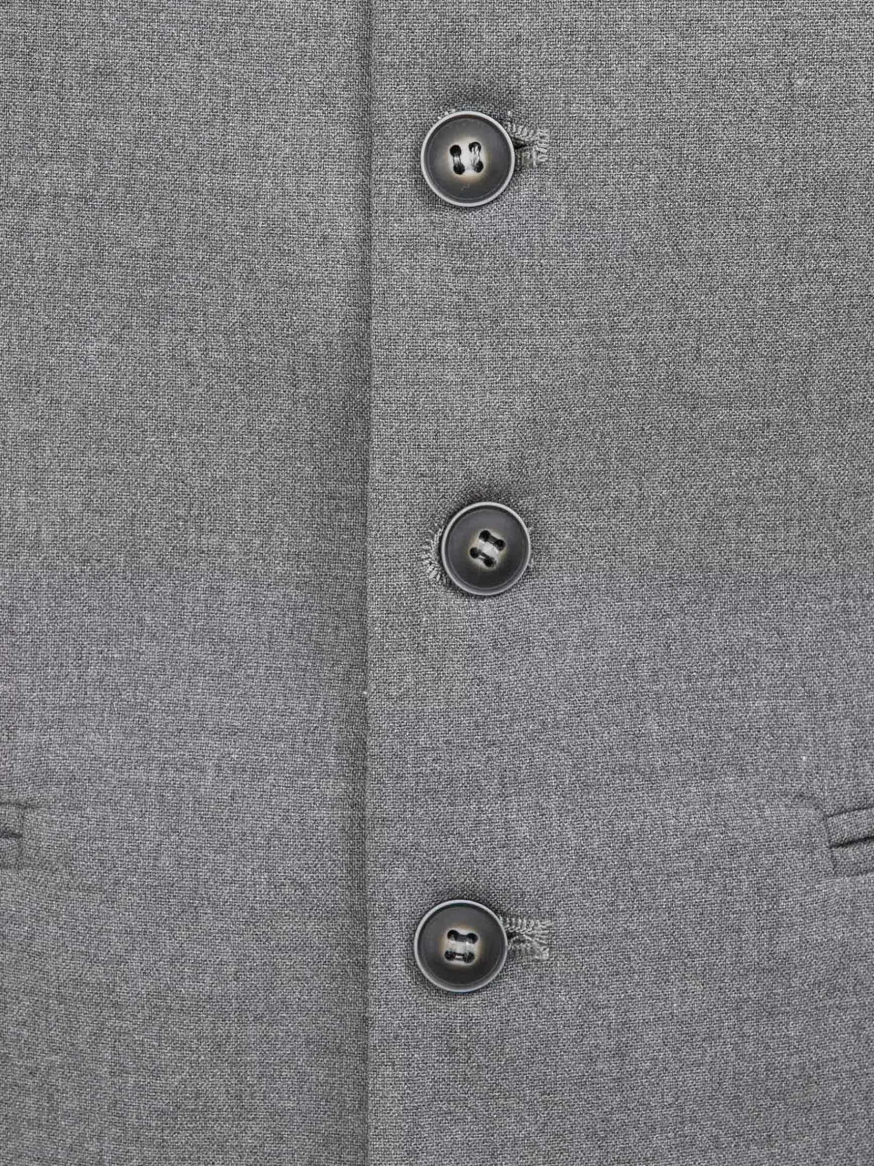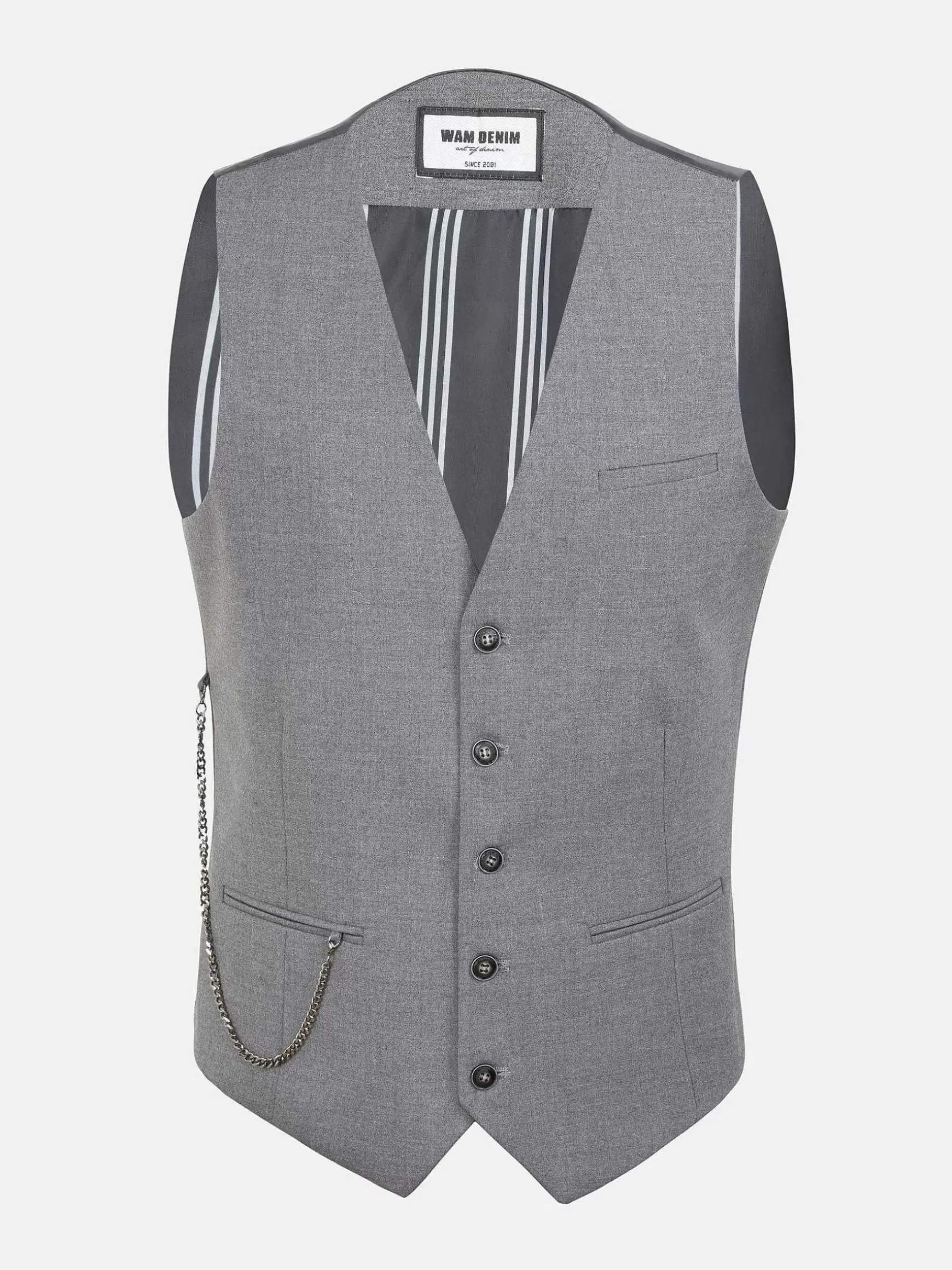 Grijs Vest Getailleerd, Afgewerkt Met Een Mooie Zwarte Binnen Voering Met Witte Strepen. Dit Model Heeft Een Knoopsluiting Met Vijf Knopen En Een Afneembaar Zilverkleurig Sierkettinkje.