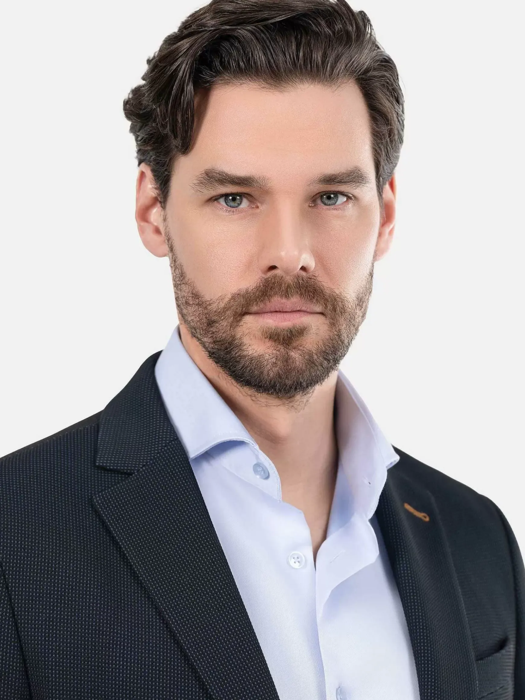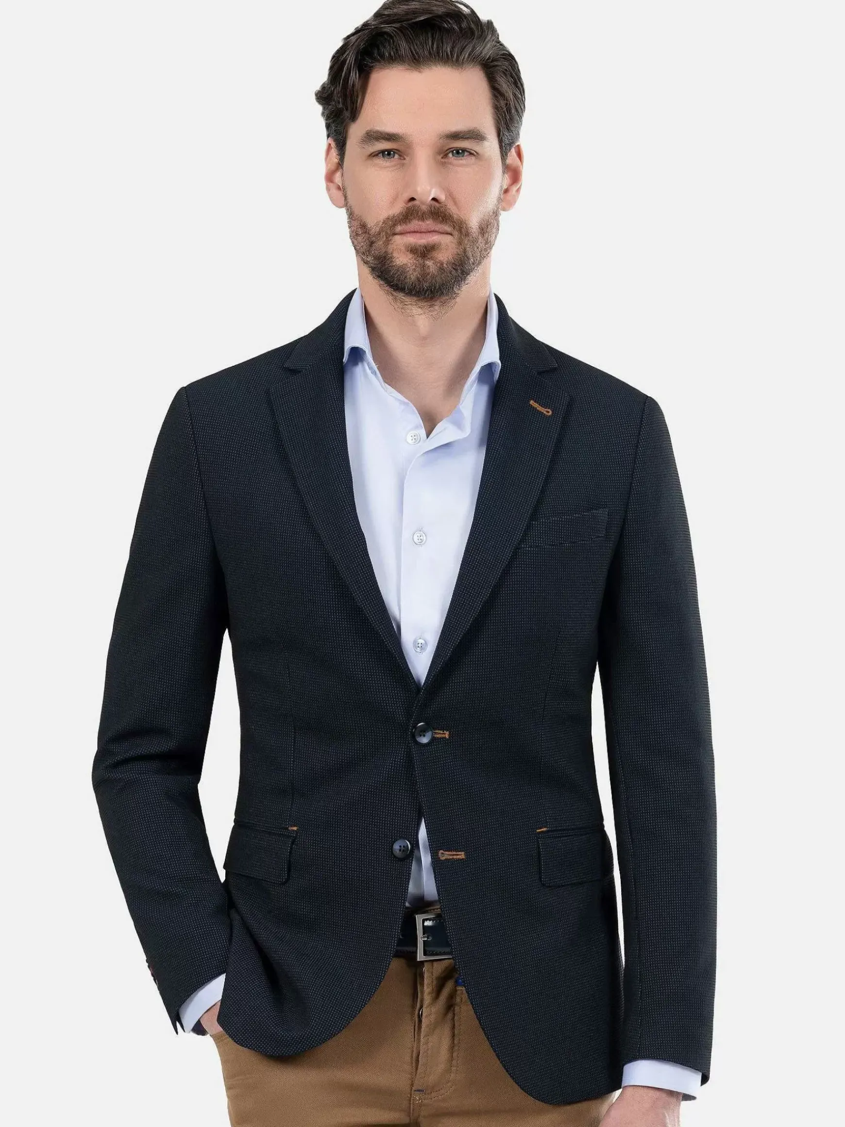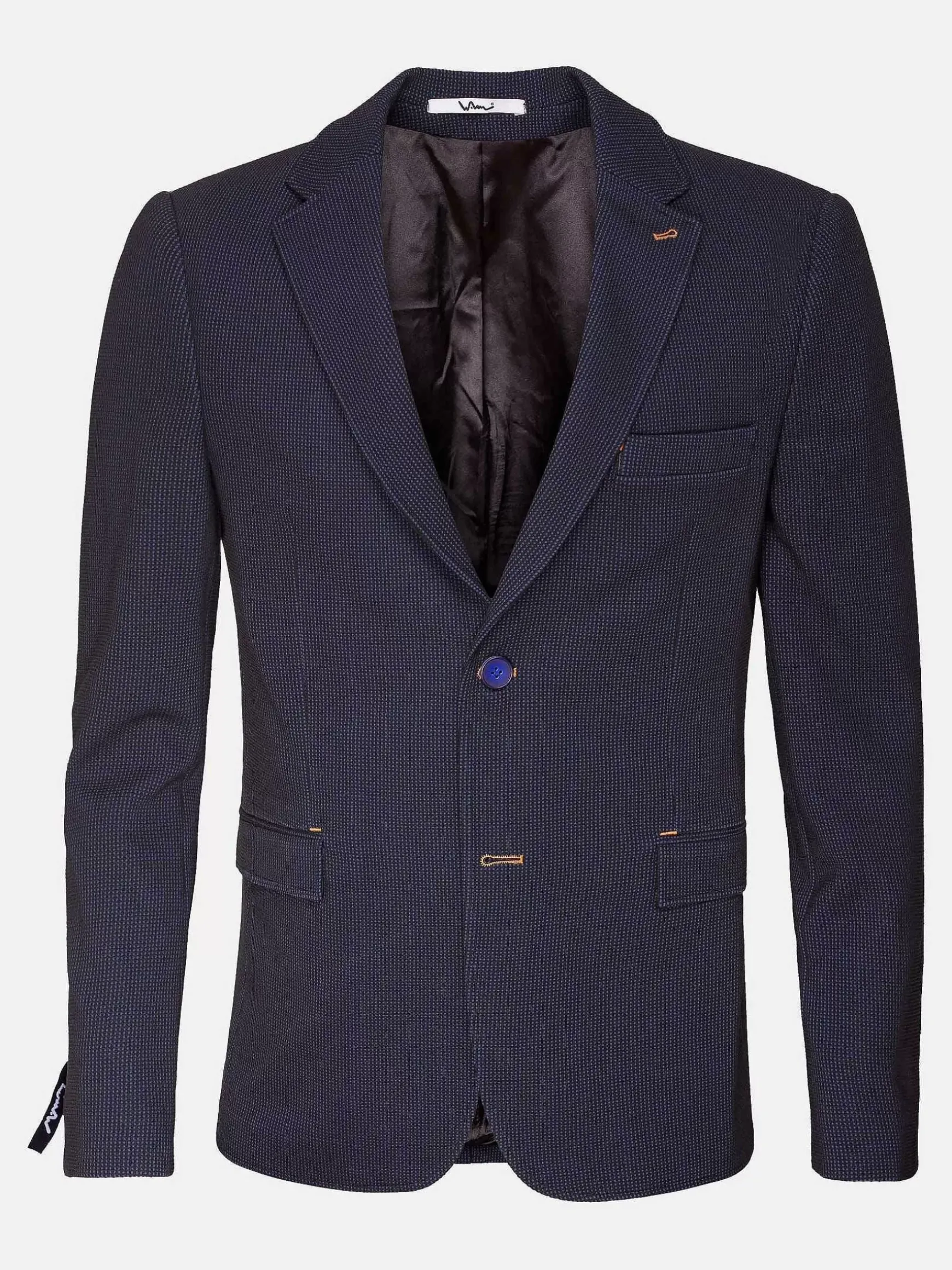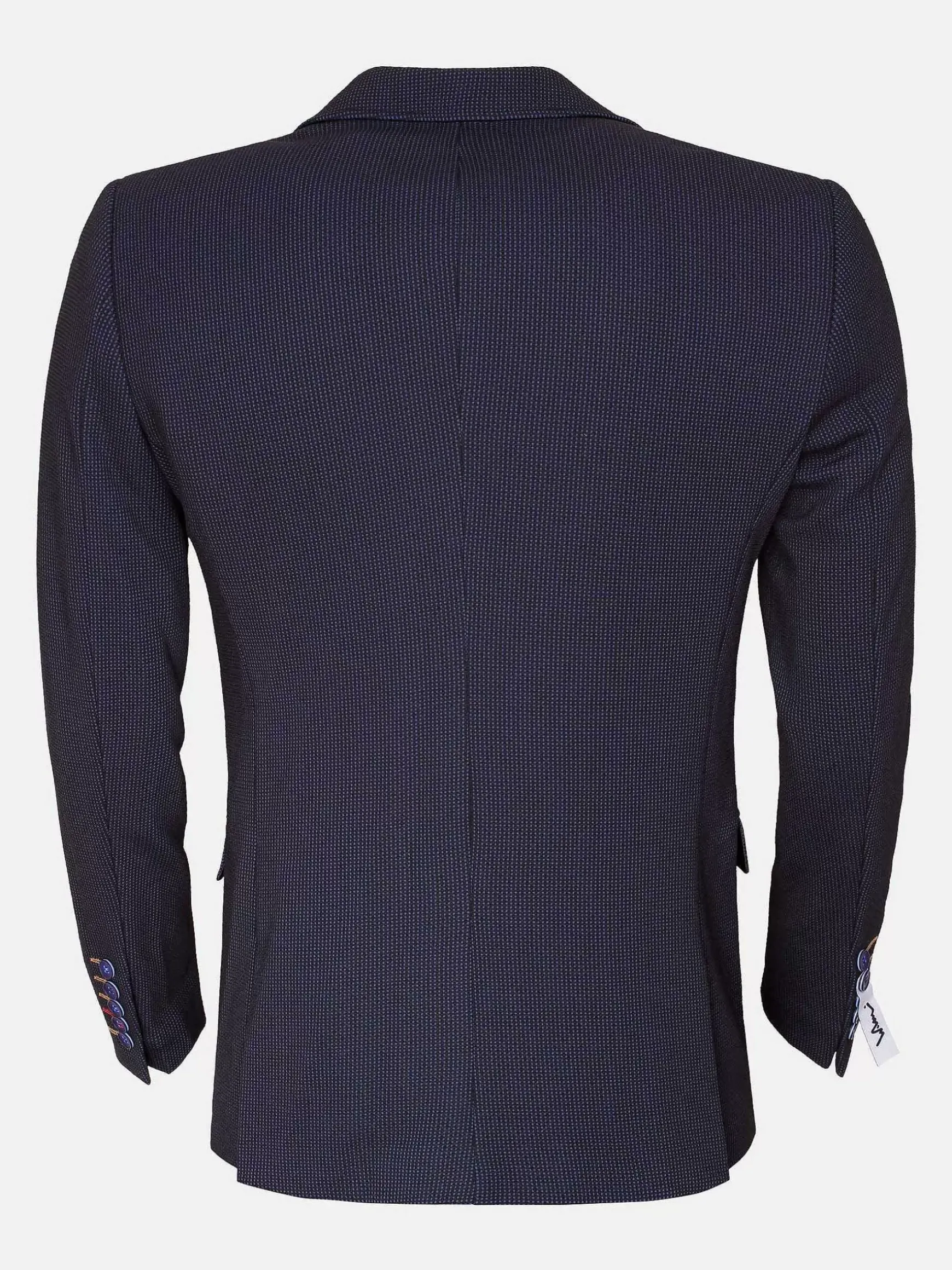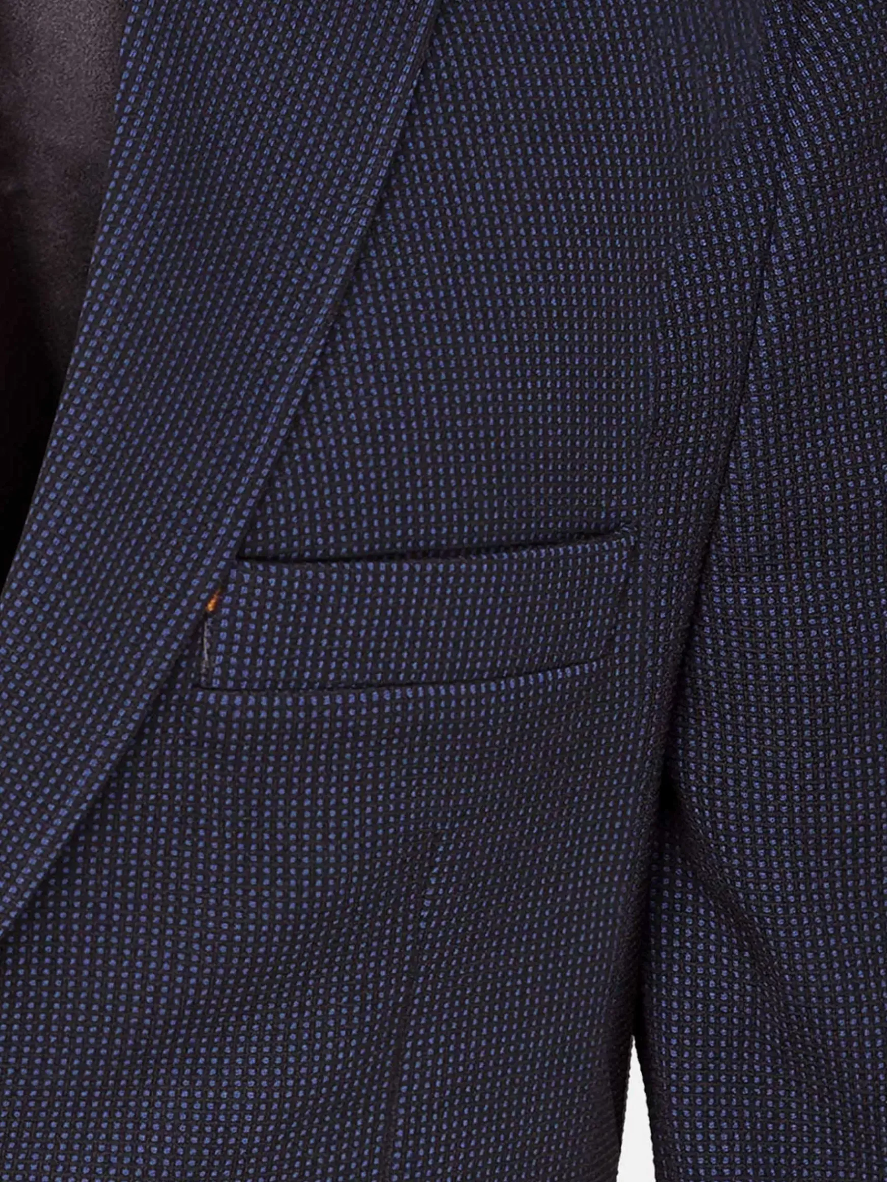 Italy Stretch Poly Light Indigo Cobert Is Een Tijdloos Stuk Dat Klassieke Elegantie Combineert Met Moderne Verfijning. Het Is Gemaakt Van Een Eersteklas Mix Van Viscose, Polyester En Elastaan En Biedt Duurzaamheid, Comfort En Krasvastheid. Het Heeft Een Brede Revers, Een Moderne Pasvorm En Een Eenborstig Ontwerp Met Twee Knopen. De Blazer Heeft Ook Klepzakken Op De Borst En Een Miniruit Met Stippen, Waardoor Het Een Veelzijdige Keuze Is Voor Verschillende Gelegenheden.