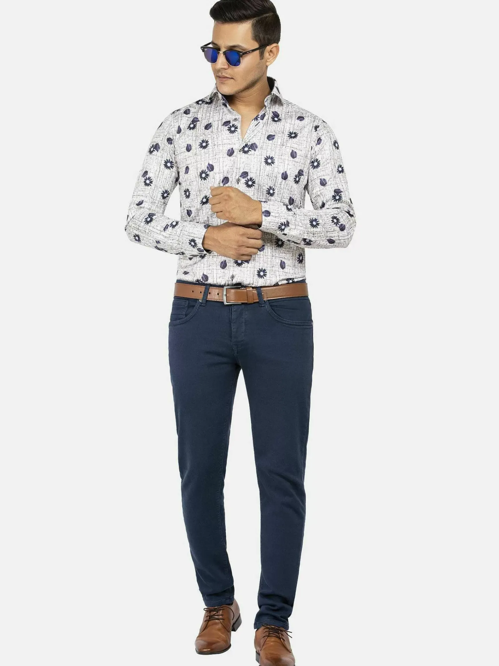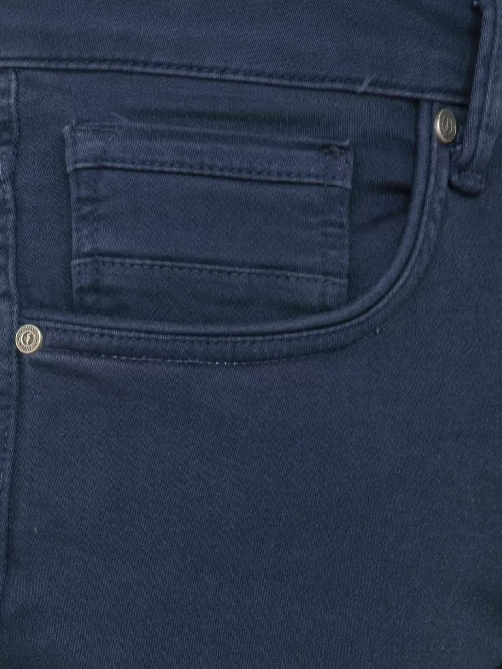 Navy Kleurige Jeans Met Een Getailleerde Pasvorm. Dit Model Heeft Een Knoopsluiting En Een Bruin Embleem Op De Achterkant, Boven De Rechterzak. Deze Jeans Is Het Begin Van Je Outfit En Dat Kan Zowel Een Casual Als Een Nette Look Zijn.