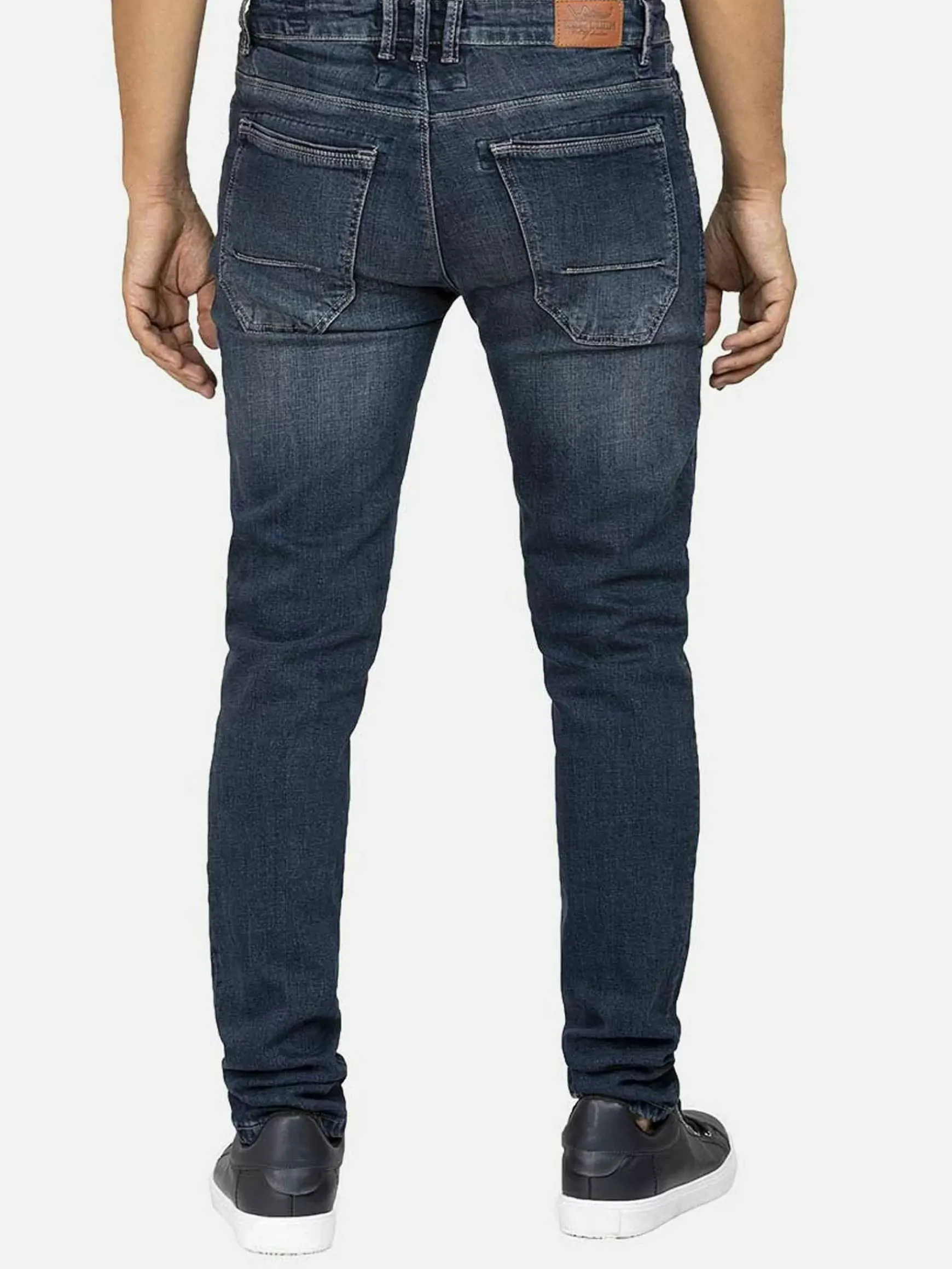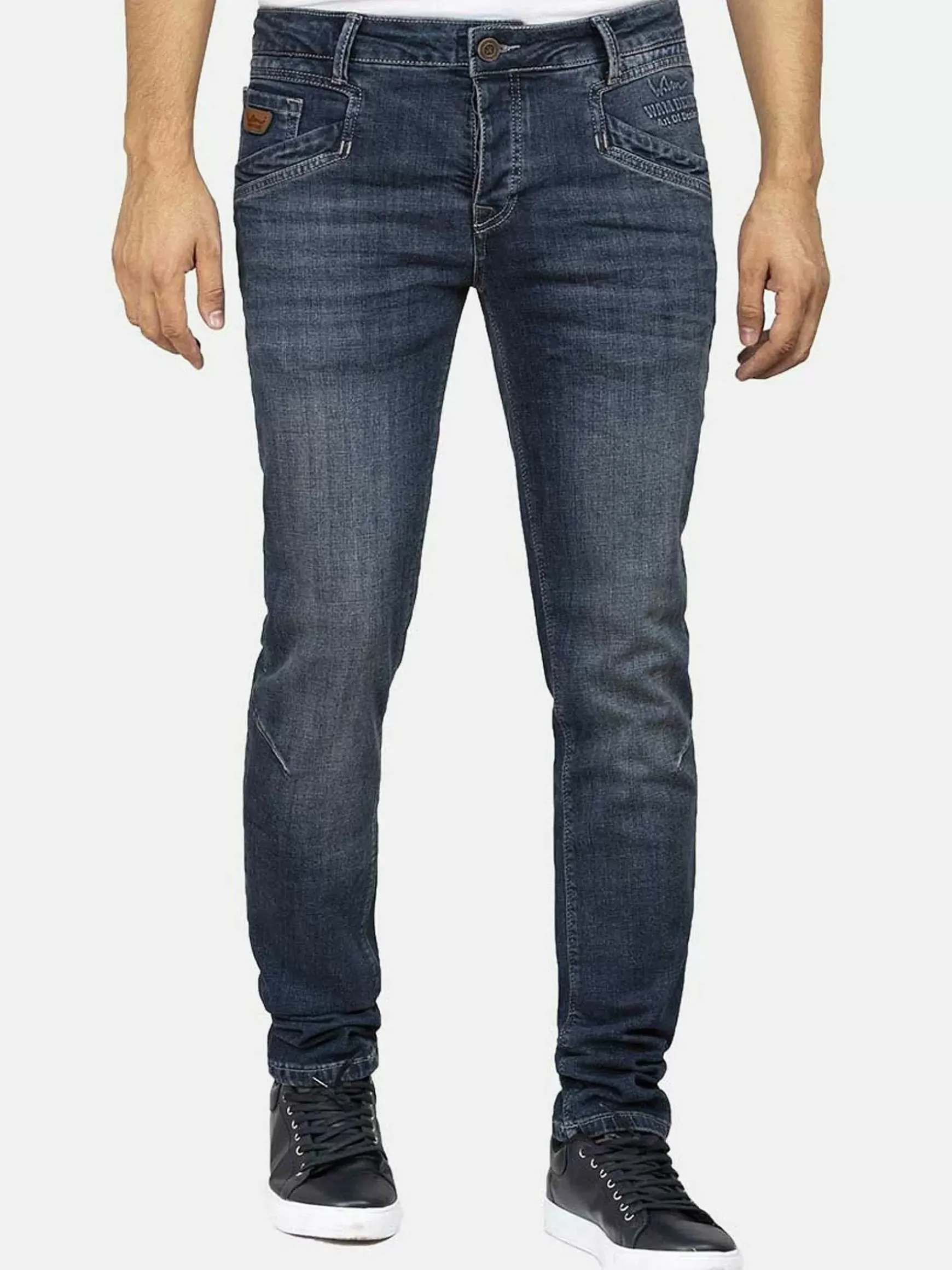 Blauwe Jeans Met Knoopsluiting. Dit Model Heeft Licht Stone Wash Op De Bovenbeen En Accenten Boven De Zakken Aan De Voorzijde. Deze Jeans Is Heel Goed Te Combineren In Verschillende Outfits.