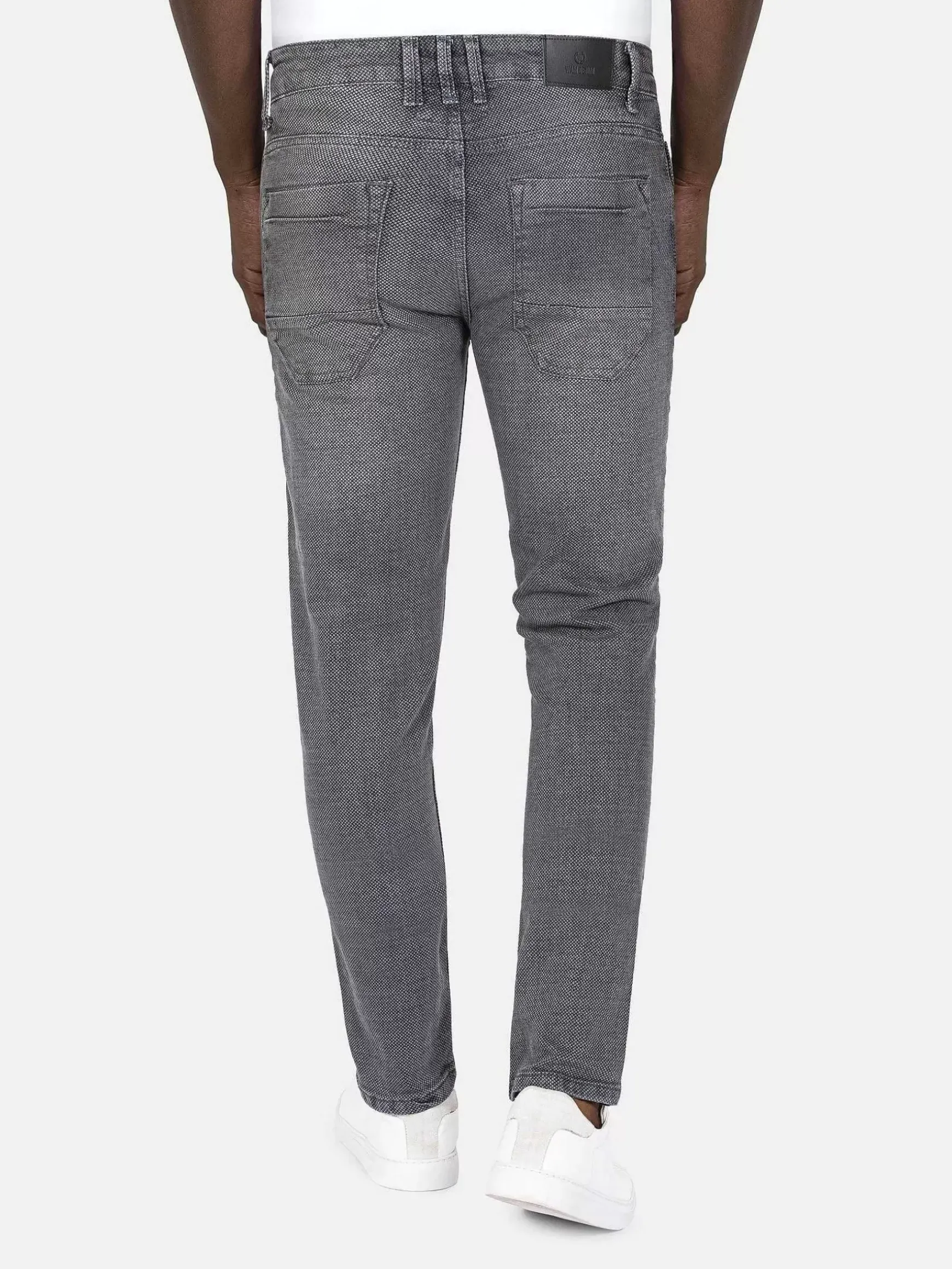 Strakke Jeans Met Rijke Textuur Op De Stof, Grijs Gestikt En Met Een Elegante Look. De Jeans Heeft Een Rits, Twee Voorzakken, Twee Achterzakken En Een Embleem Op De Taille. Met Veel Items Te Combineren. Zowel Voor Een Nette Outfit Te Gebruiken Als Een Casual Outfit.