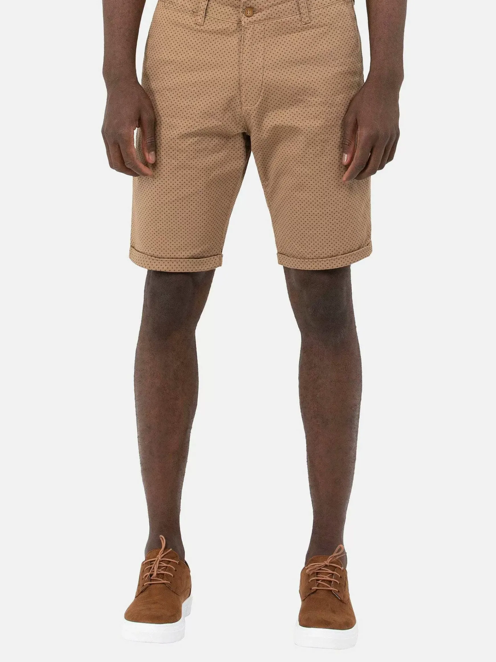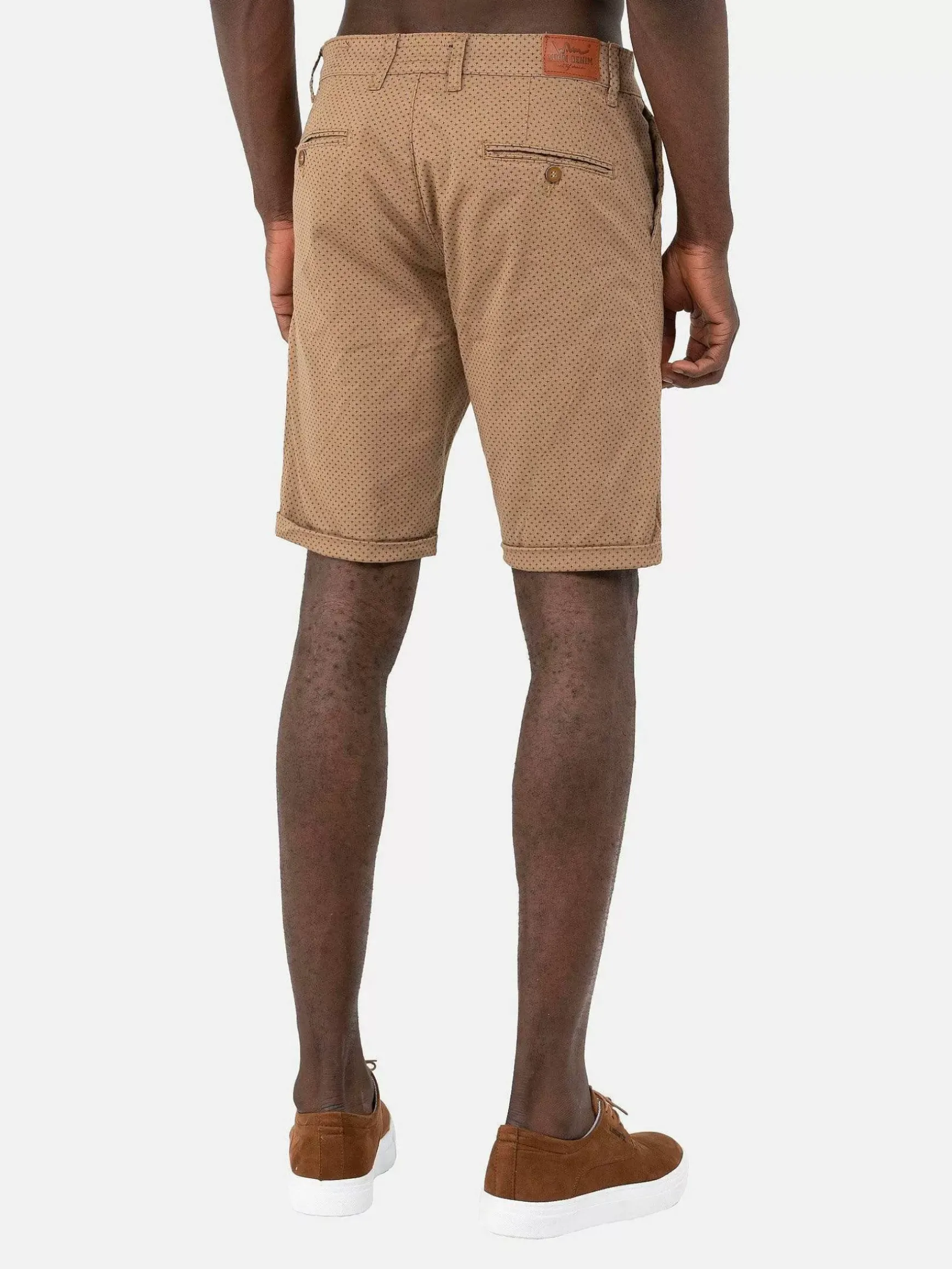 Beige Korte Broek Met Subtiel Figuratief Patroon. Dit Model Heeft Een Ritssluiting, Heeft Twee Achterzakken En Een Bruin Embleem Aan De Achterzijde.
