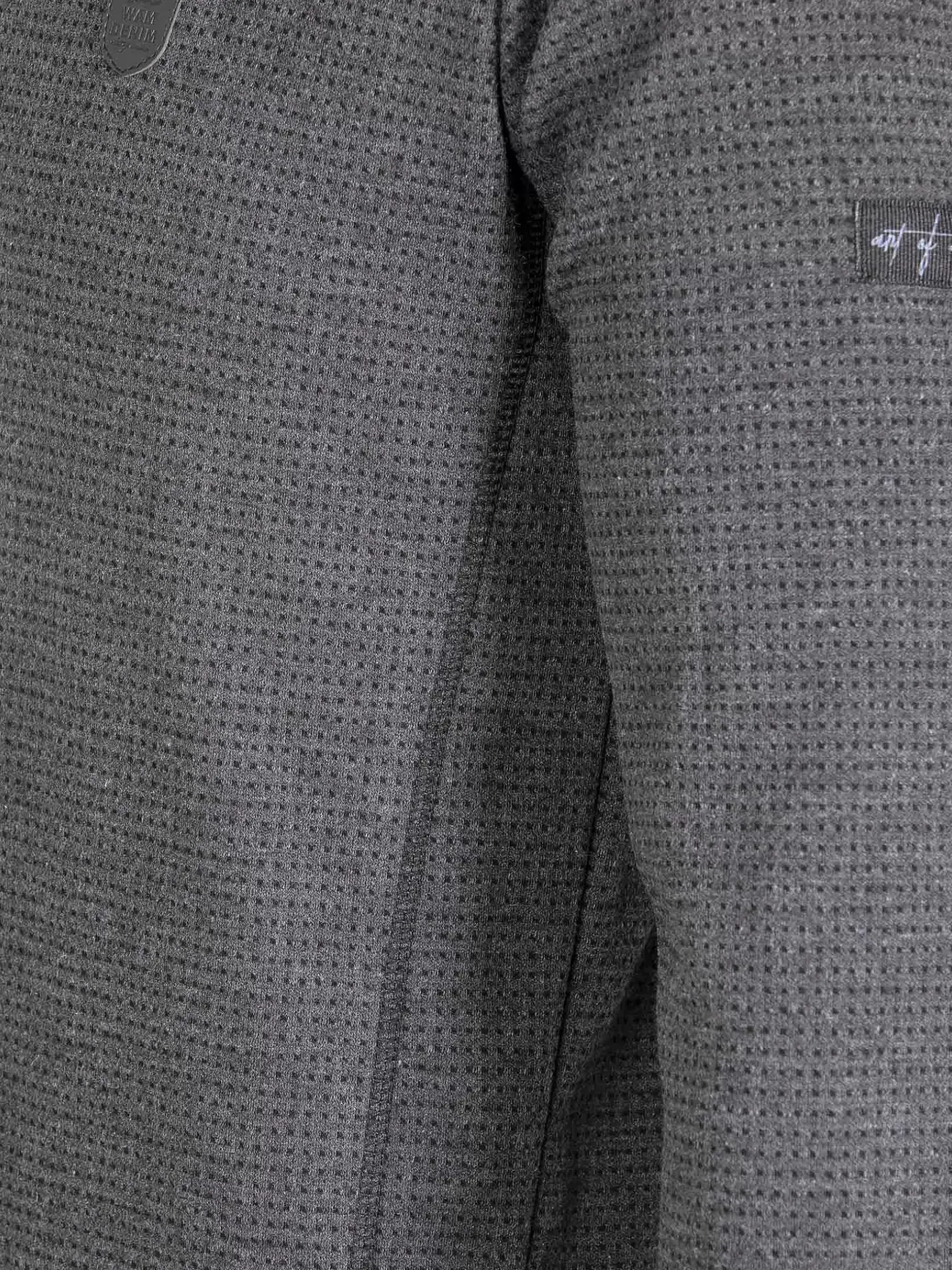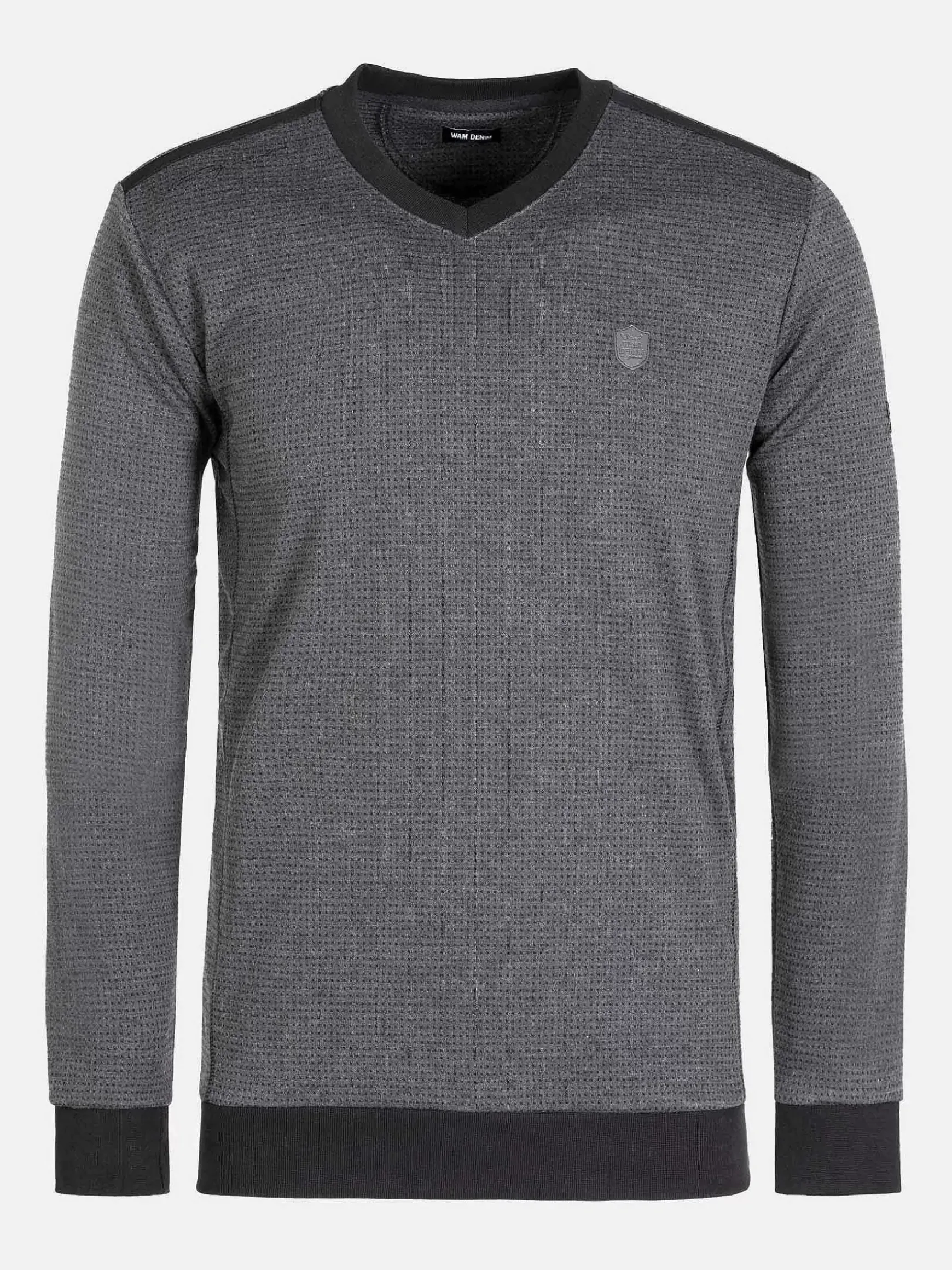 Grijze Sweater Met Zwarte V-Hals. De Sweater Heeft Een Comfortabele Pasvorm Door De Stretch En Is Mooi Afgewerkt Met Een Embleem Op De Linkerborst En Zwart Gestikte Banden Op De Schouders.