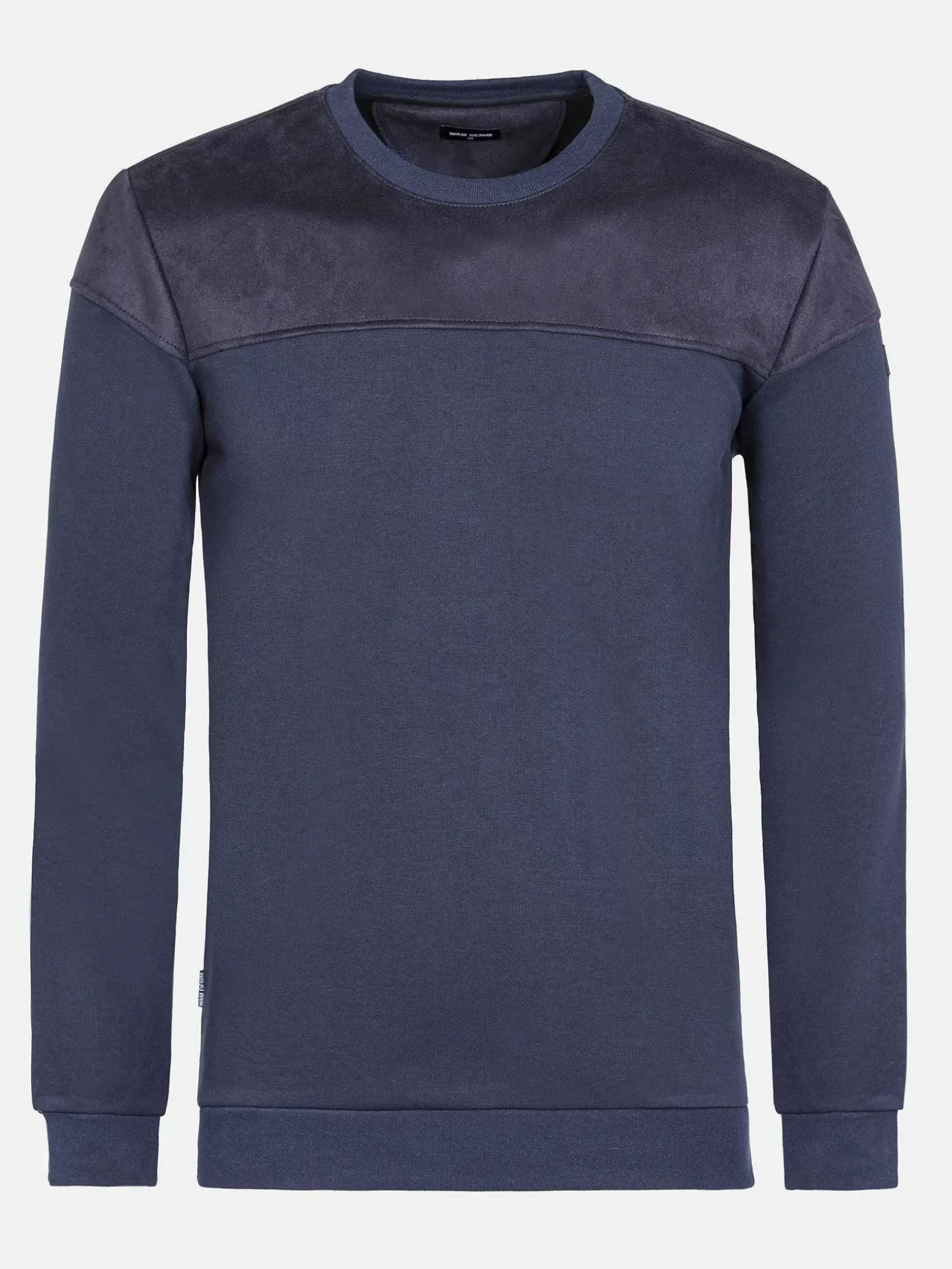 Marineblauw Kleurige Trui Met Tweekleurig Ontwerp En Elastische Taille Voor Een Perfecte Pasvorm. Deze Trui Heeft Een Ronde Hals.