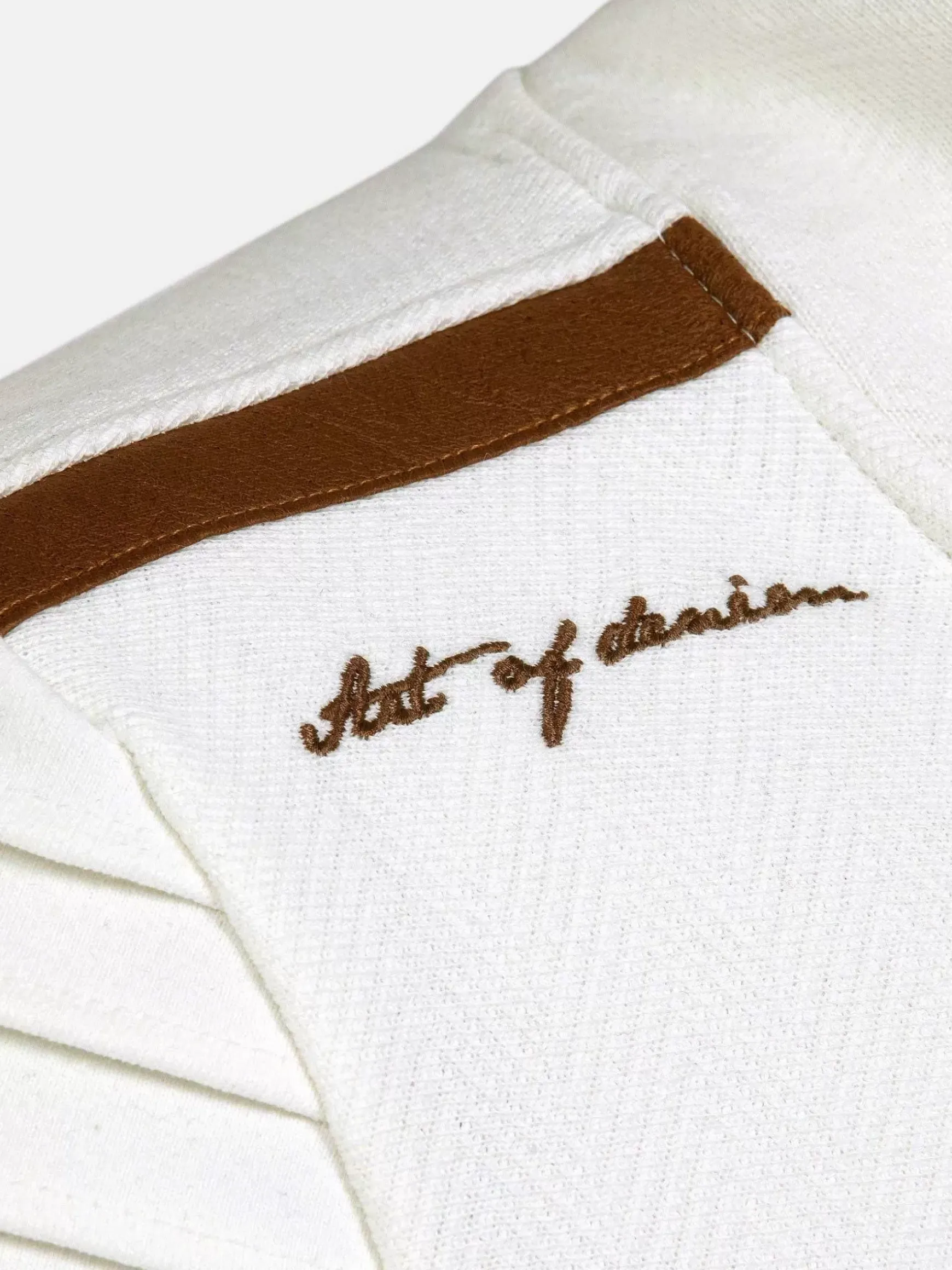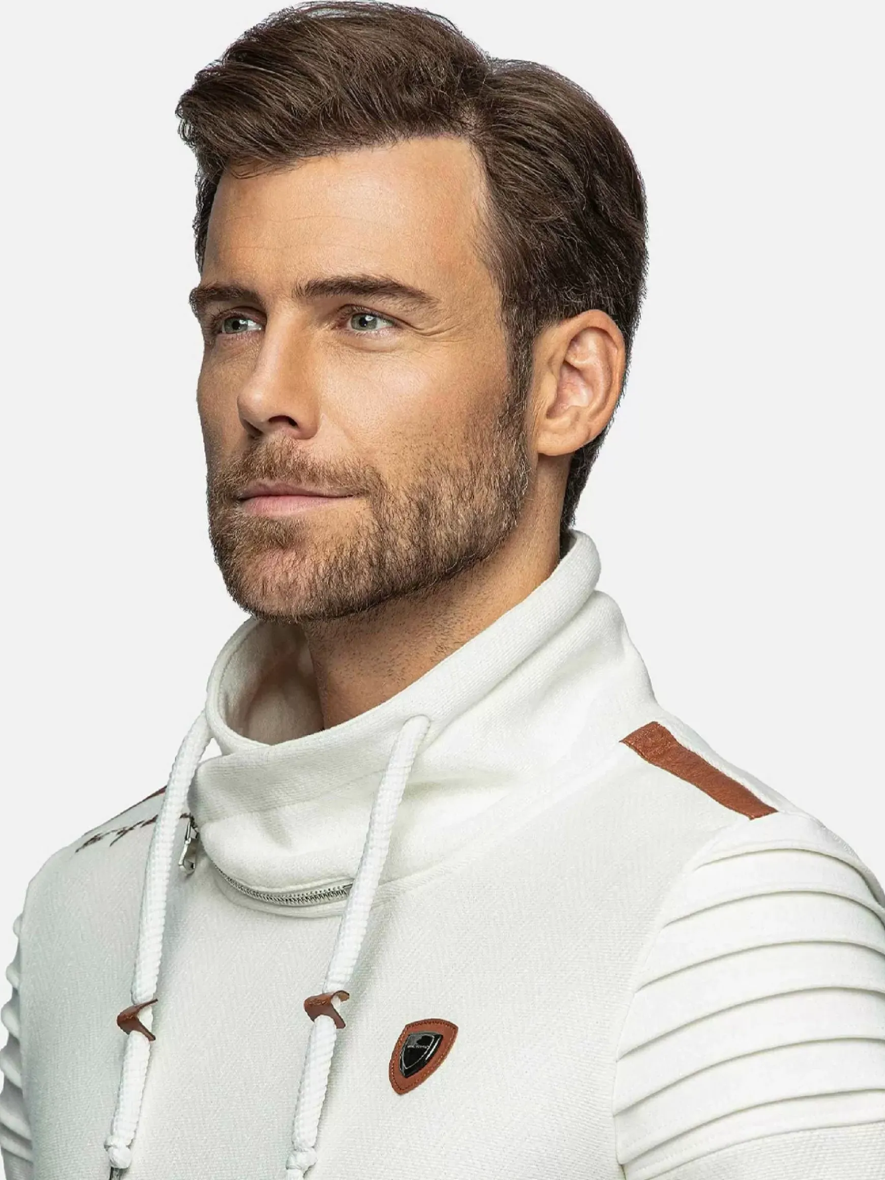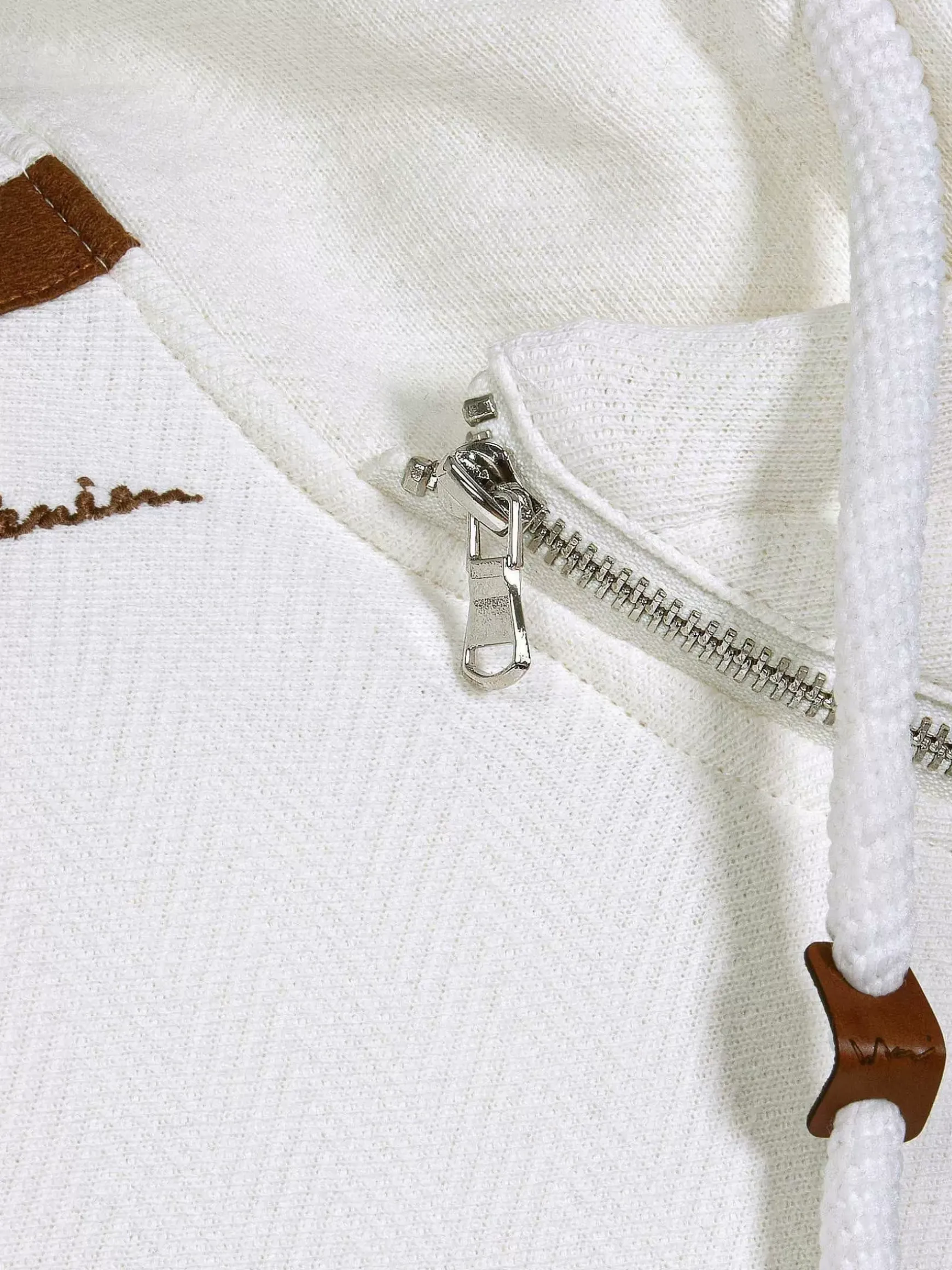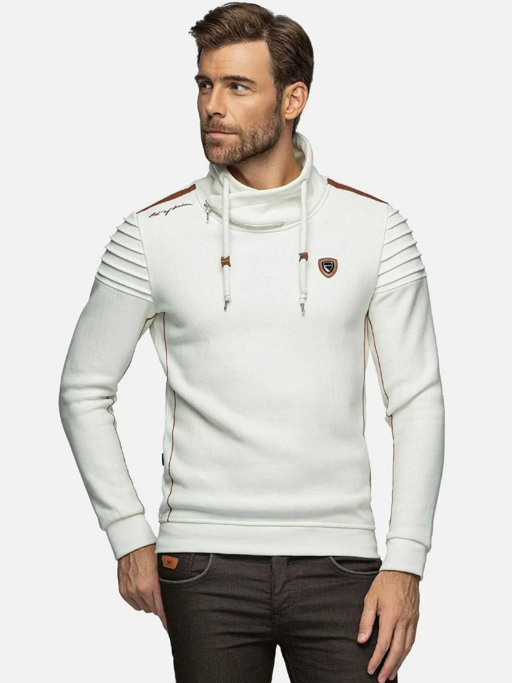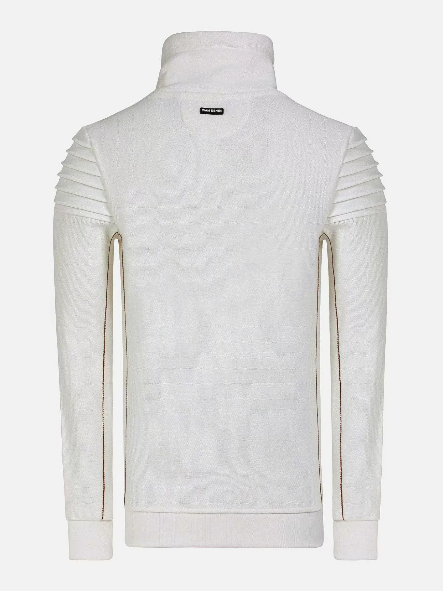 Witte Sweater Met Een Hoge Kraag. De Kraag Heeft Een Kleine Rits En De Sweater Heeft Aan De Binnenkant Van Mouw Een Subtiele Bruine Streep Lopen. Op De Linkerborst Een Embleem Bevestigd. Voor Een Perfect Pasvorm Zijn De Uiteinden Van De Mouwen En De Boord Aan De Onderkant Elastisch.