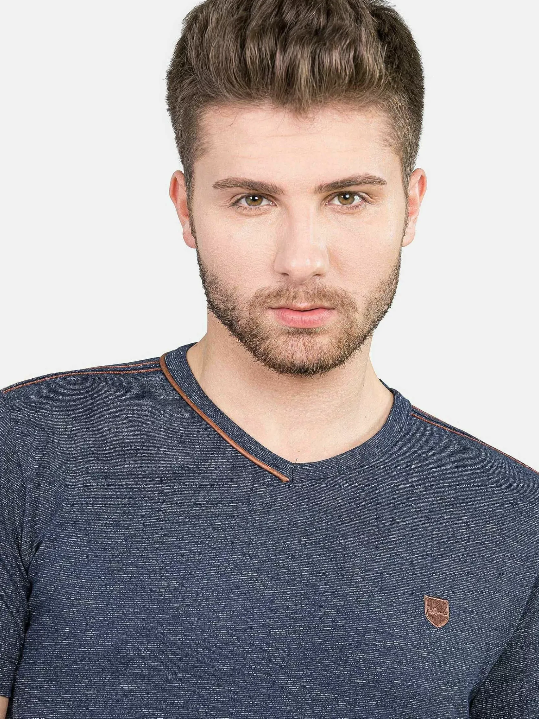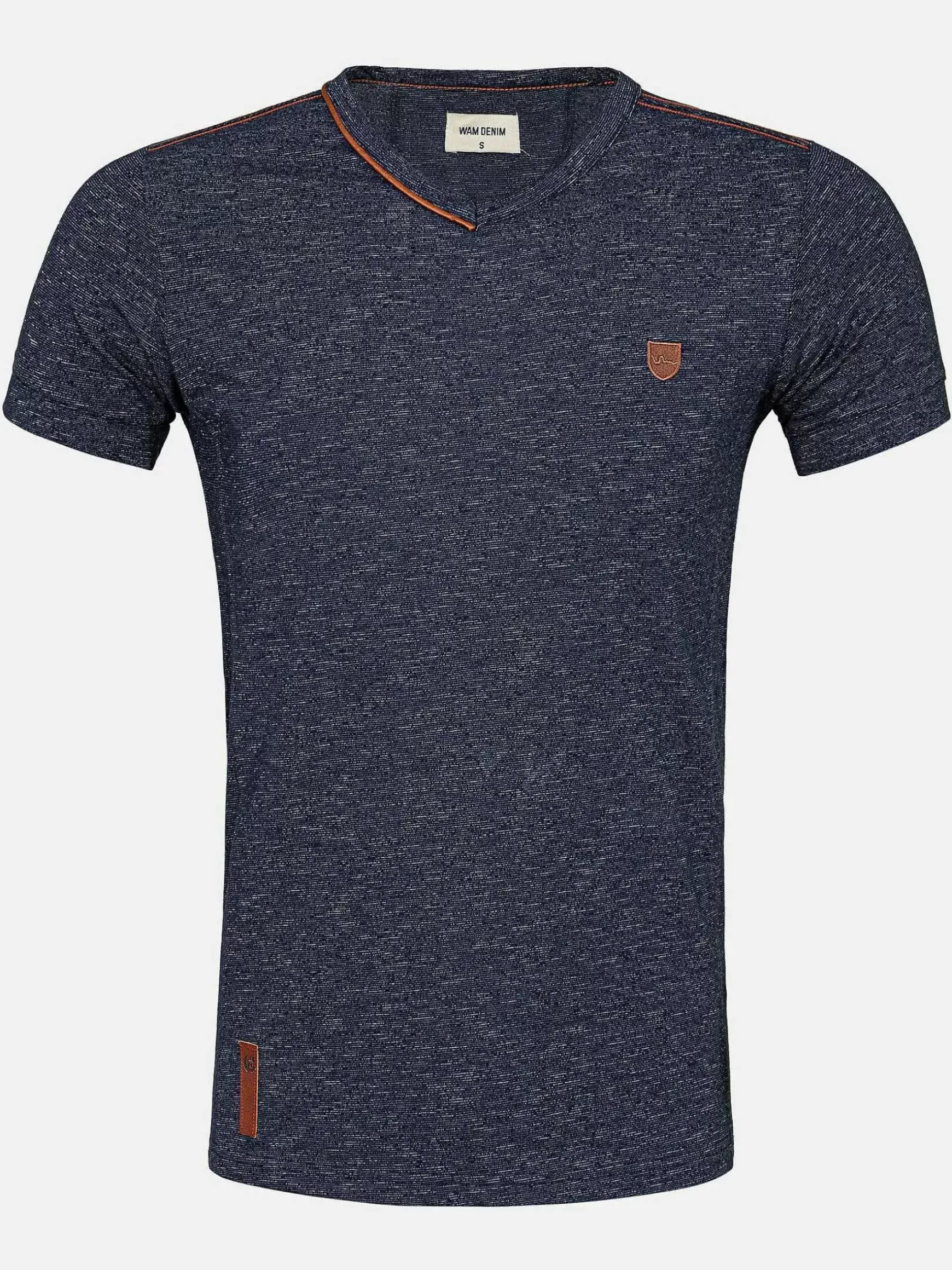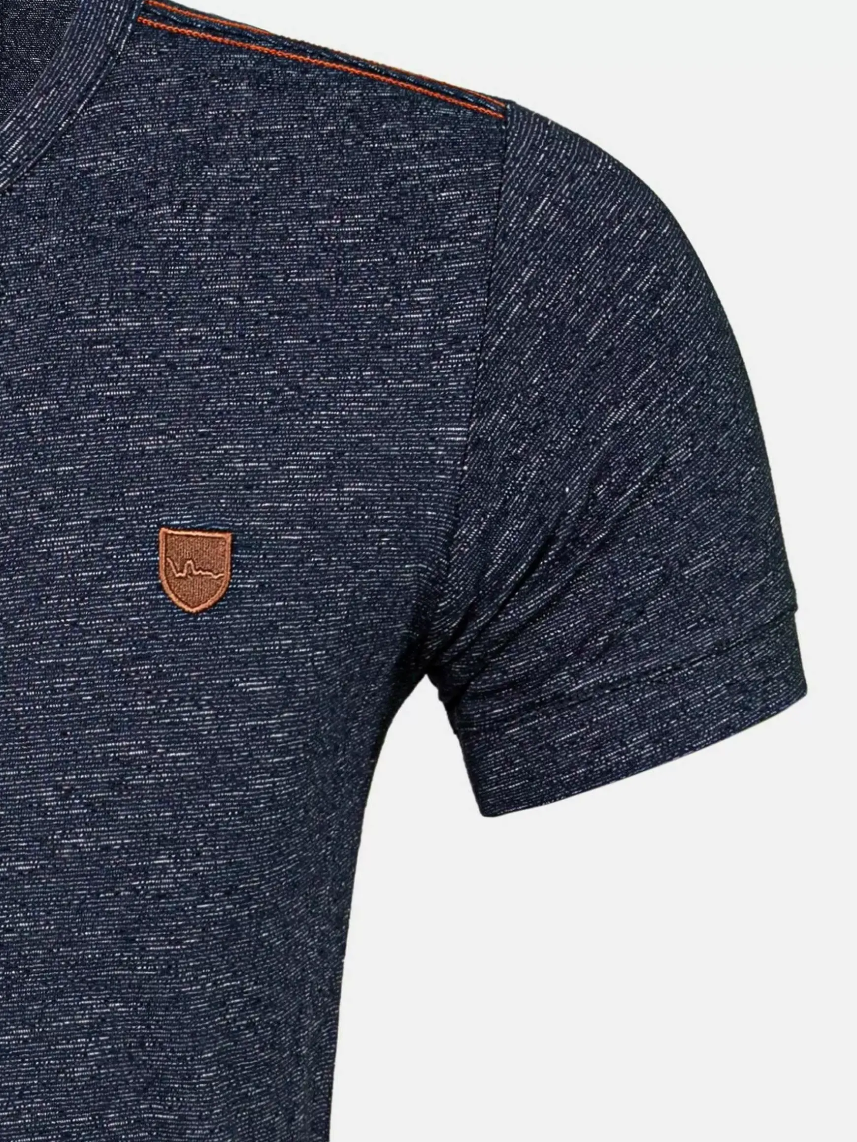 Een Marineblauwe T-Shirt Met V-Hals. Past Goed Op Een Jeans Of Korte Broek. Er Zit Een Embleem Gestikt Op De Voorzijde En In De Hals Zijn Accenten Met Bruine Belijningen Toegepast. Dit Model Heeft Fraaie, Opzichtige Bruine Stiksels.