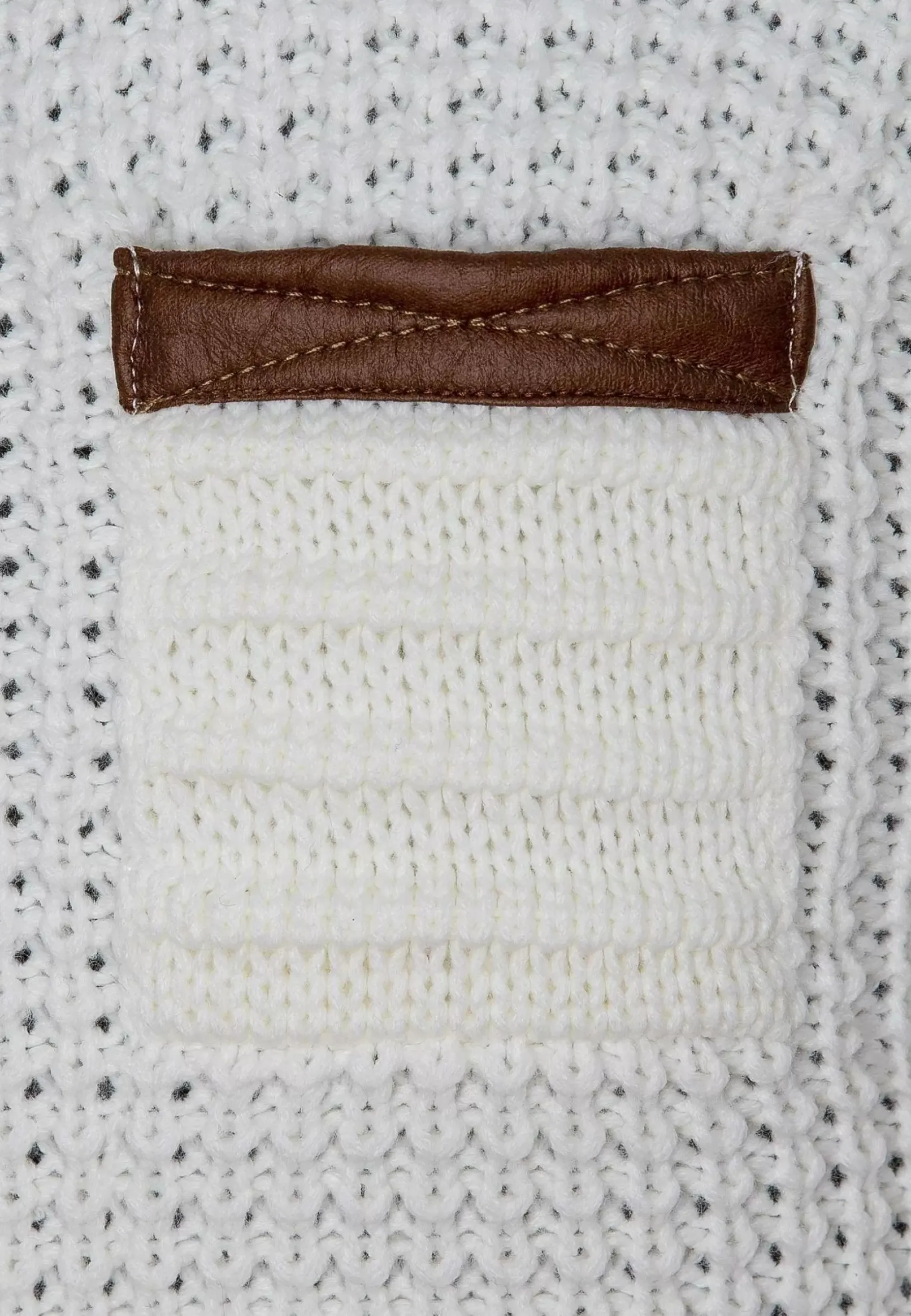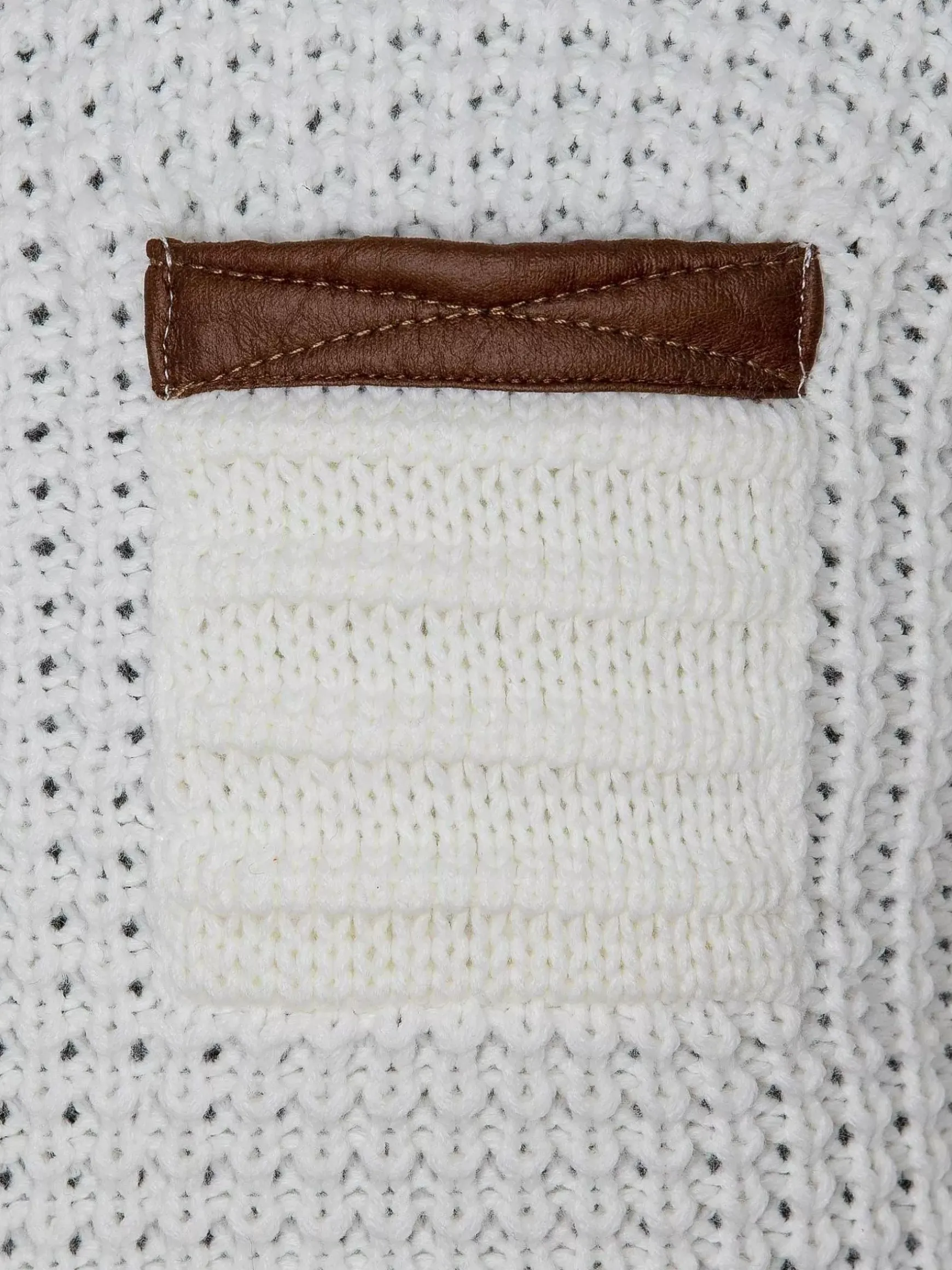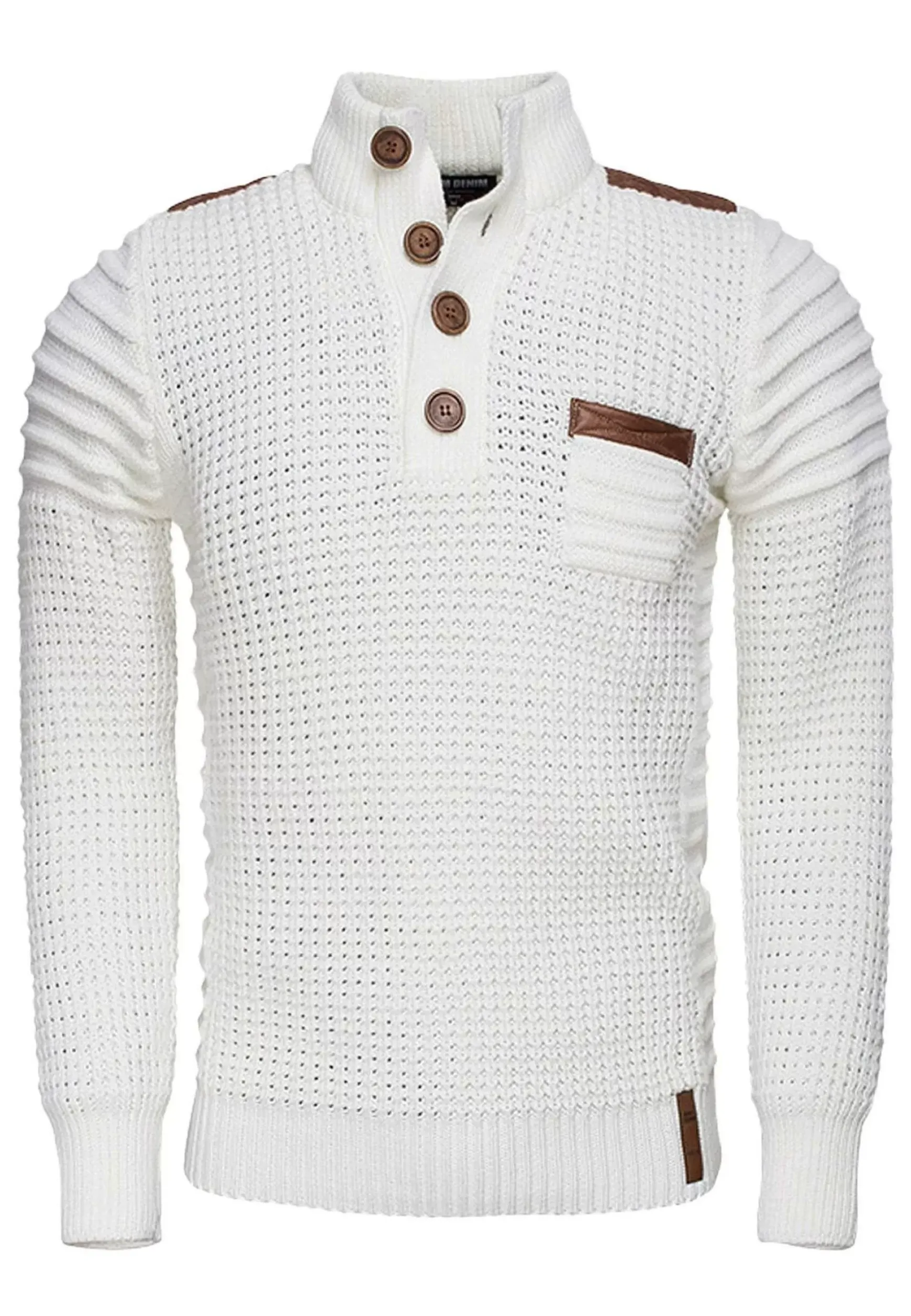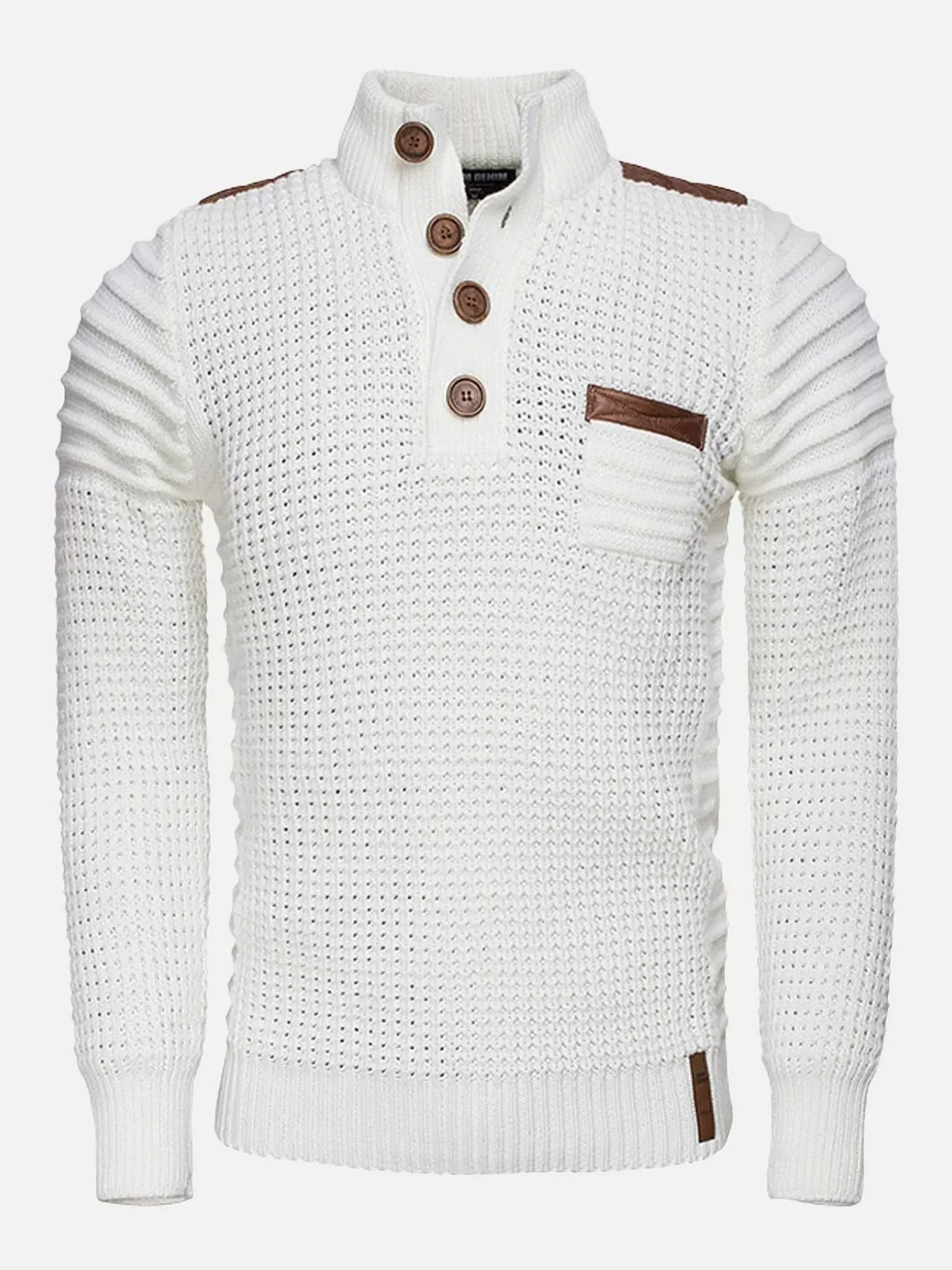 Licht Getailleerde Witte Trui Met Zakje Op De Linkerborst. Dit Model Heeft Een Knoopsluiting In De Hals Met Mooie, Grote Knopen In Licht- En Donkerbruin.