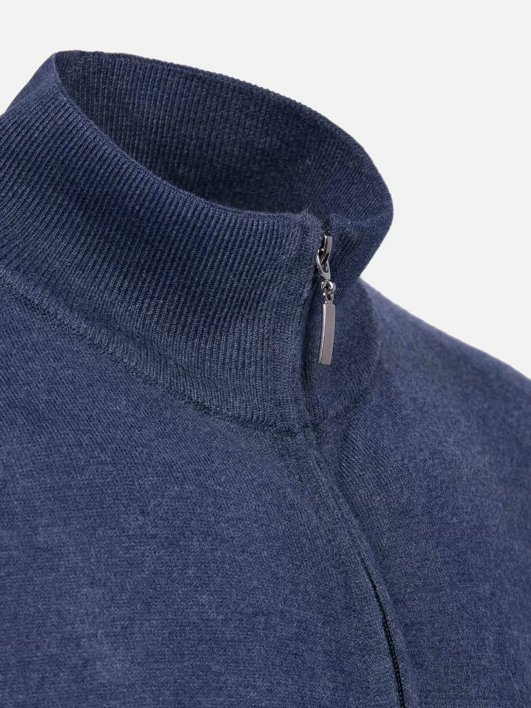 Navy Kleurige Trui Met Ritssluiting. De Trui Heeft Een Perfecte Pasvorm En Voelt Door De Stof Heel Zacht Aan. Door De Stretch Die In De Stof Is Verwerkt Sluit De Trui Onderaan Goed Af. Rechtsonder Is Een Subtiel, Zwart Embleem Gestikt.