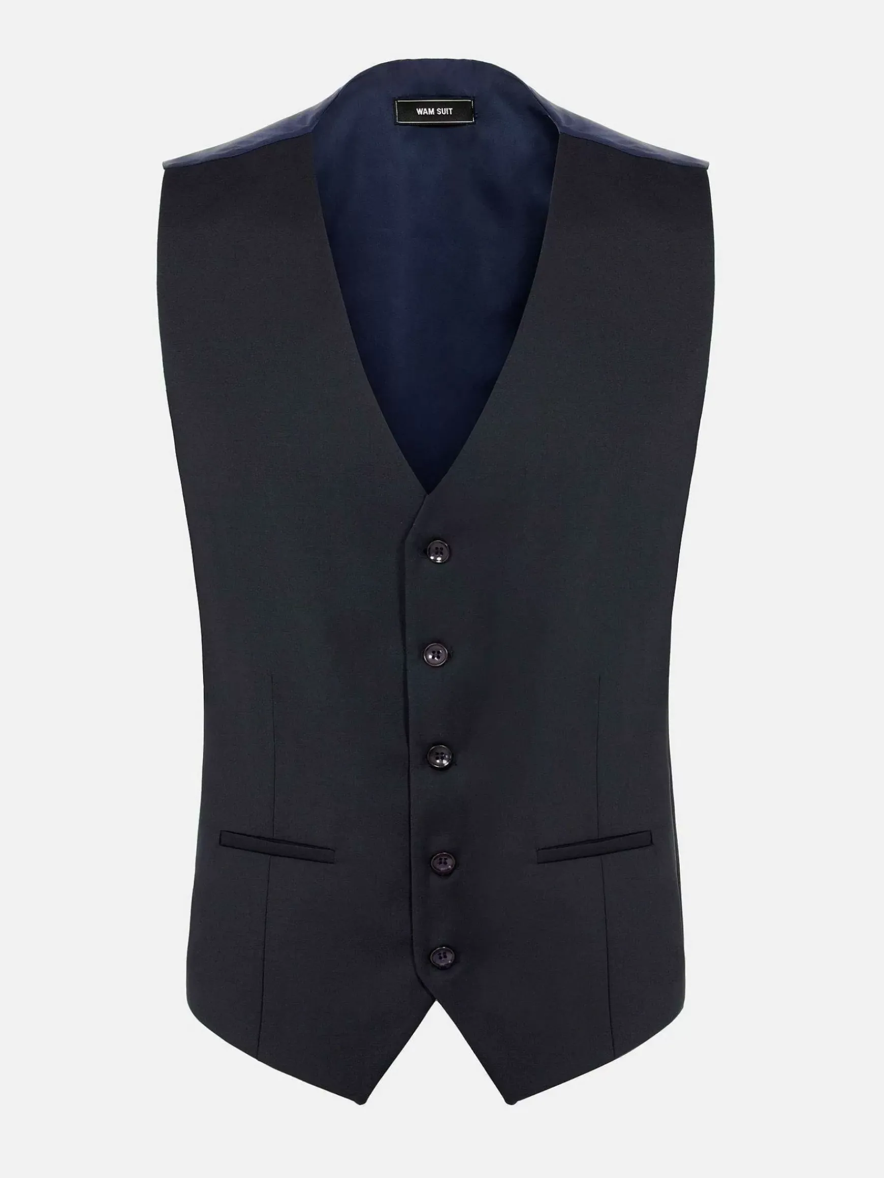 Vittorio Navy Vesten. De Jas Heeft Een Slanke Pasvorm, Een Rekbare Stof Voor Comfort, Twee Kleine Horlogezakken En Een Stijlvolle Sluiting Met Vijf Knopen. Verfraai Je Ensemble Met Tijdloze Elegantie.
