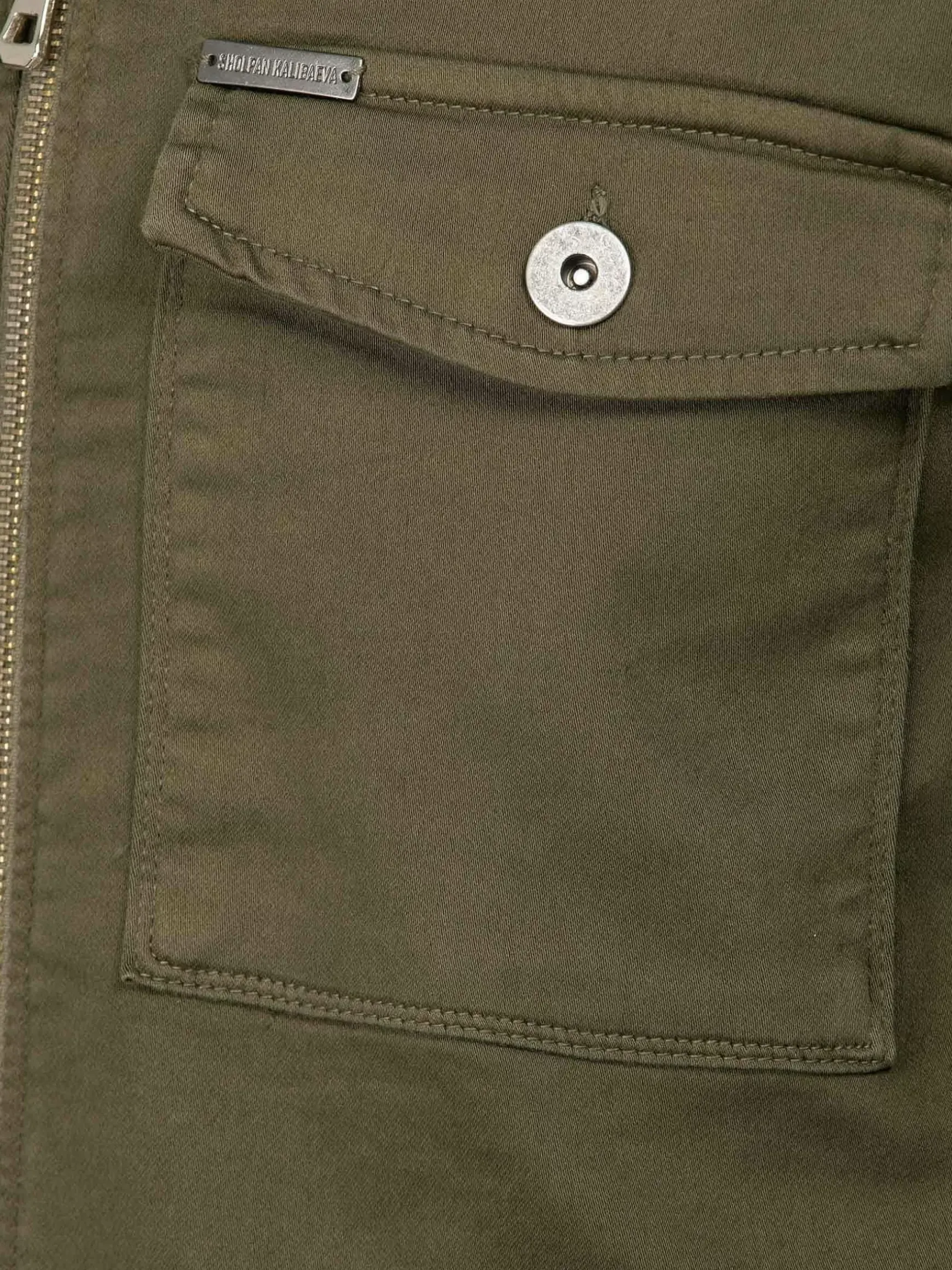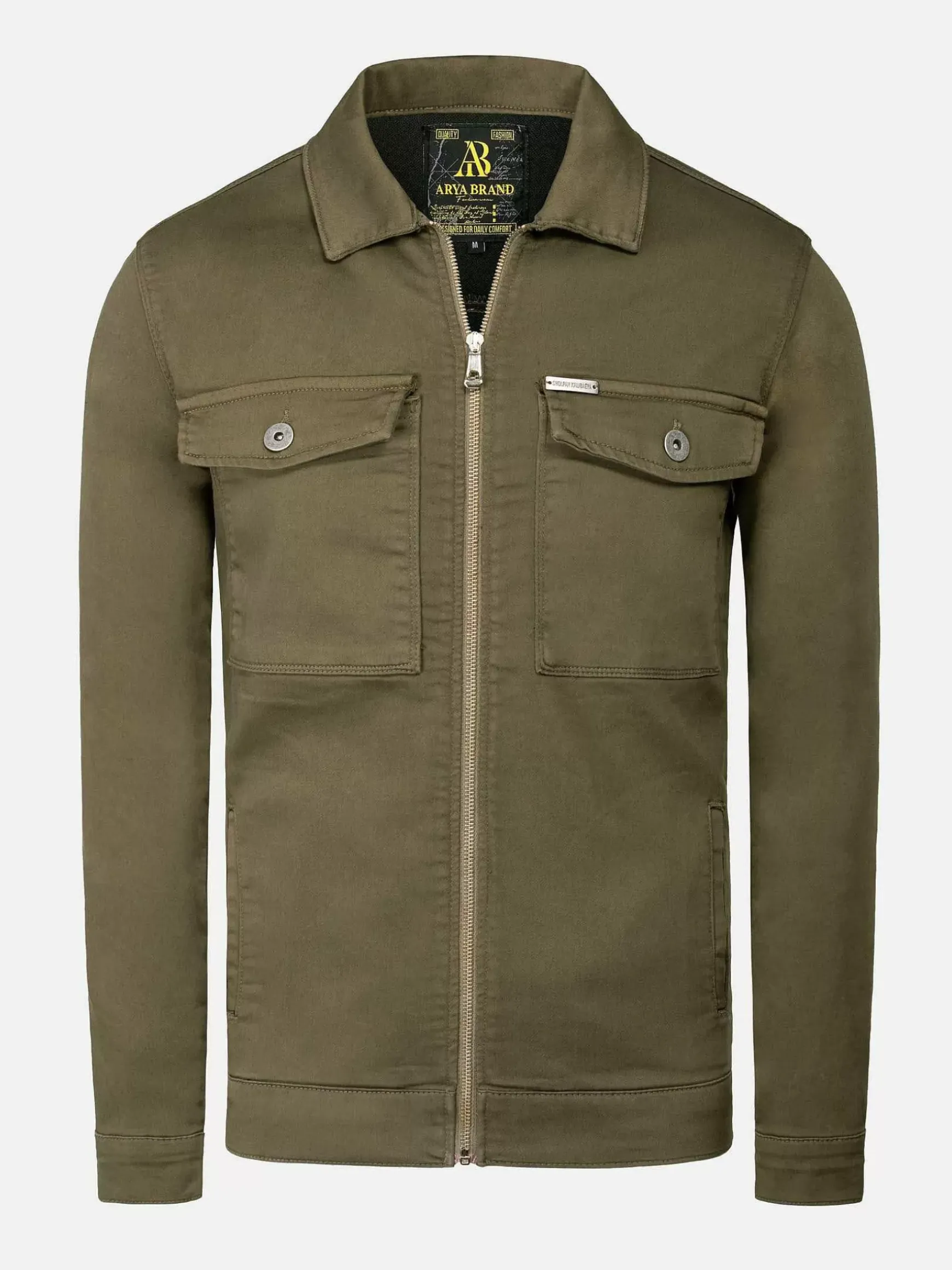 Khaki Jas Met Lange Mouwen En Ritsluiting. Dit Model Heeft Twee Zijzakken En Twee Borstzakken.