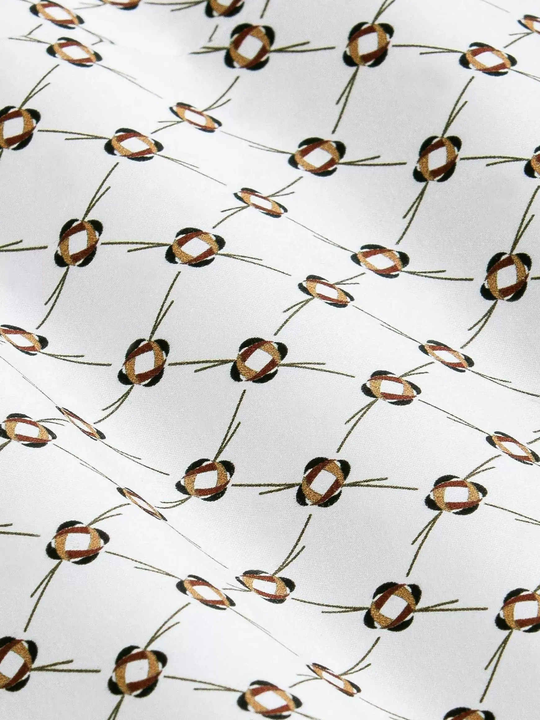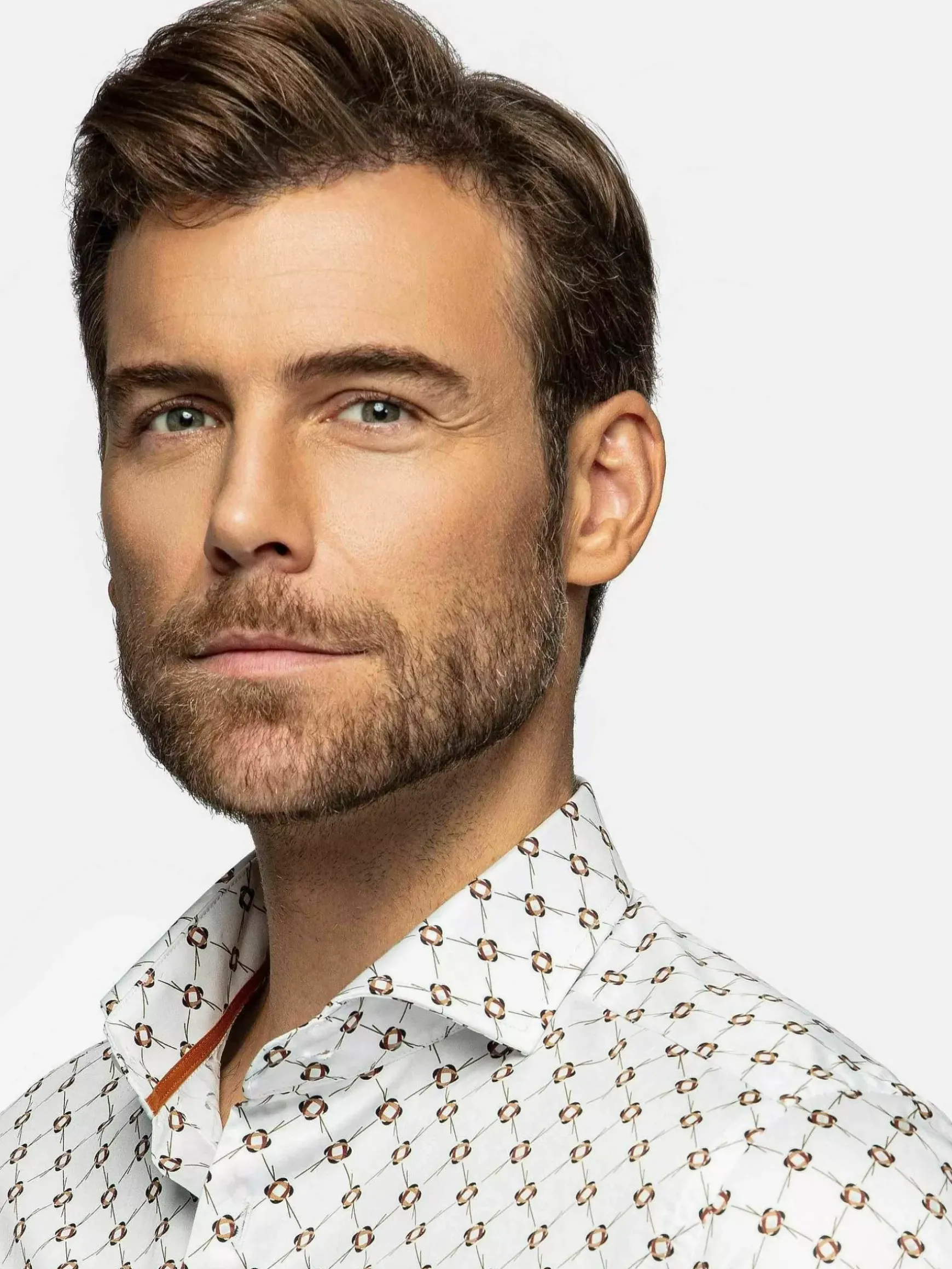Wit Overhemd Met Lange Mouwen. Het Overhemd Is Licht Getailleerd En Loopt Van Onderen Licht Rond Af. Dit Model Heeft Een Patroon Van Kleine Figuren In De Kleurencombinatie Zwart En Beige. Kan Zowel Op Een Pantalon Of Een Jeans Gedragen Worden.