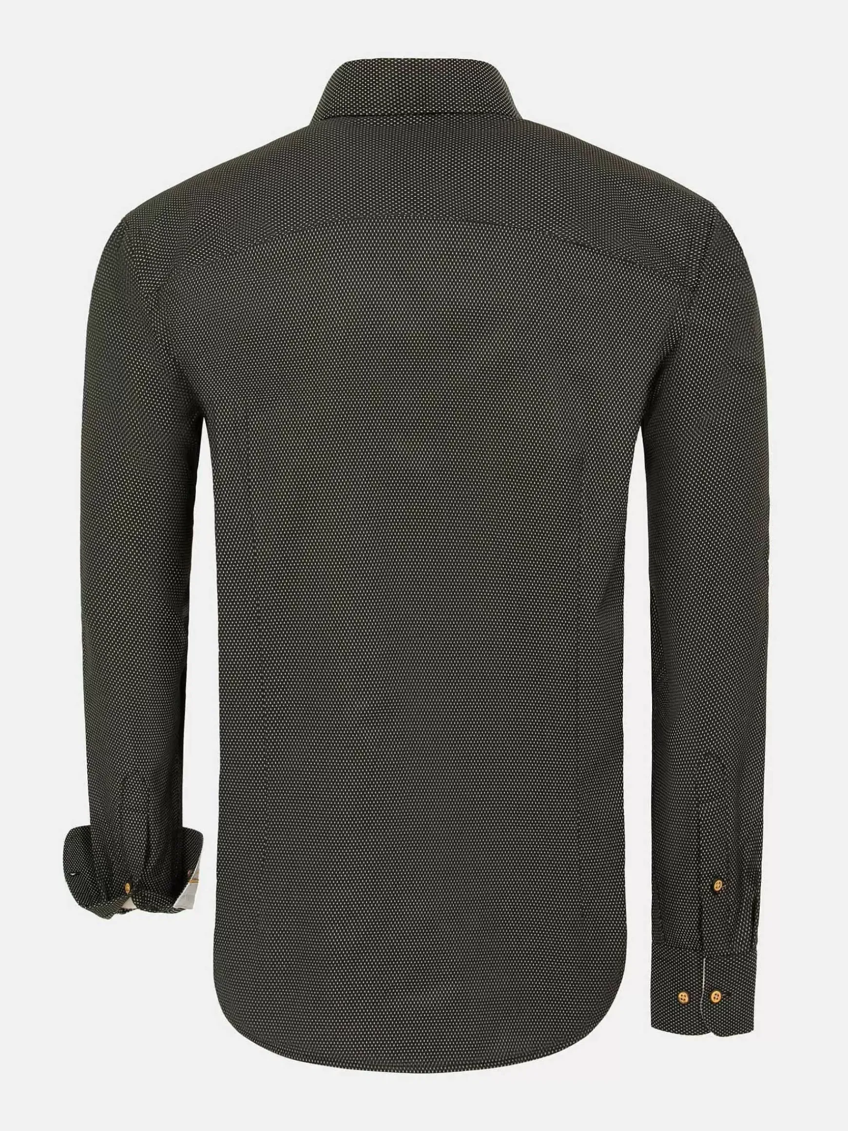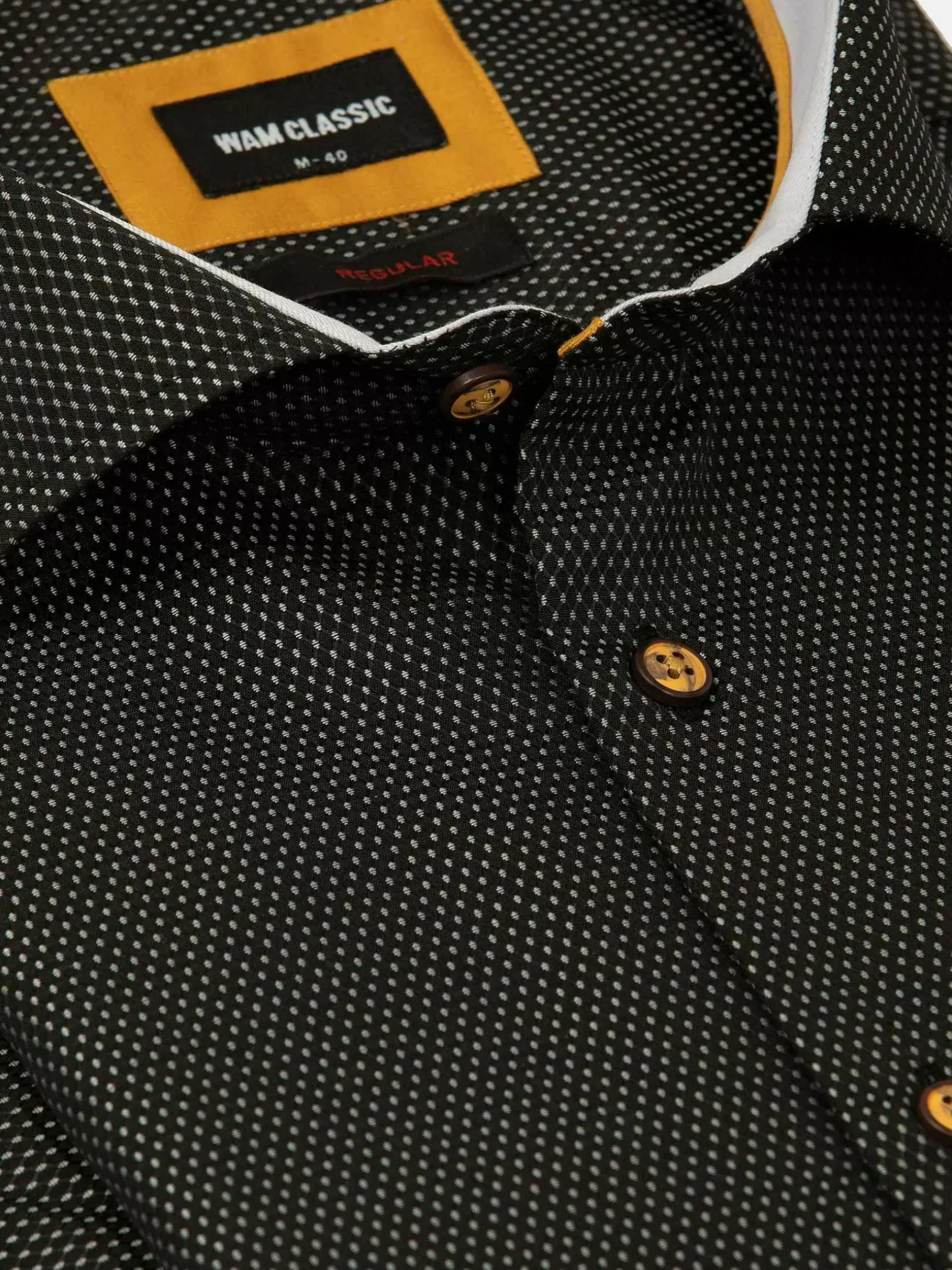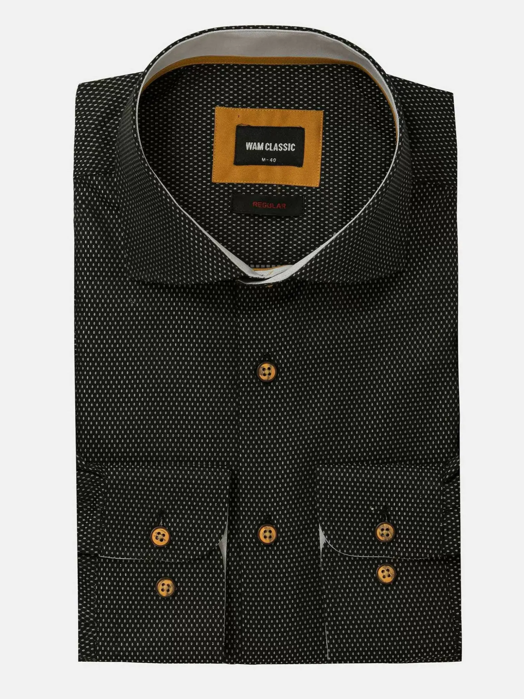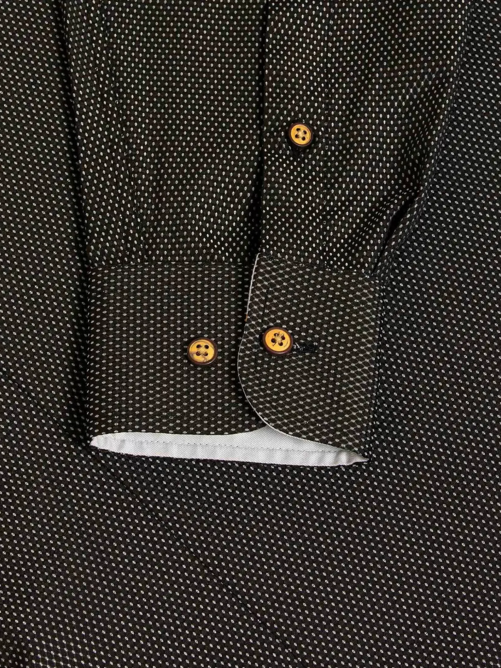 Bentley Regular Fit Black Overhemd: Een Combinatie Van Tijdloze Elegantie En Moderne Flair. Met Zijn Normale Pasvorm En Button-Down Kraag, Gemaakt Van Stretchstof Met Een Lichtgrijs Speldenkoppenpatroon Op Een Zwarte Achtergrond, Biedt Het Comfort En Stijl. Compleet Met Eenknoops Manchetsluiting En Lichtbruine Knopen Voor Een Subtiel Contrast. Perfect Voor De Veeleisende Heer Die Op Zoek Is Naar Verfijnde Veelzijdigheid.