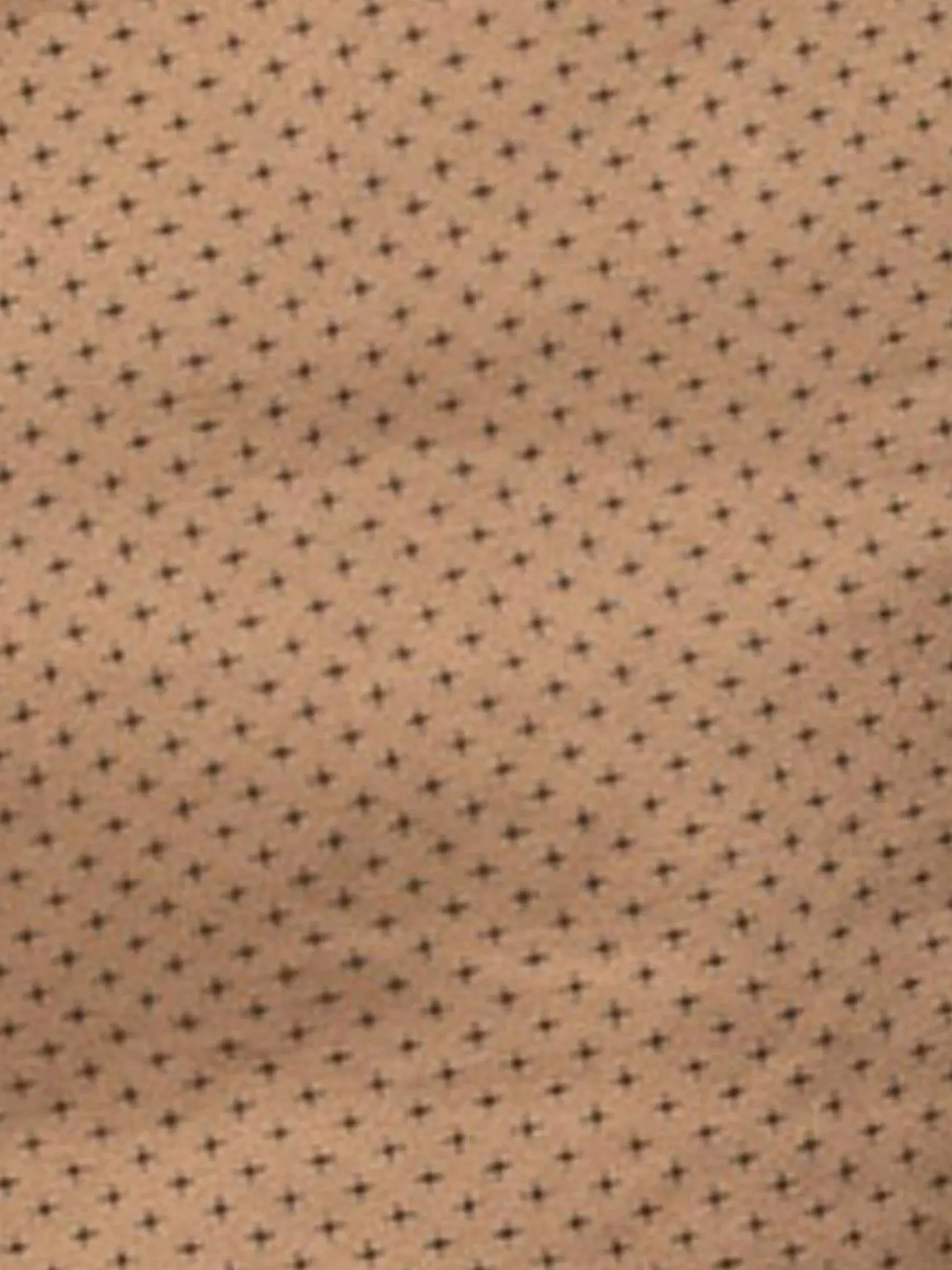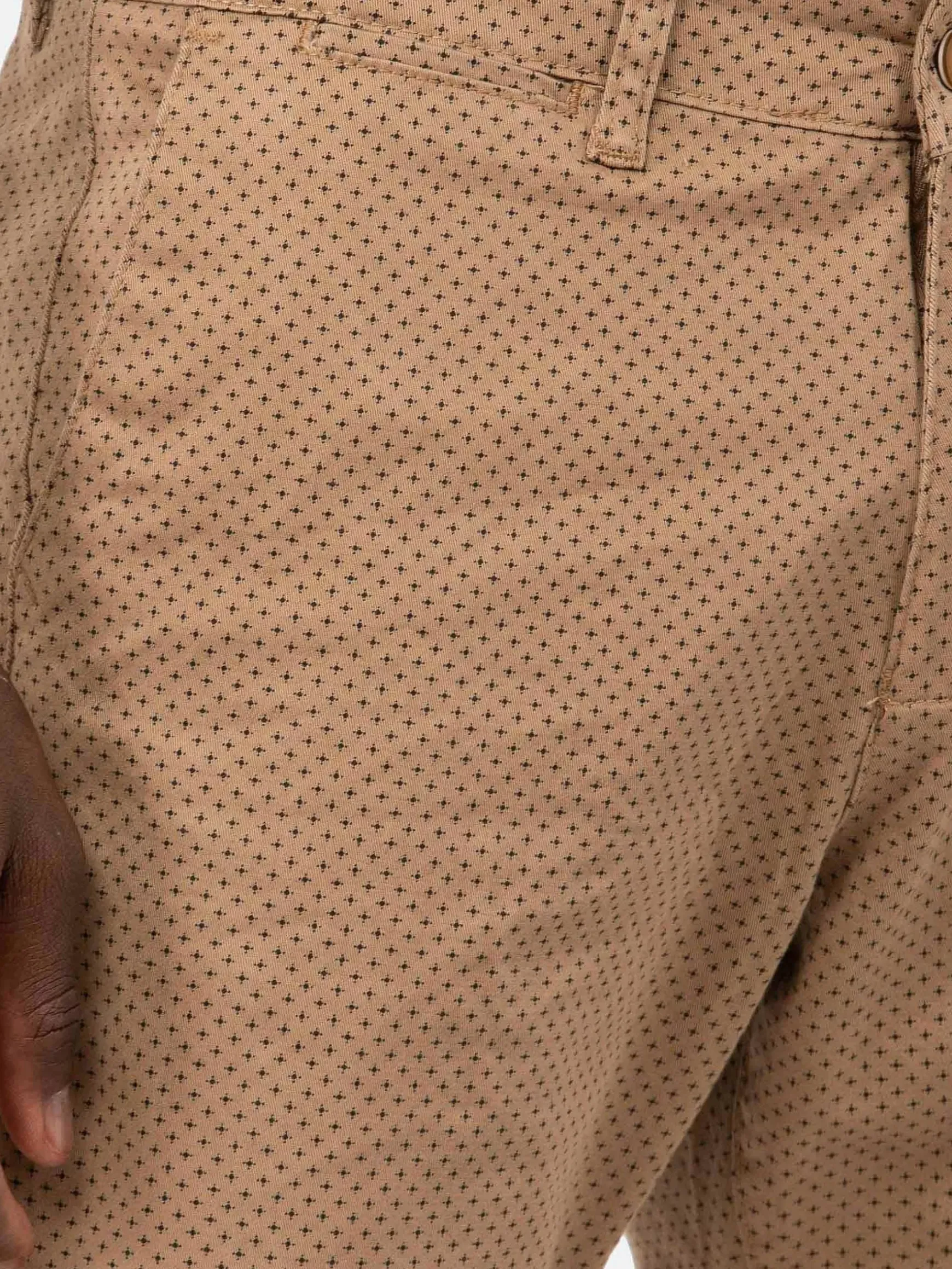 Beige Korte Broek Met Subtiel Figuratief Patroon. Dit Model Heeft Een Ritssluiting, Heeft Twee Achterzakken En Een Bruin Embleem Aan De Achterzijde.