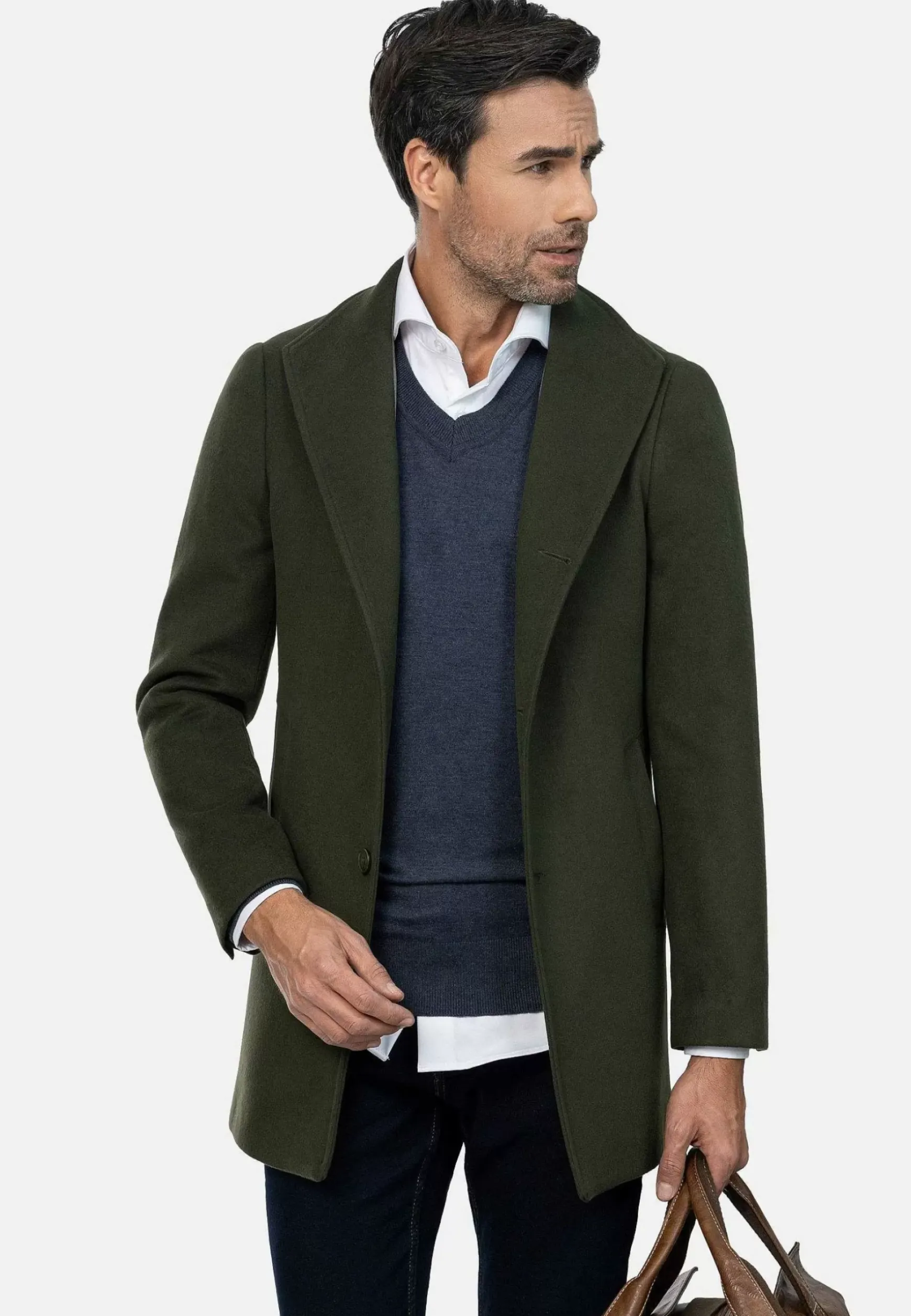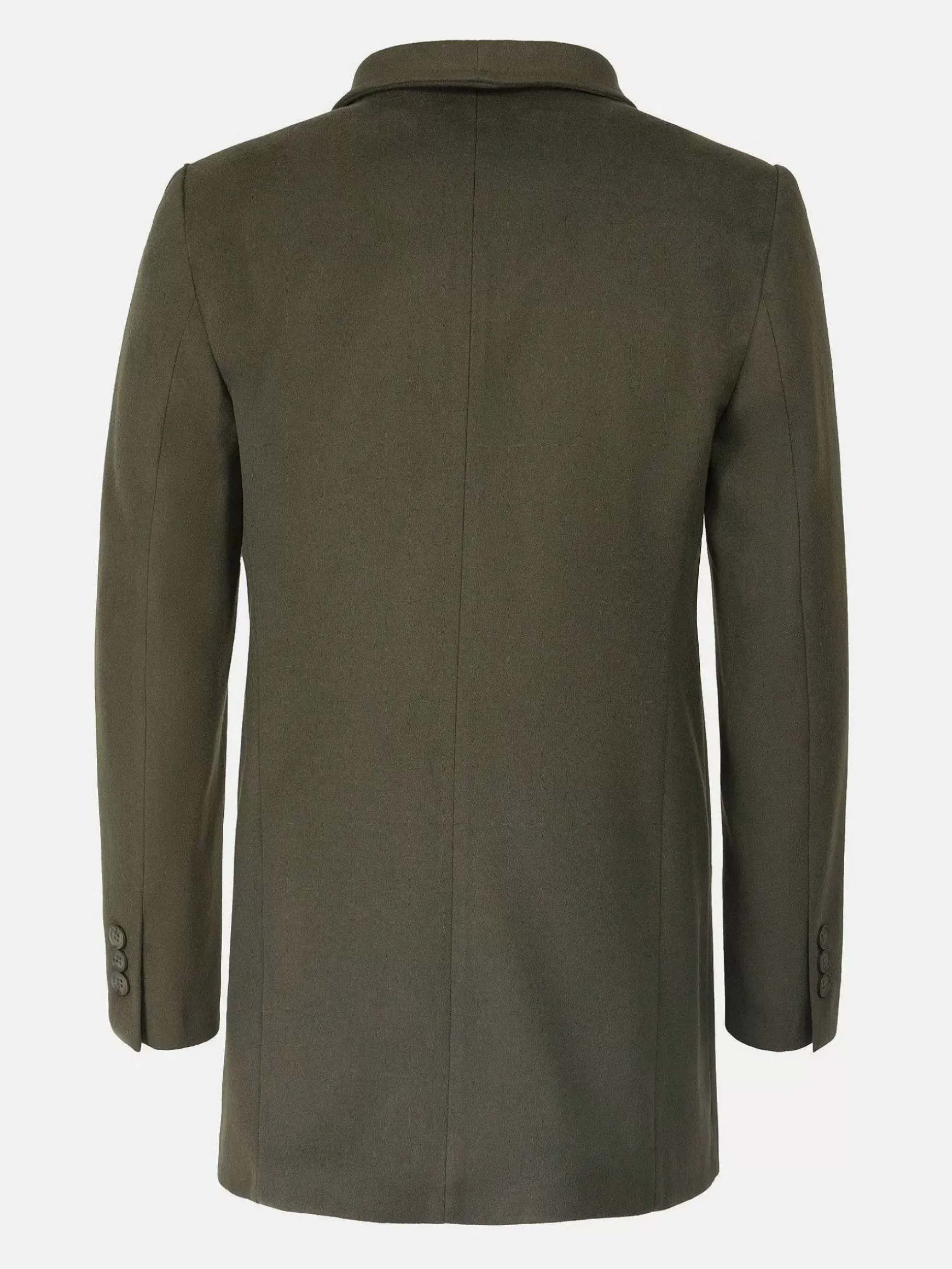 Khaki Kleurige, Stijlvolle Trenchcoat Met Opstaande Kraag. Deze Jas Heeft Twee Steekzakken, Een Knoopsluiting Met Drie Knopen En Is Afgewerkt Met Grijze Stiksels Voor Een Mooi Effect.