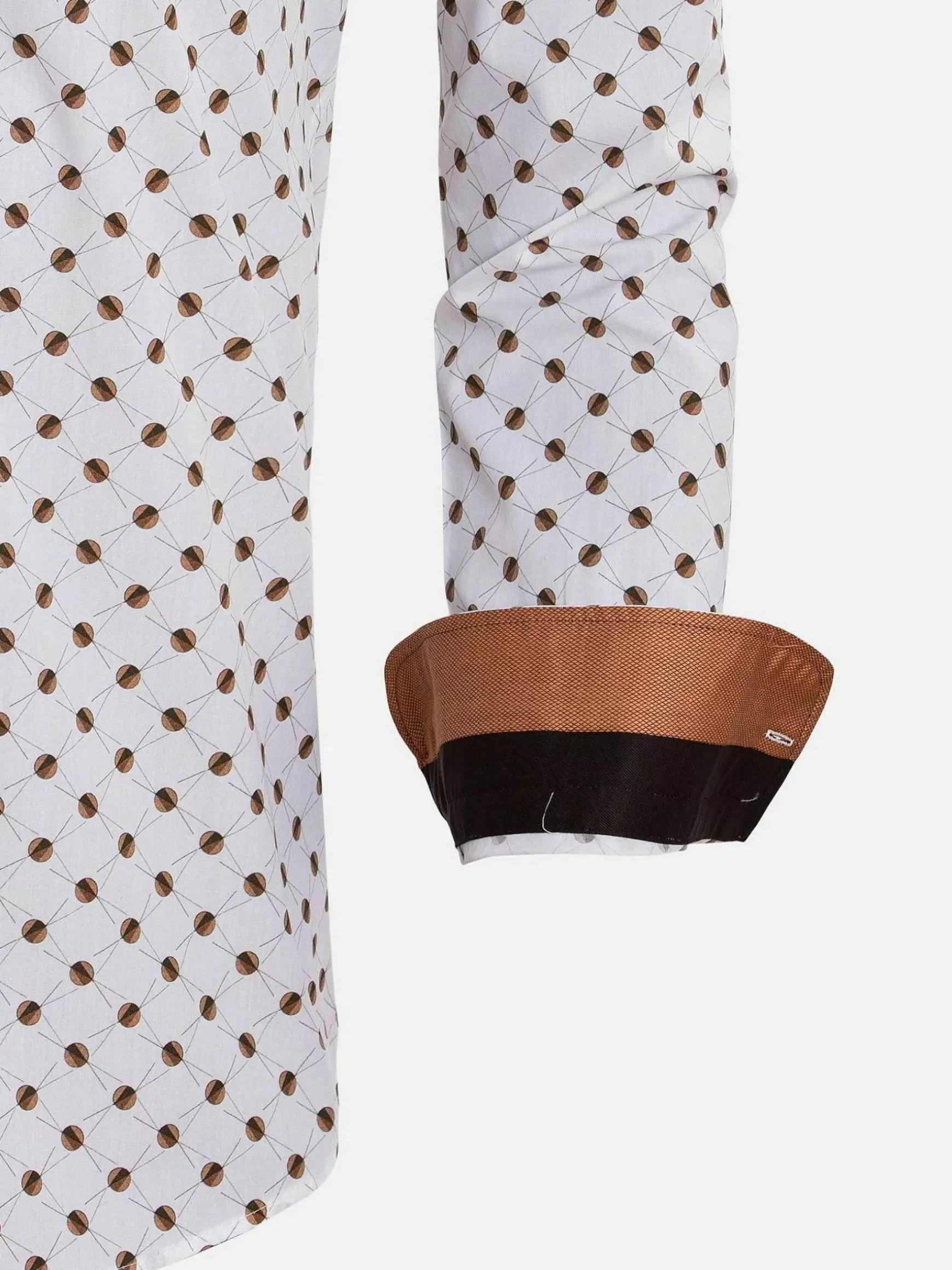 Wit Overhemd Met Een Ontwerp Van Bruine Stippen. Dit Model Heeft Lange Mouwen En Mooie Ronde Knopen. De Onderkant Van Dit Shirt Is Licht Afgerond. Door De Lichte Stretch In De Stof Is Hij Zeer Comfortabel Om Te Dragen.