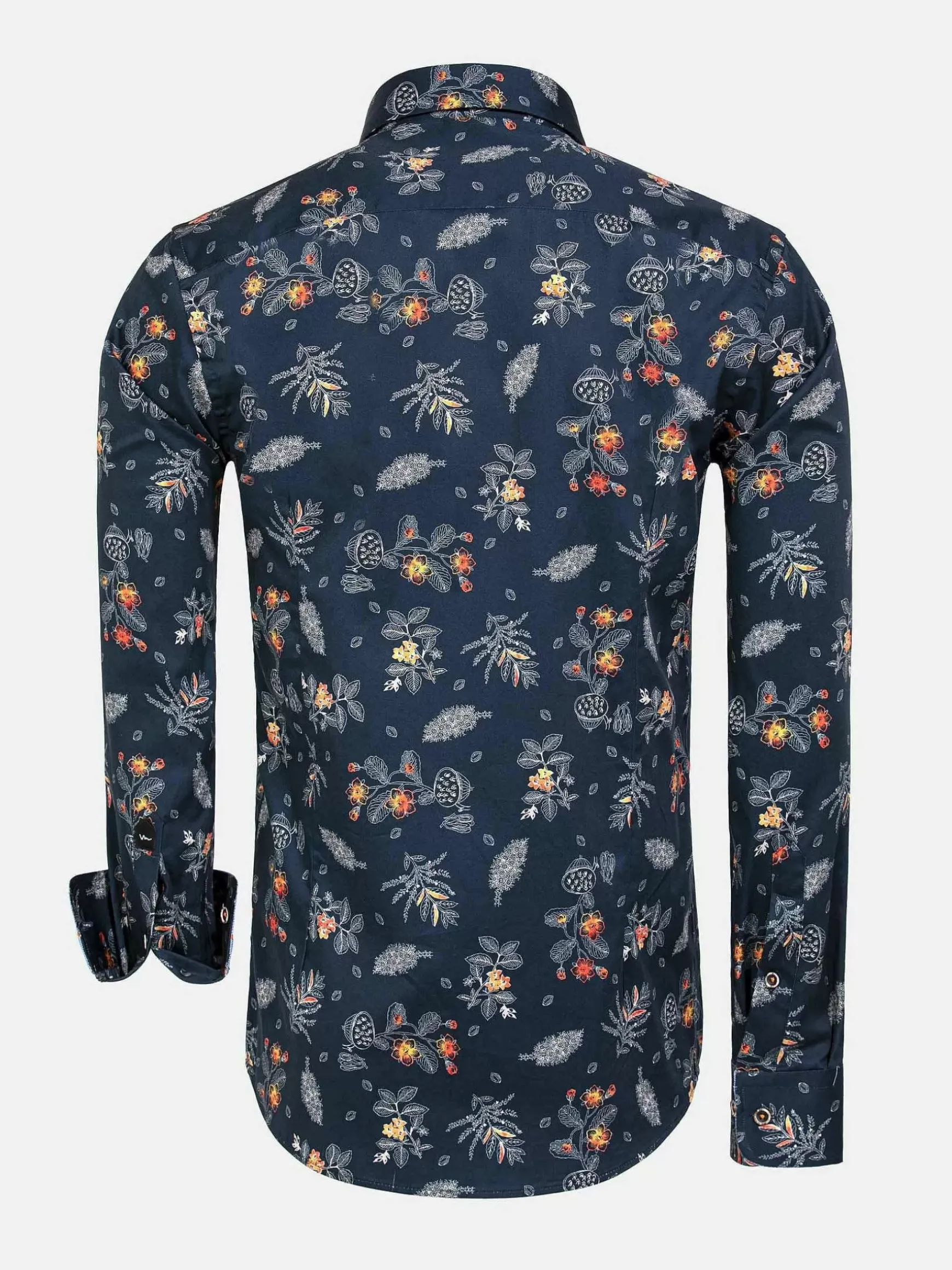 Een Origineel Overhemd, Donkerblauw Van Kleur. Dit Getailleerde Overhemd Heeft Een Blad- En Bloemenprint En Lichtblauwe Manchetten. Het Overhemd Is Op Een Mooie Pantalon Of Jeans Een Ware Eyecatcher.
