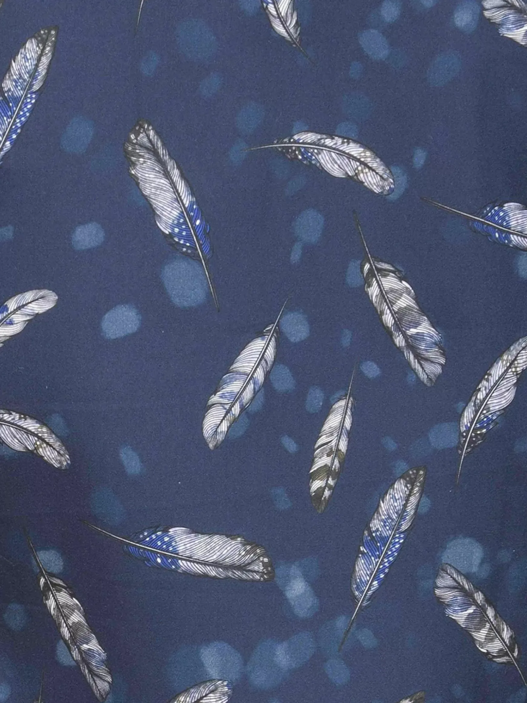 Navy Kleurig Overhemd Met Een Print Van Veren In De Kleuren Zwart, Wit, Grijs En Donkerblauw. De Knopen Zijn Wit En Lichtbruin Van Kleur En De Onderkant Loopt Iets Rond Af.