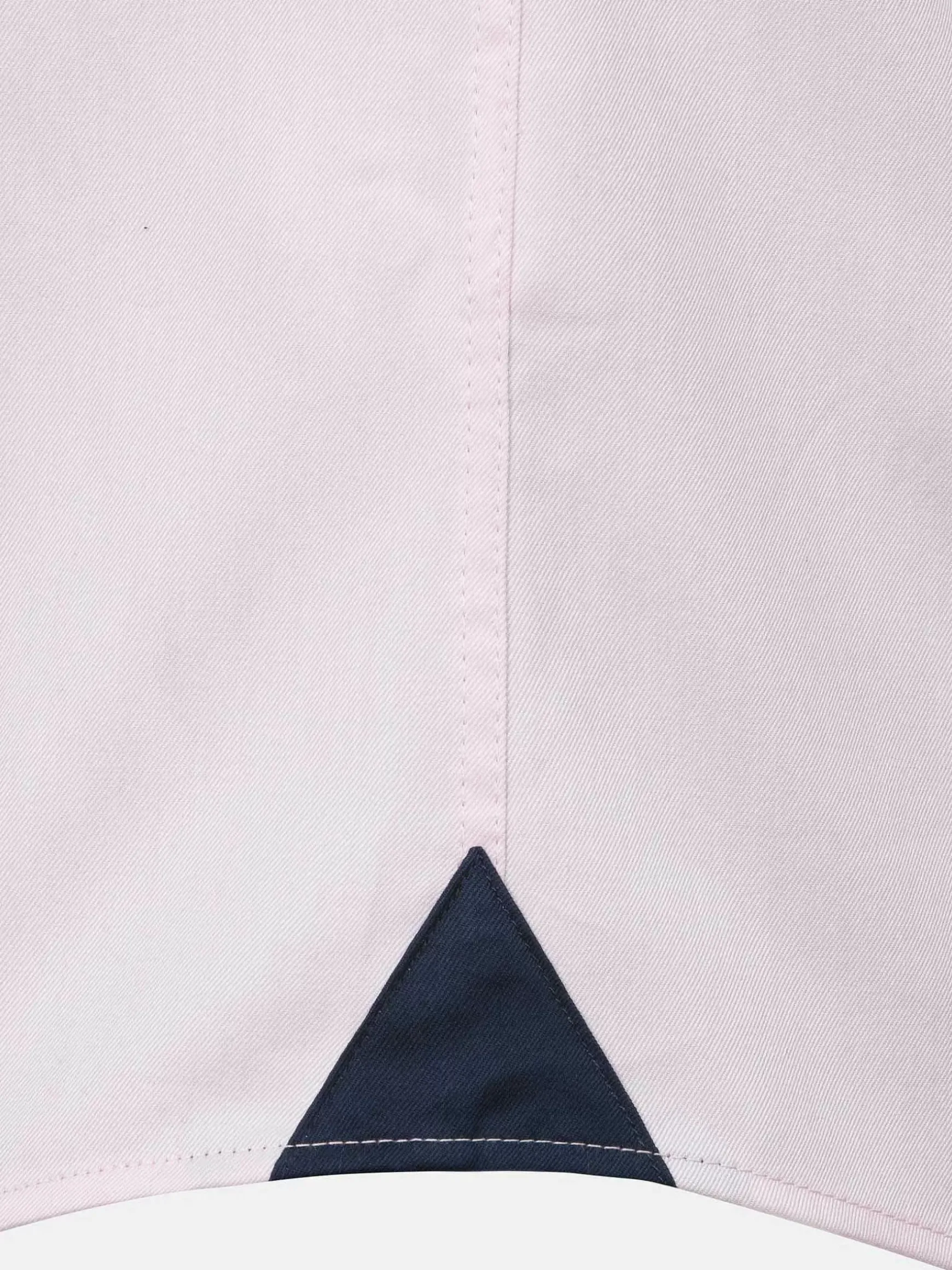 Getailleerd Roze Overhemd Met Lange Mouwen. Opvallend Mooi Detail Is De Donkerblauwe Belijning Langs De Knoopsluiting En Aan De Binnenkant Van De Kraag. Het Overhemd Heeft Onderaan Subtiele Gestikte Elementen, Ook Donkerblauw Van Kleur.