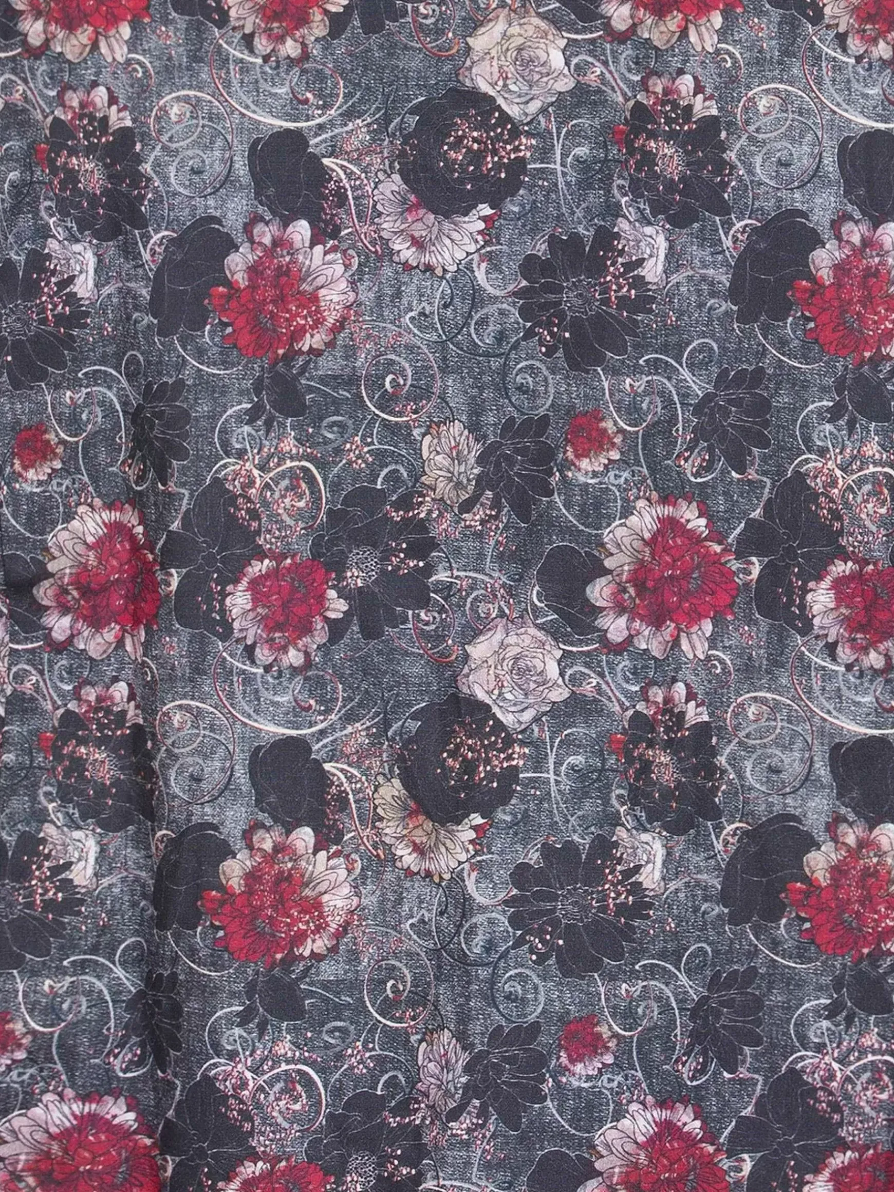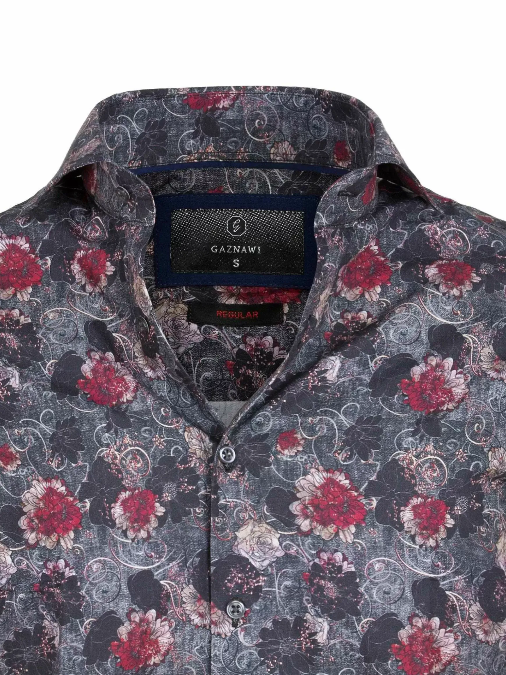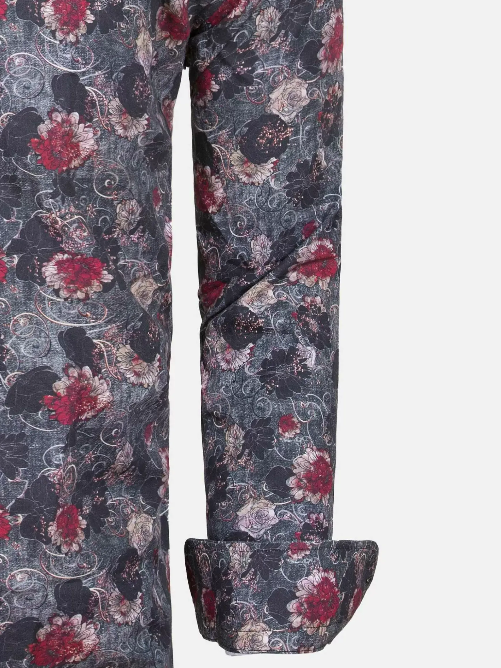 Antraciet En Grijs Kleurig Overhemd. De Bordeauxrode Bloemen Springen Er Mooi Uit Op De Donkere Ondergrond. Het Overhemd Kan Formeel Gedragen Worden, Maar Past Ook Goed Op Een Effen Jeans.
