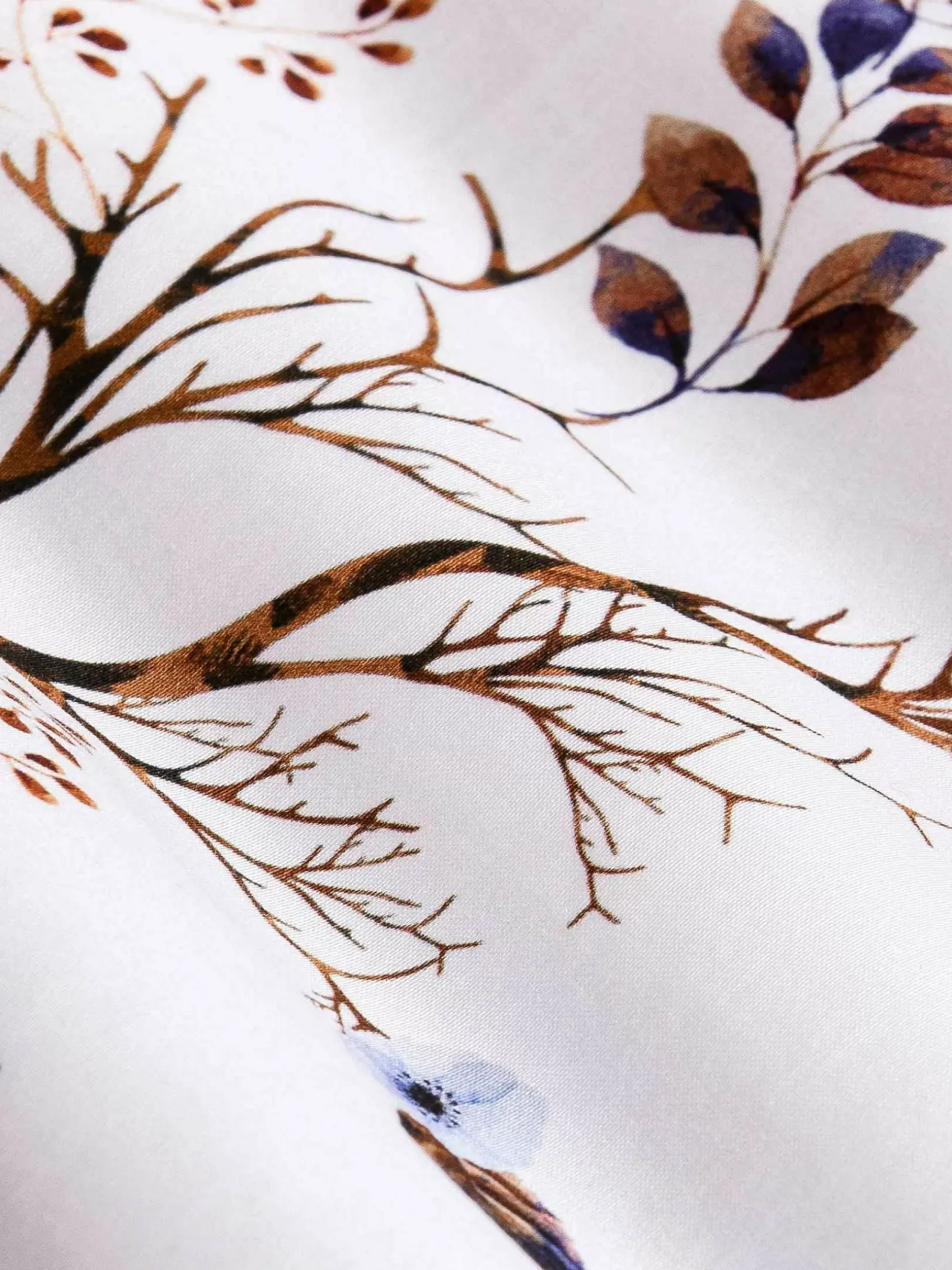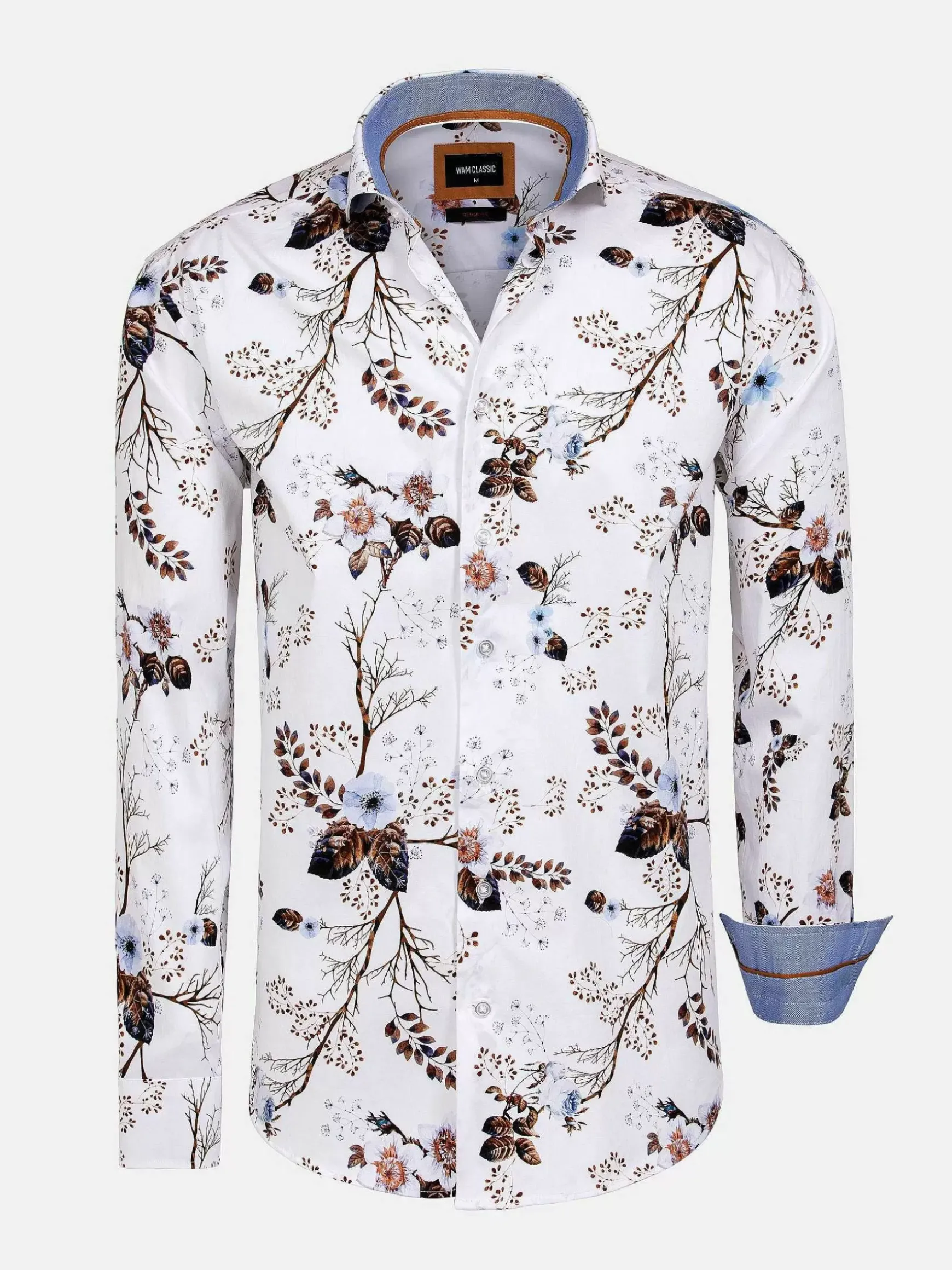 Prachtig Wit Overhemd Met Een Patroon Van Kleurige Bloemen. Het Overhemd Heeft Daardoor Een Artistieke Uitstraling. Staat Mooi Op Een Effen Jeans Of Chino, Eventueel Met Een Bijpassend Colbert. Het Overhemd Loopt Van Ondereren Licht Rond Af.