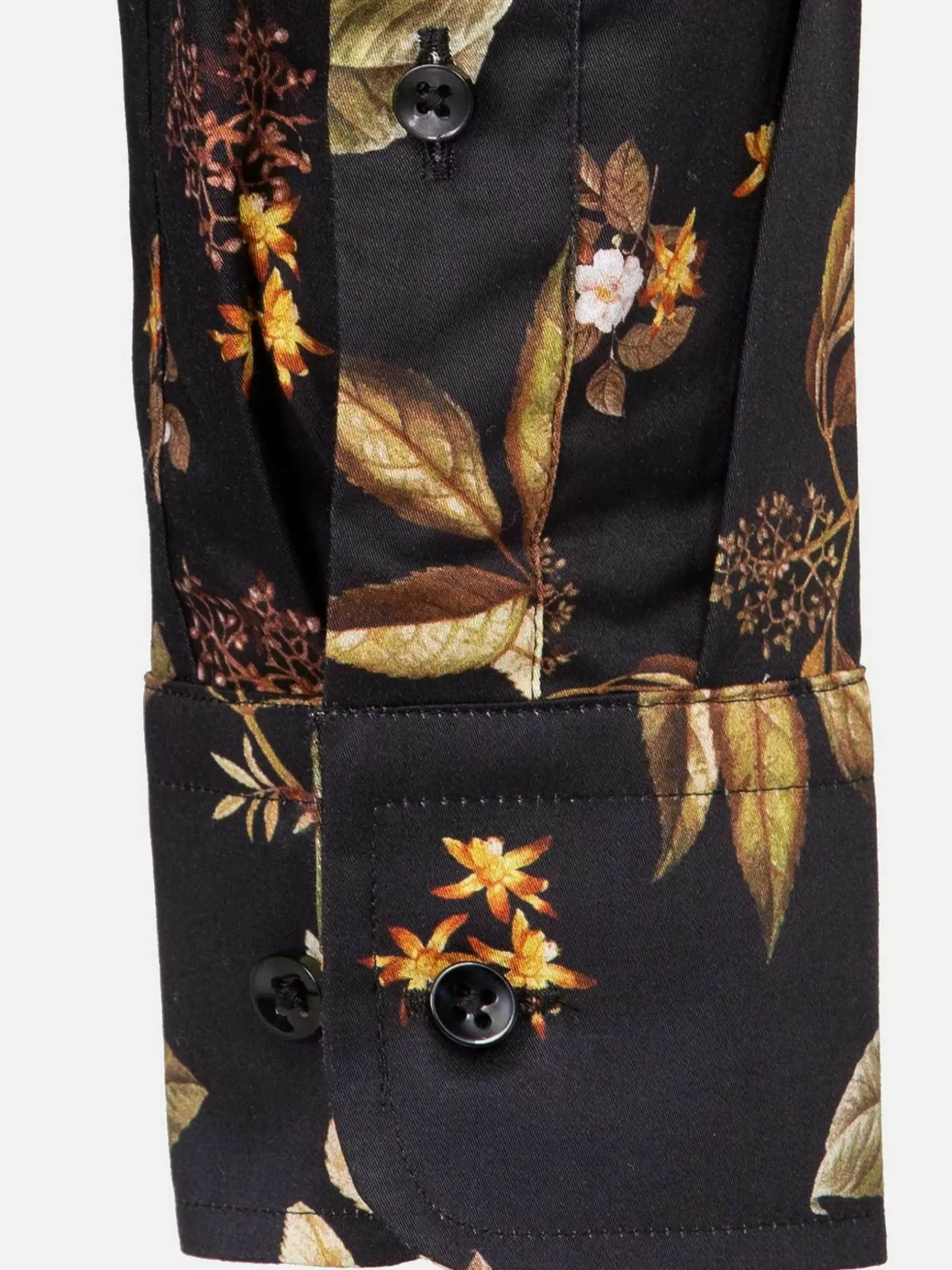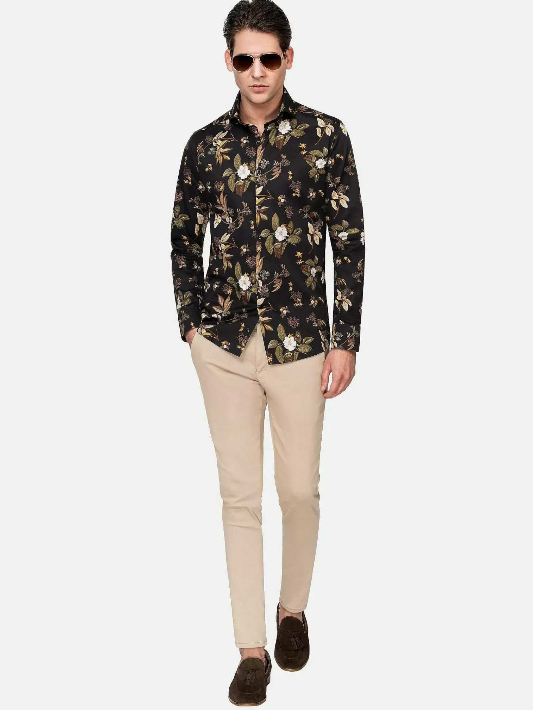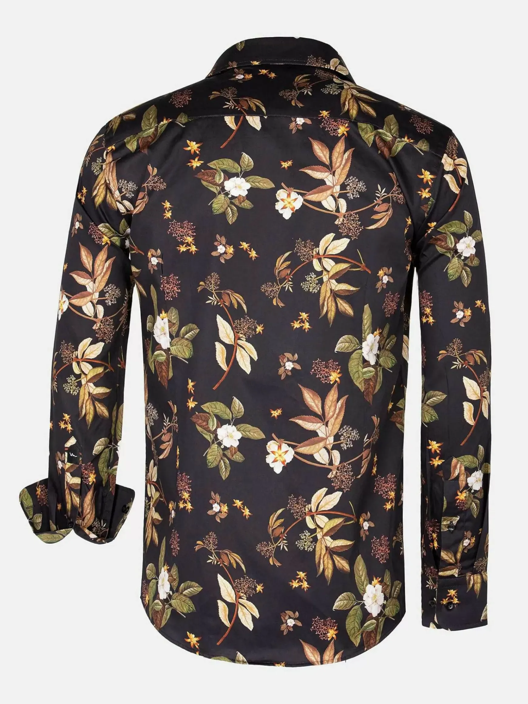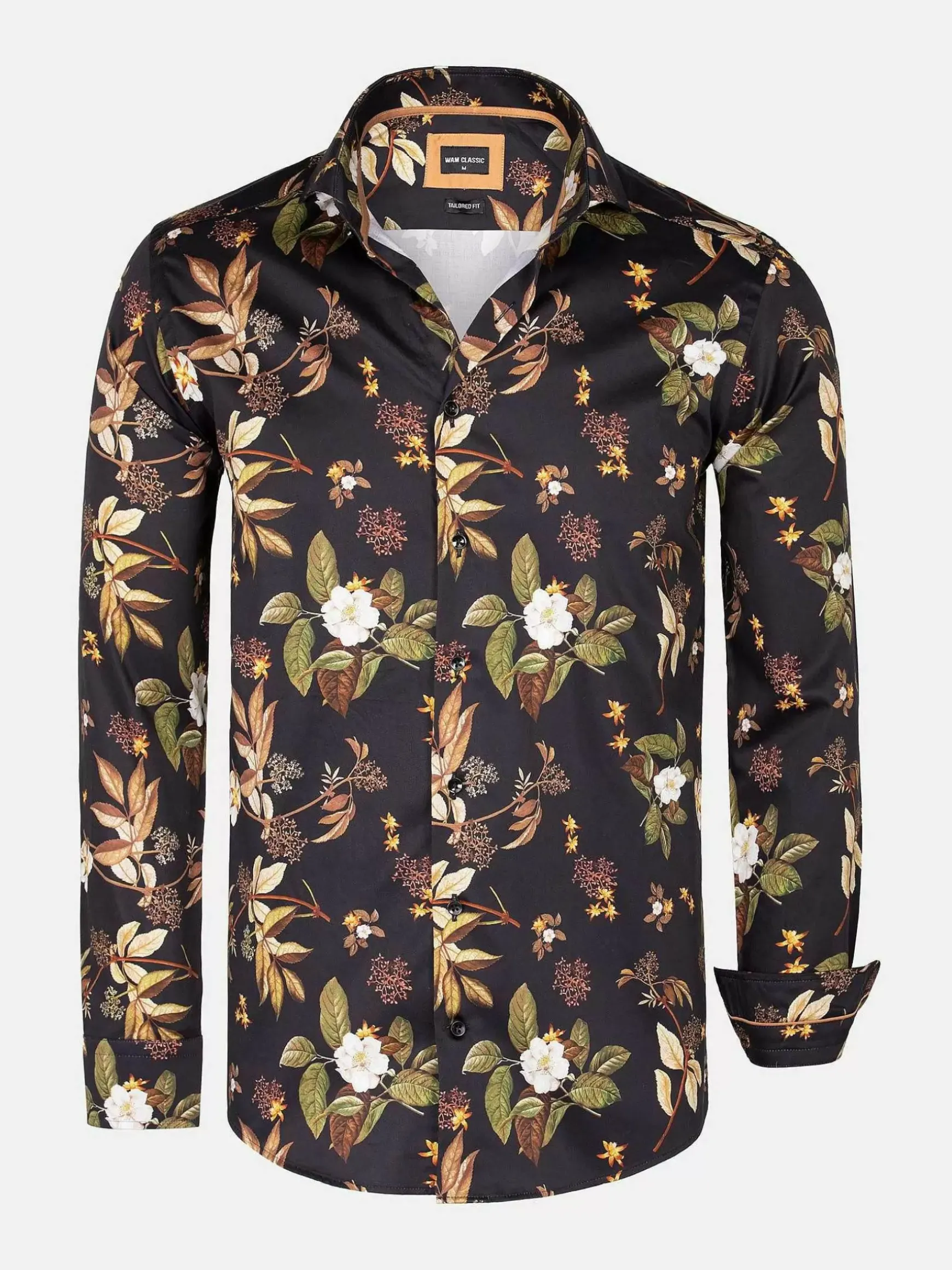 Zwart Getailleerd Overhemd Met Uniek Bloemenpatroon. Dit Patroon In De Kleuren Khaki, Bruin En Wit Maken Dit Ontwerp Bijzonder. Dit Veelzijdige Overhemd Is In Verschillende Combinaties Te Dragen. Zowel Voor Een Nette Look Met Een Pantalon, Als Een Wat Losse Look Met Een Jeans.