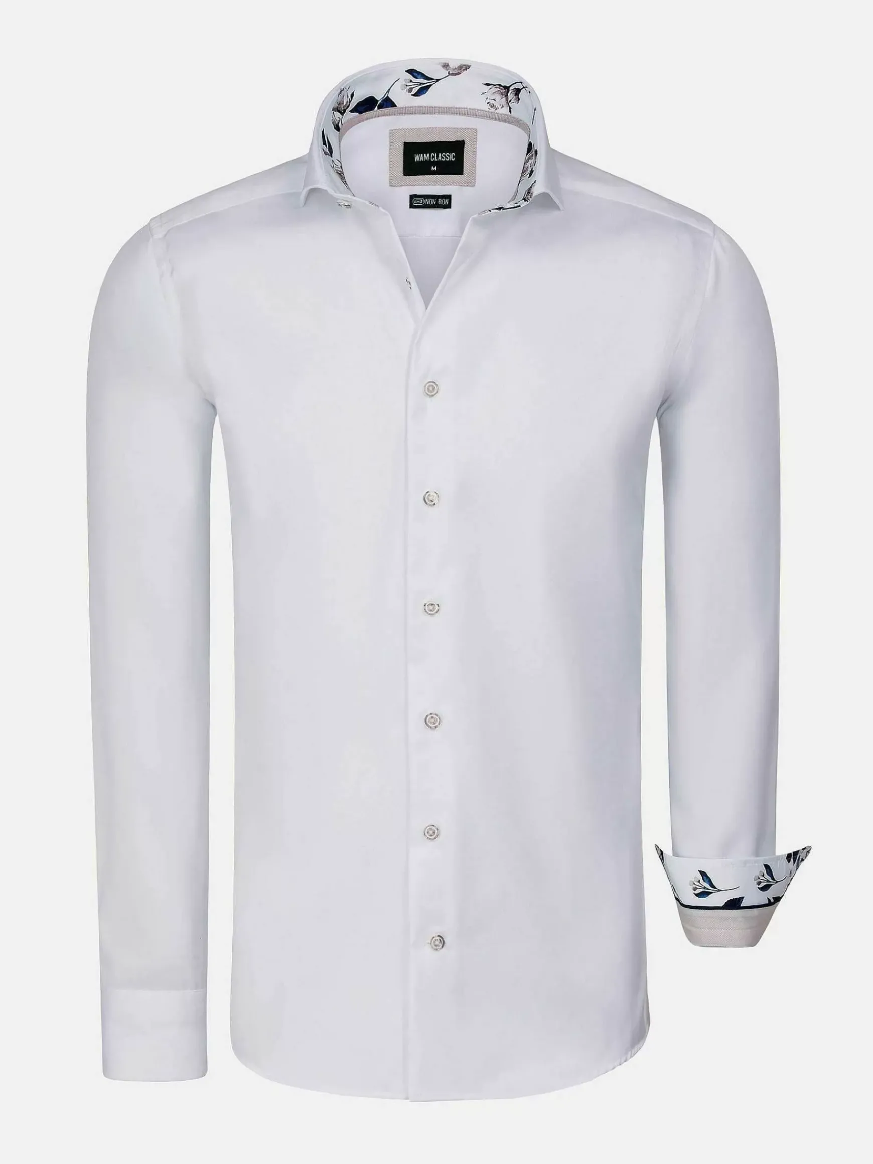 Wit Overhemd Met Knoopsluiting. Dit Stijlvolle Model Is Afgewerkt Met Een Kleurrijke Bloemenprint Aan De Binnenkant Van De Kraag En De Manchetten. Dit Is Een Strijkvrij Overhemd. Staat Leuk Bij Een Pantalon Voor Een Zakelijke Look Of Bij Een Jeans Voor Een Meer Casual Outfit