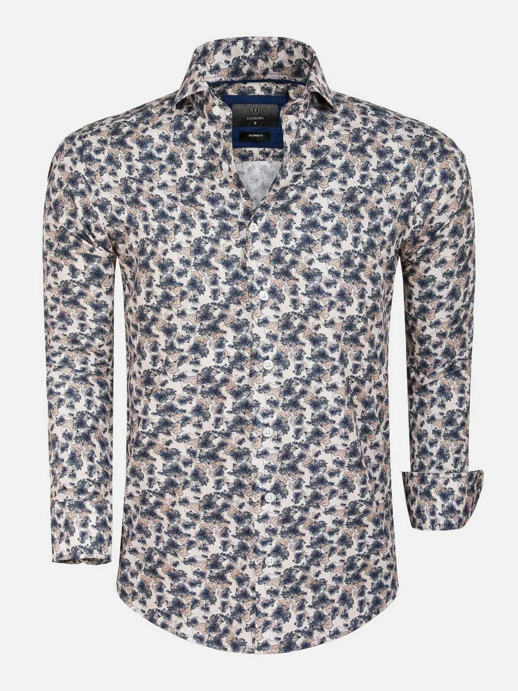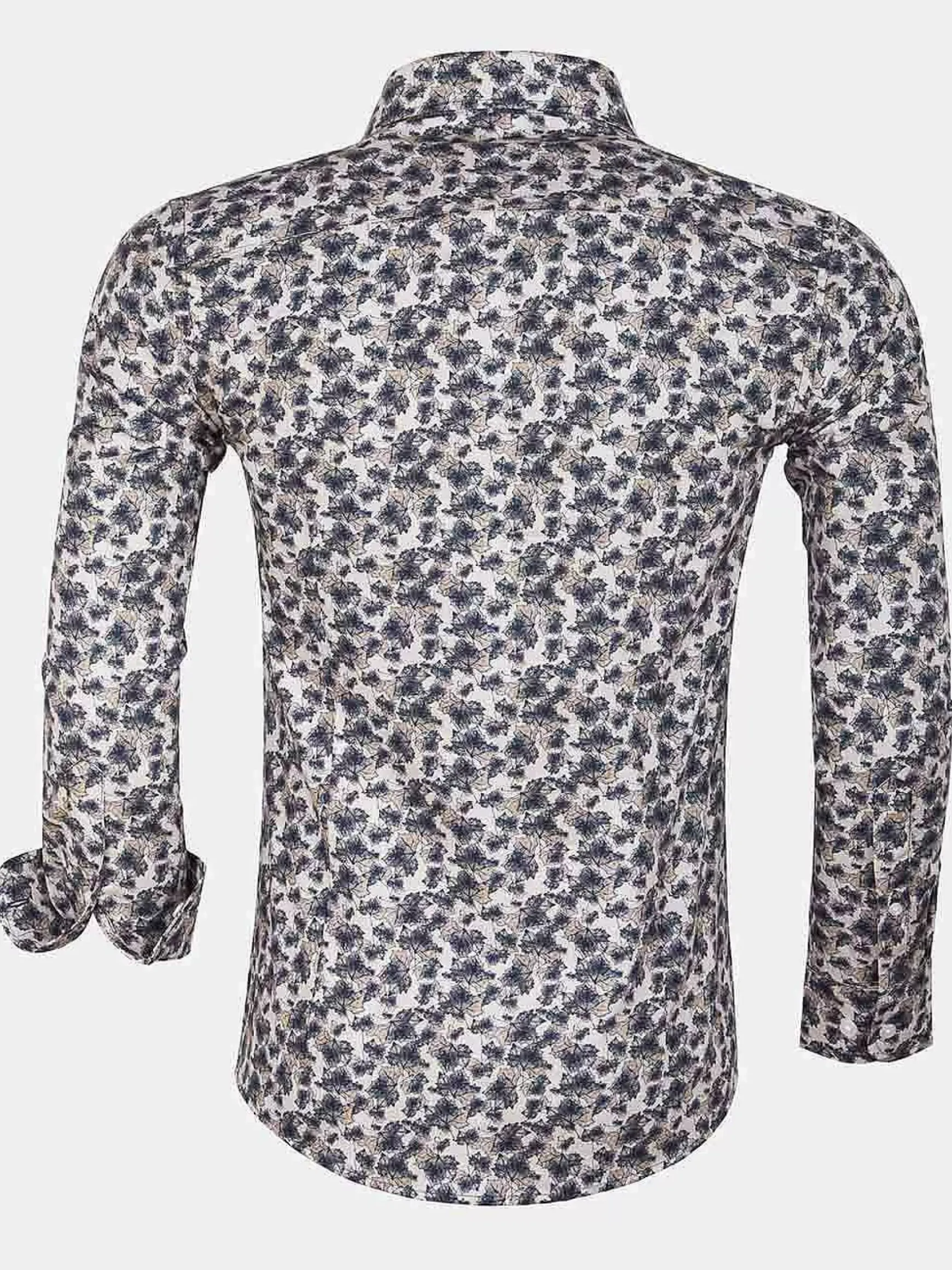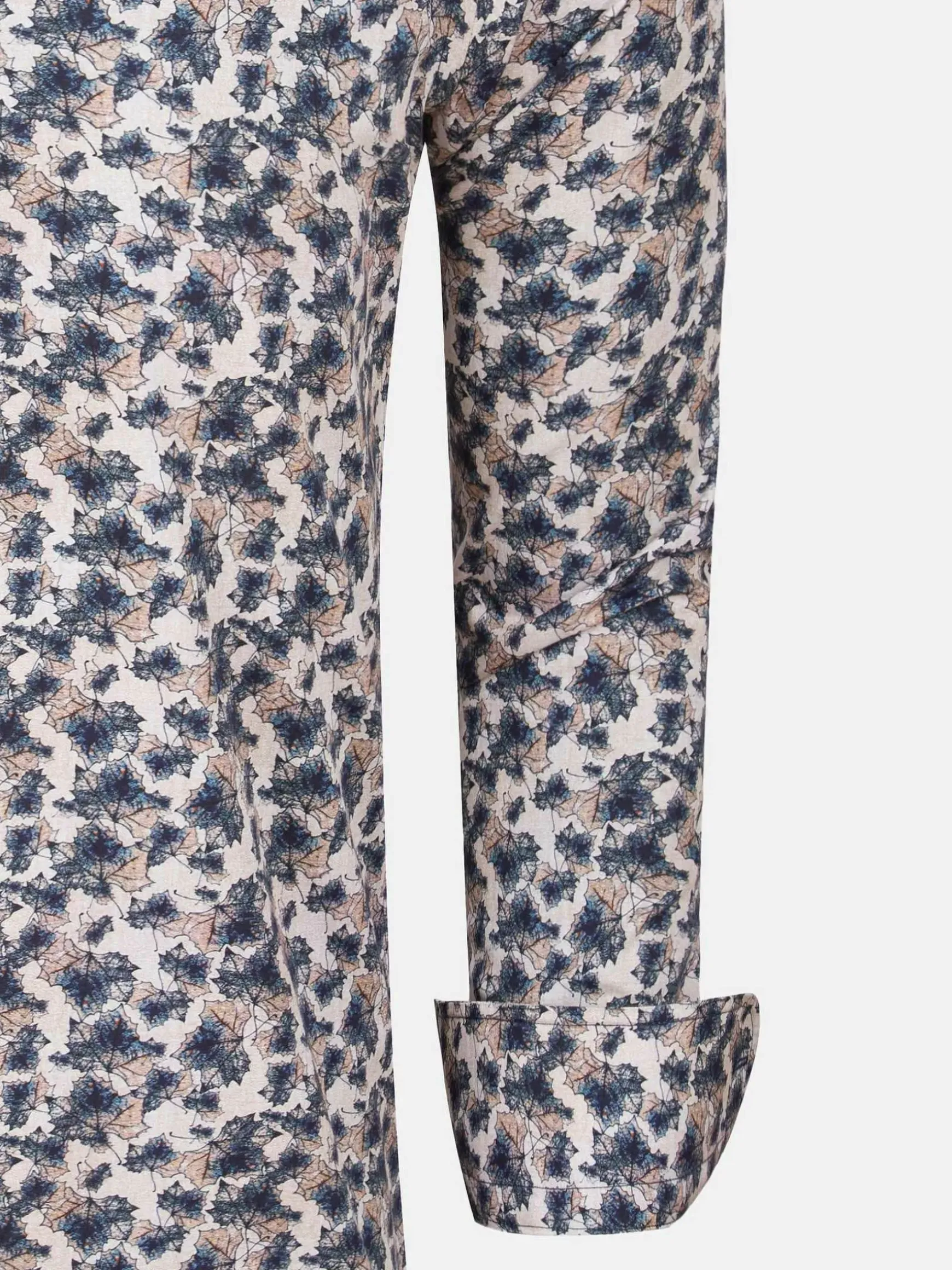Overhemd Met Een Print Van Bloemen In Beige En Donkerblauw. Loopt Van Onderen Rond Af En Heeft Witte, Ronde Knopen. Dit Model Staat Mooi Op Een Pantalon Voor Een Nette Look Of Op Een Jeans Voor Een Wat Lossere Outfit.