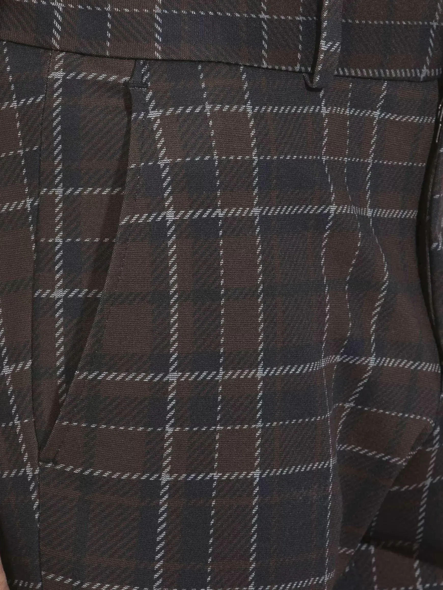 Bruine Pantalon Met Een Slim Fit Design Voor Een Perfect Draagcomfort. Dit Model Heeft Een Ritssluiting En Zakken Aan De Voor- En Achterzijde. Er Is Een Subtiel Geruit Patroon In De Stof Verwerkt.