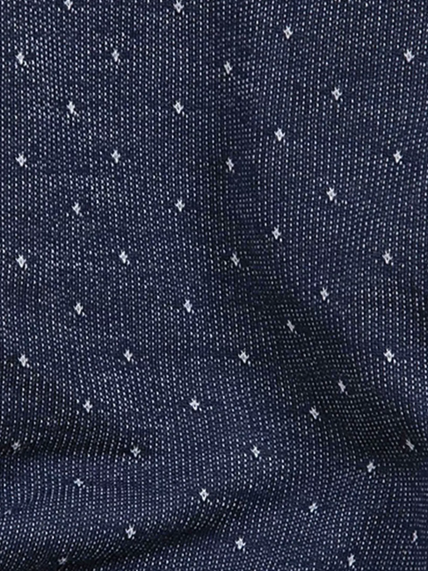Blauwe Sweater Met Ronde Hals. Deze Sweater Heeft Een Subtiel Wit Stippenpatroon En Een Embleem Op De Linkerborst. Op De Linkermouw Is Een Decoratieve Rits Bevestigd.