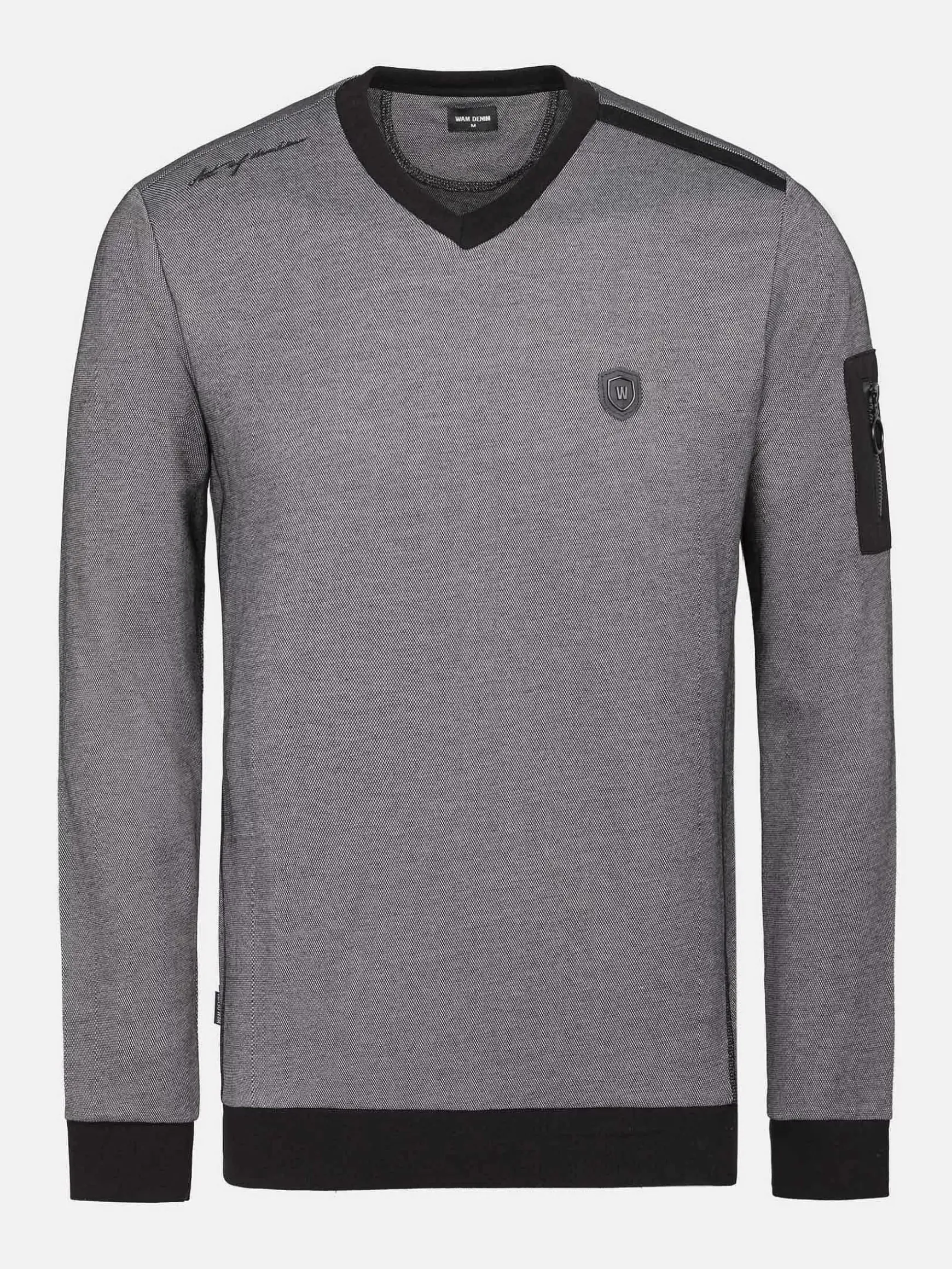 Antraciete Trui Met V-Hals. Deze Modieuze Sweater Is Met Verschillende Details Afgewerkt: Een Vierkant Embleem Op De Linkerborst, Tekst Op De Rechterborst En Een Gestikte Ritsluiting Op Zwart Vlak Op De Linkermouw.