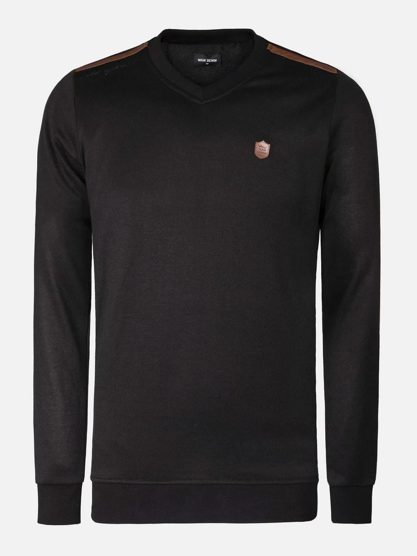 Zwarte Trui Met V-Hals. De Trui Voelt Lekker Zacht Aan En Is Afgewerkt Met Verschillende Details. Op De Schouders Zijn Bruine Elementen Gestikt En De Trui Heeft Linksonder Een Bruin Embleem. Door De Neutrale Kleur Is Deze Trui Makkelijk Te Combineren.