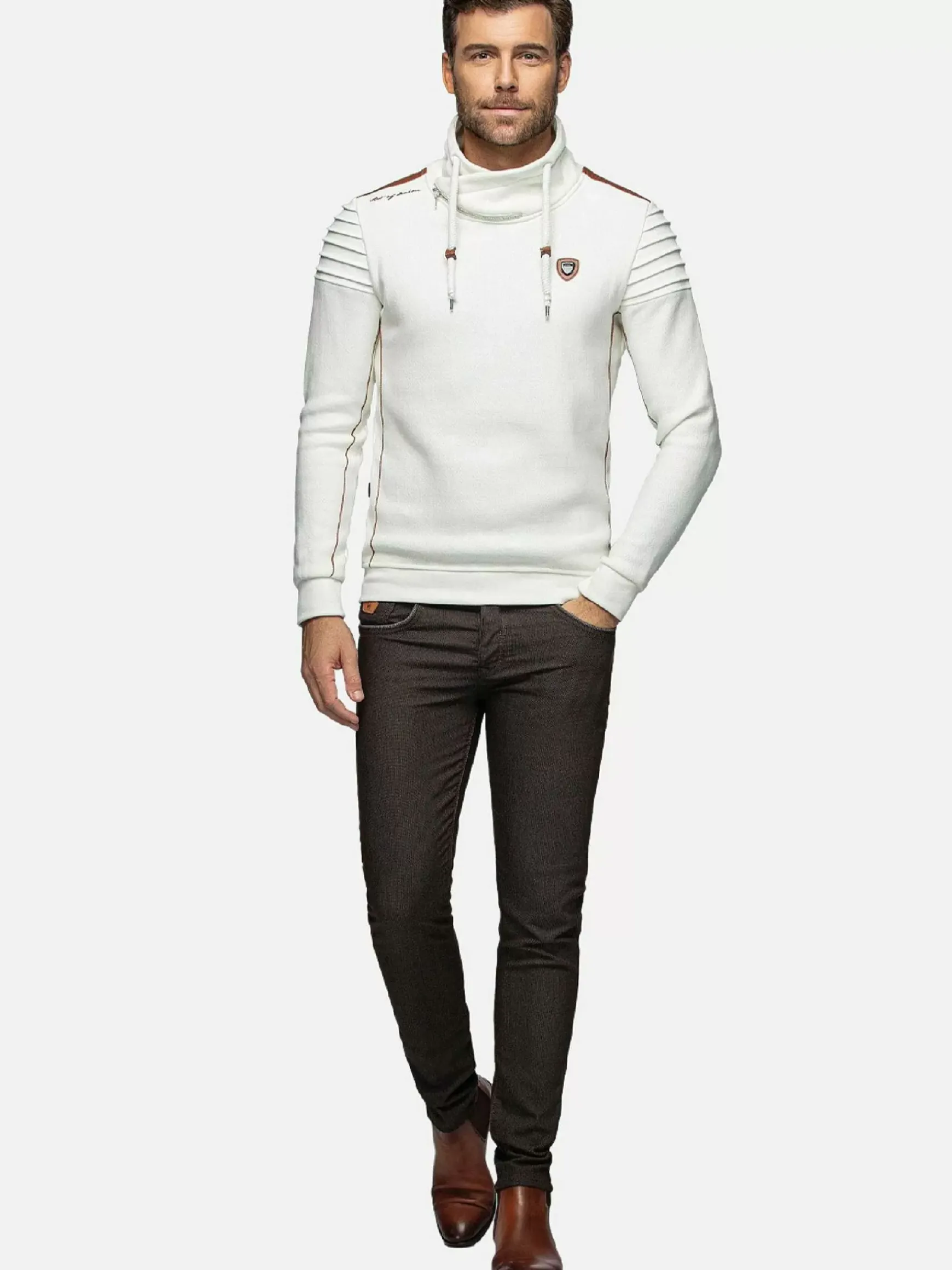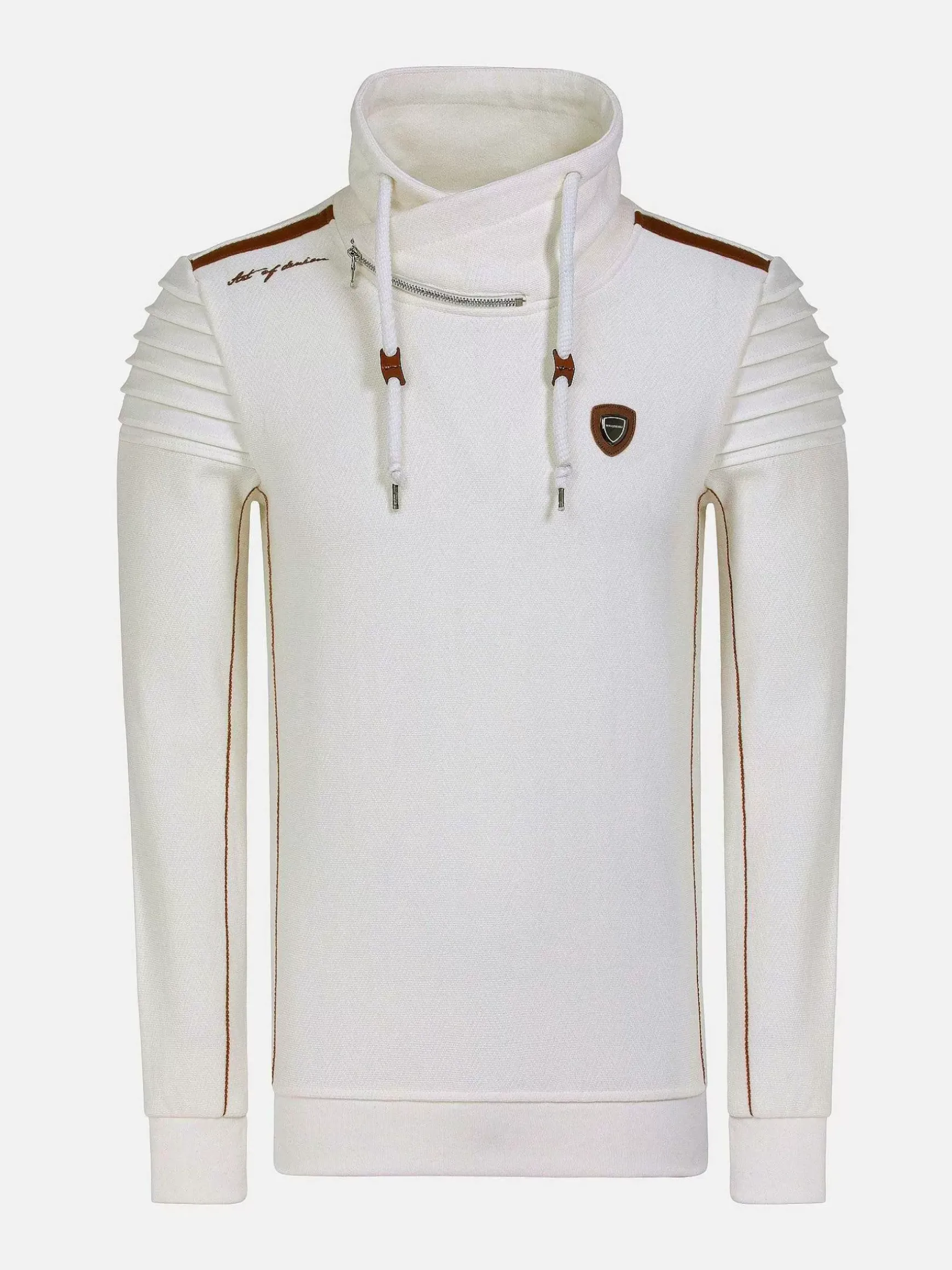 Witte Sweater Met Een Hoge Kraag. De Kraag Heeft Een Kleine Rits En De Sweater Heeft Aan De Binnenkant Van Mouw Een Subtiele Bruine Streep Lopen. Op De Linkerborst Een Embleem Bevestigd. Voor Een Perfect Pasvorm Zijn De Uiteinden Van De Mouwen En De Boord Aan De Onderkant Elastisch.