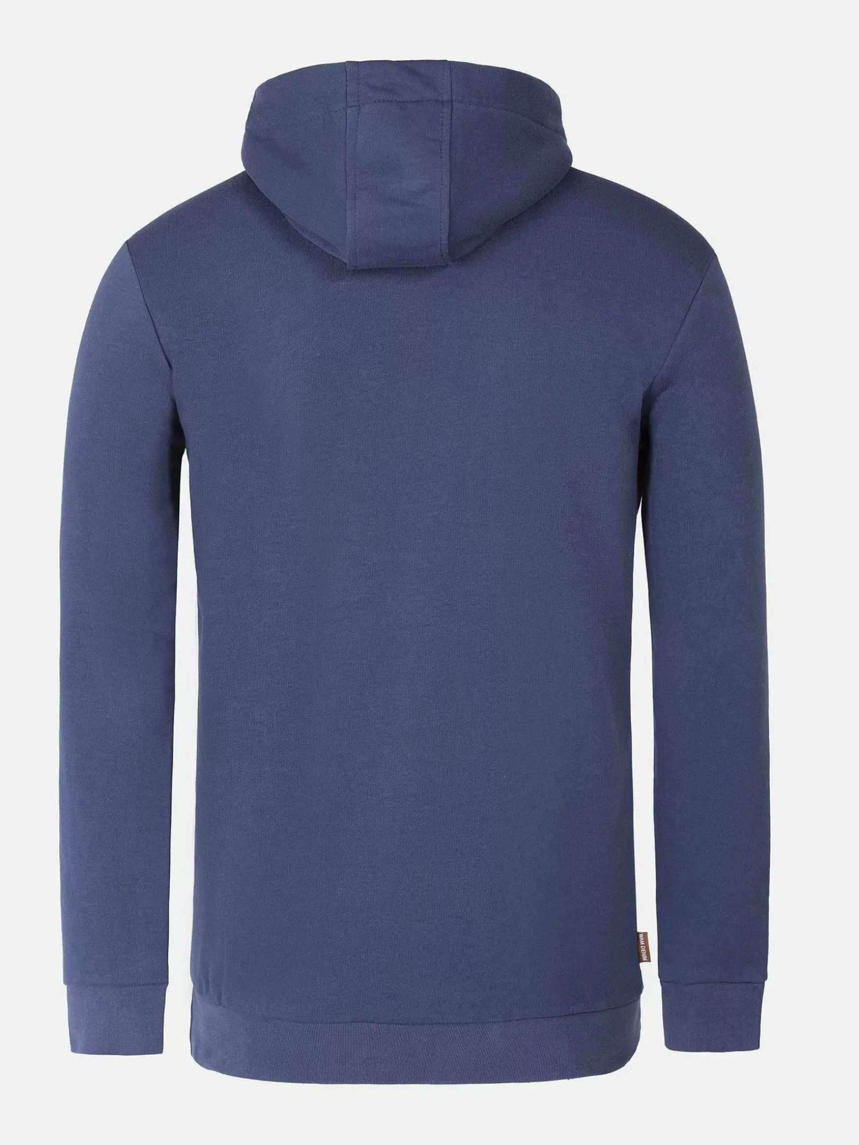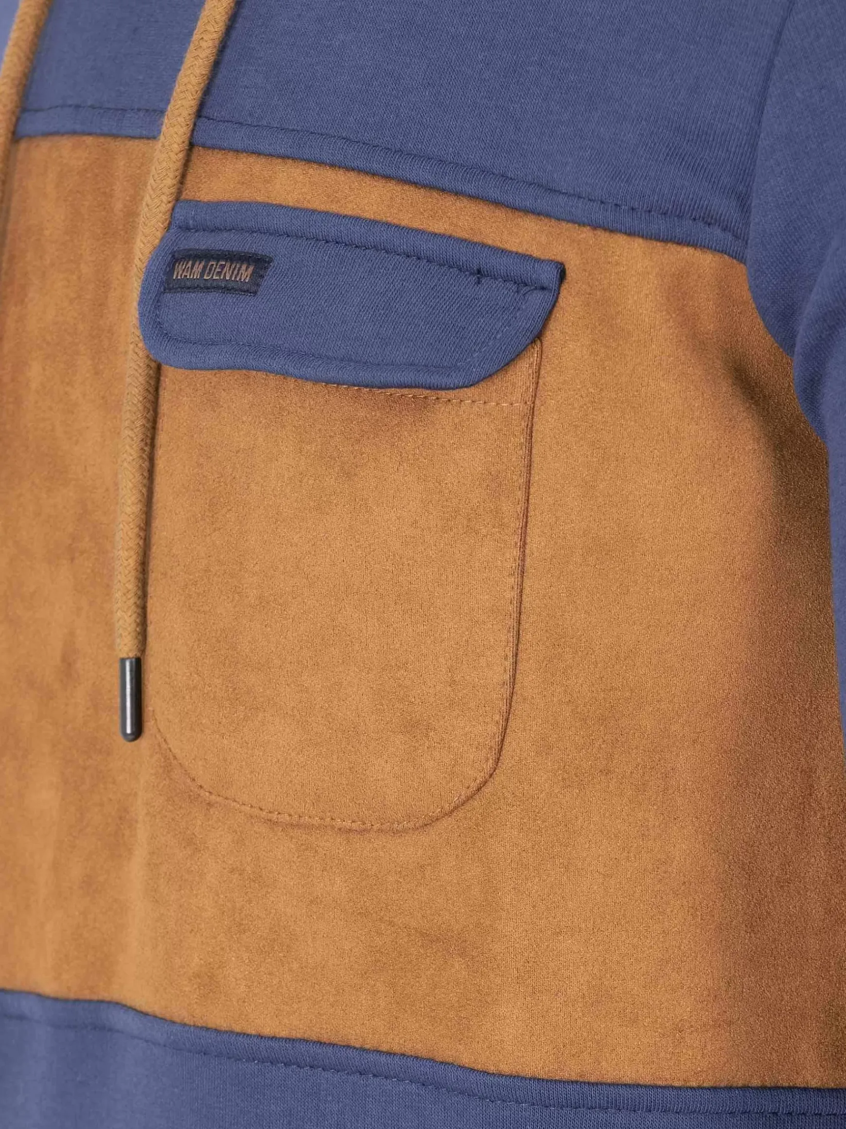 Blauwe Hoodie Met Een Groot Camel Kleurig Vlak Op De Voorzijde. Op De Linkerborst Is Een Zak Bevestigd Met Daarop Een Wam Denim Label.