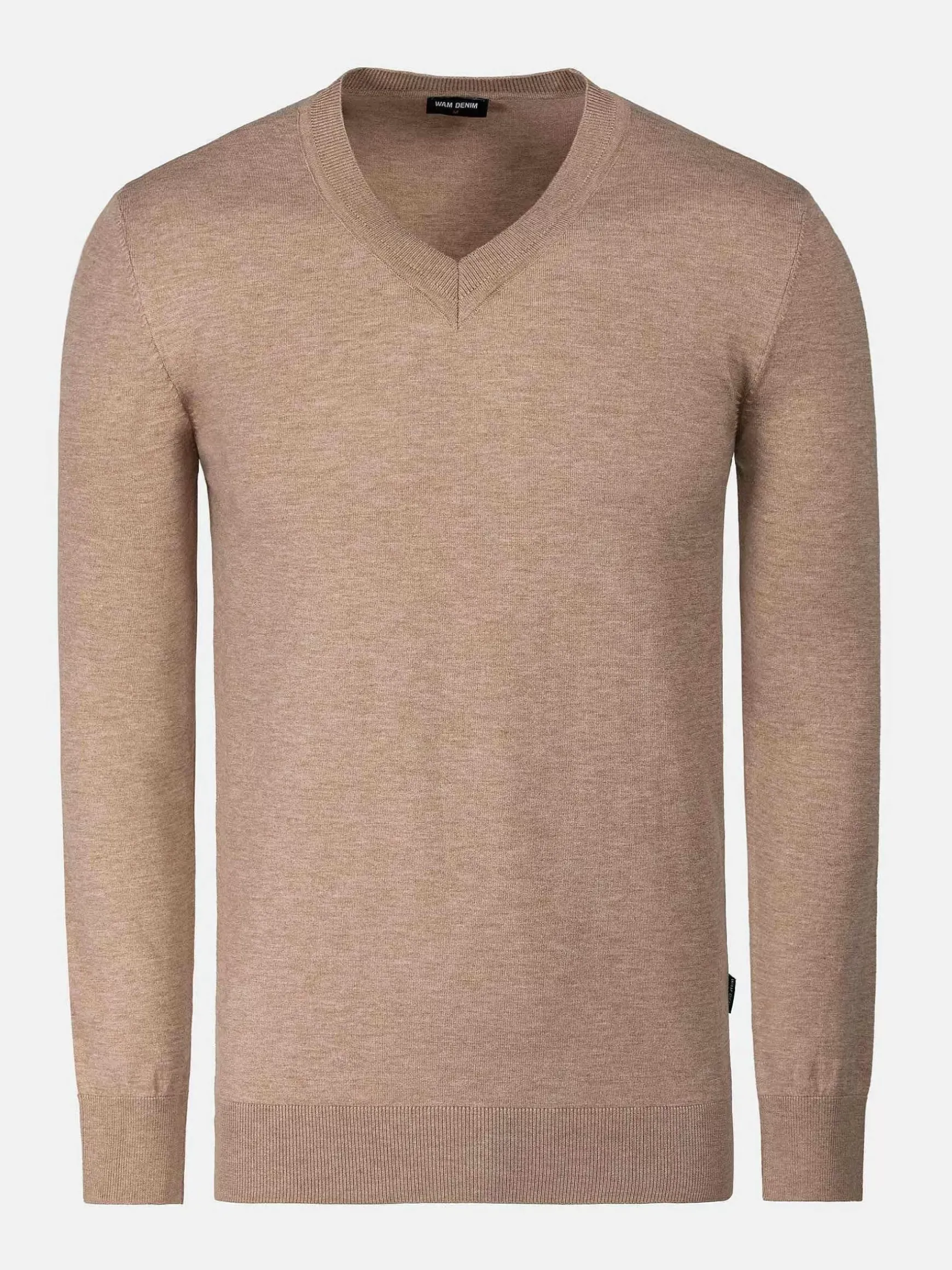 Warme En Zachte Beige Trui Met V-Hals. Door Het Stretch In De Boord Onderaan Heeft De Trui Een Perfecte Pasvorm. Door De Kleur En Effen Stof Is Deze Trui In Veel Combinaties Te Dragen. Dit Model Past Zowel Op Een Jeans Als Op Een Pantalon.