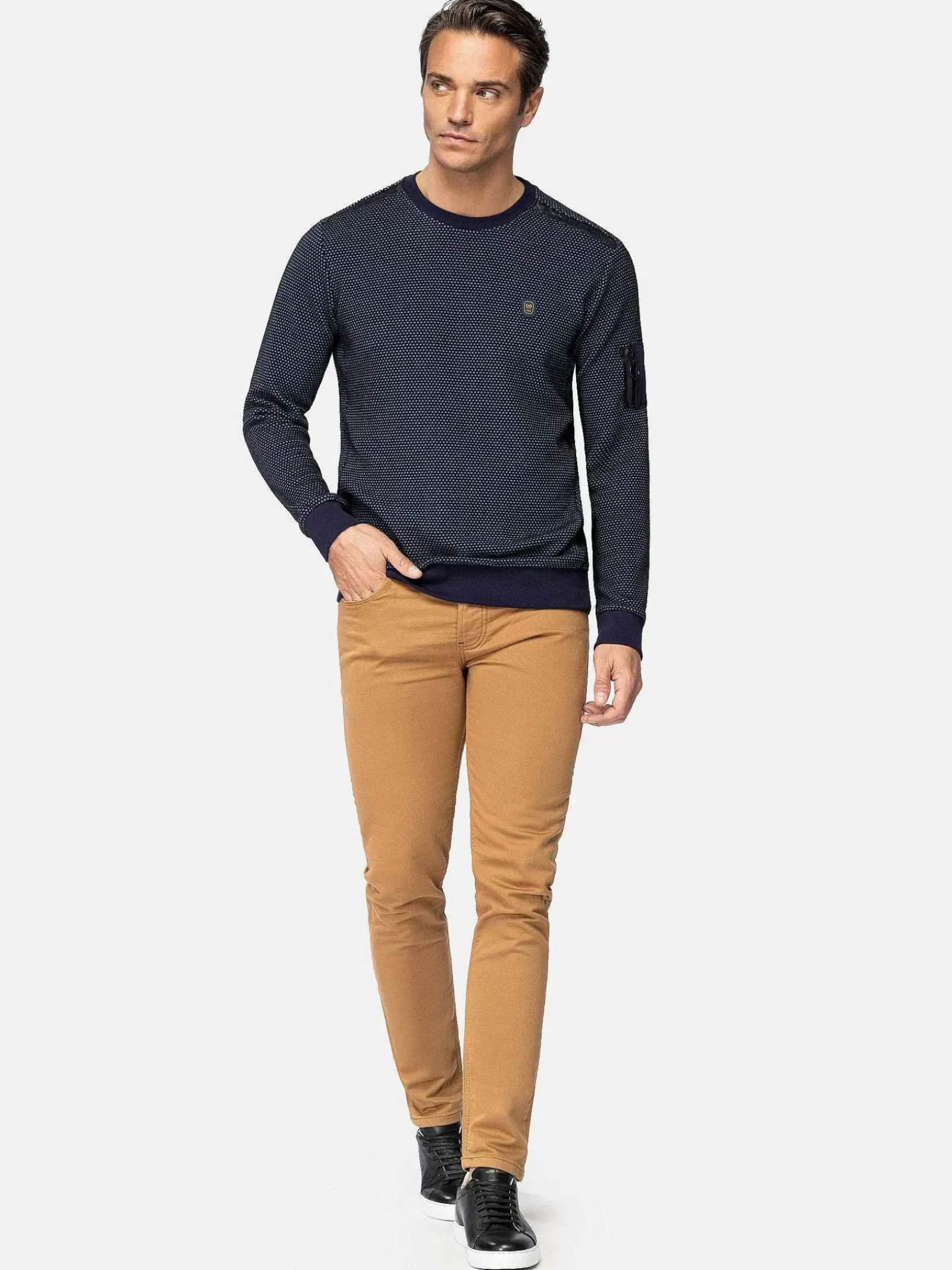 Heerlijke Sweater Met Ronde Hals En Wit Stippenpatroon Voor Een Trendy Look. Dit Model Heeft Een Decoratieve Rits, En Een Elastische Manchet En Boord Voor Volledig Comfort. Afgewerkt Met Donker Marinecontrast Rondom Onder De Arm Voor Een Prachtige Look. Hij Past Goed Bij Veel Outfitcombinaties, Perfect Voor Kantoor Of Vrije Tijd.