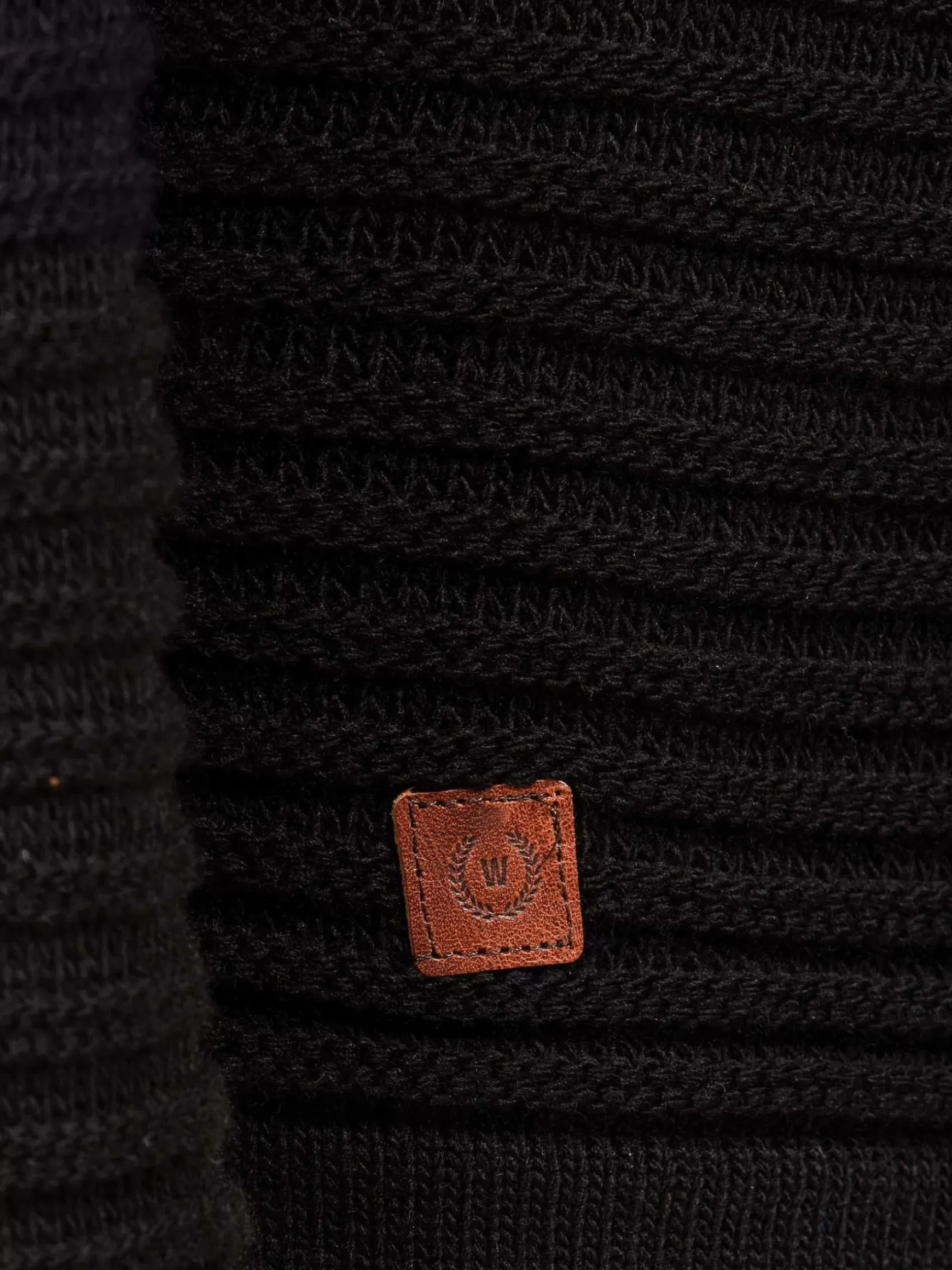Zwarte Trui Met Slim Fit Pasvorm, Ronde Hals En Lange Mouwen. Met Detail Afgewerkt, Bruin Embleem Rechtsonder Aan De Trui.