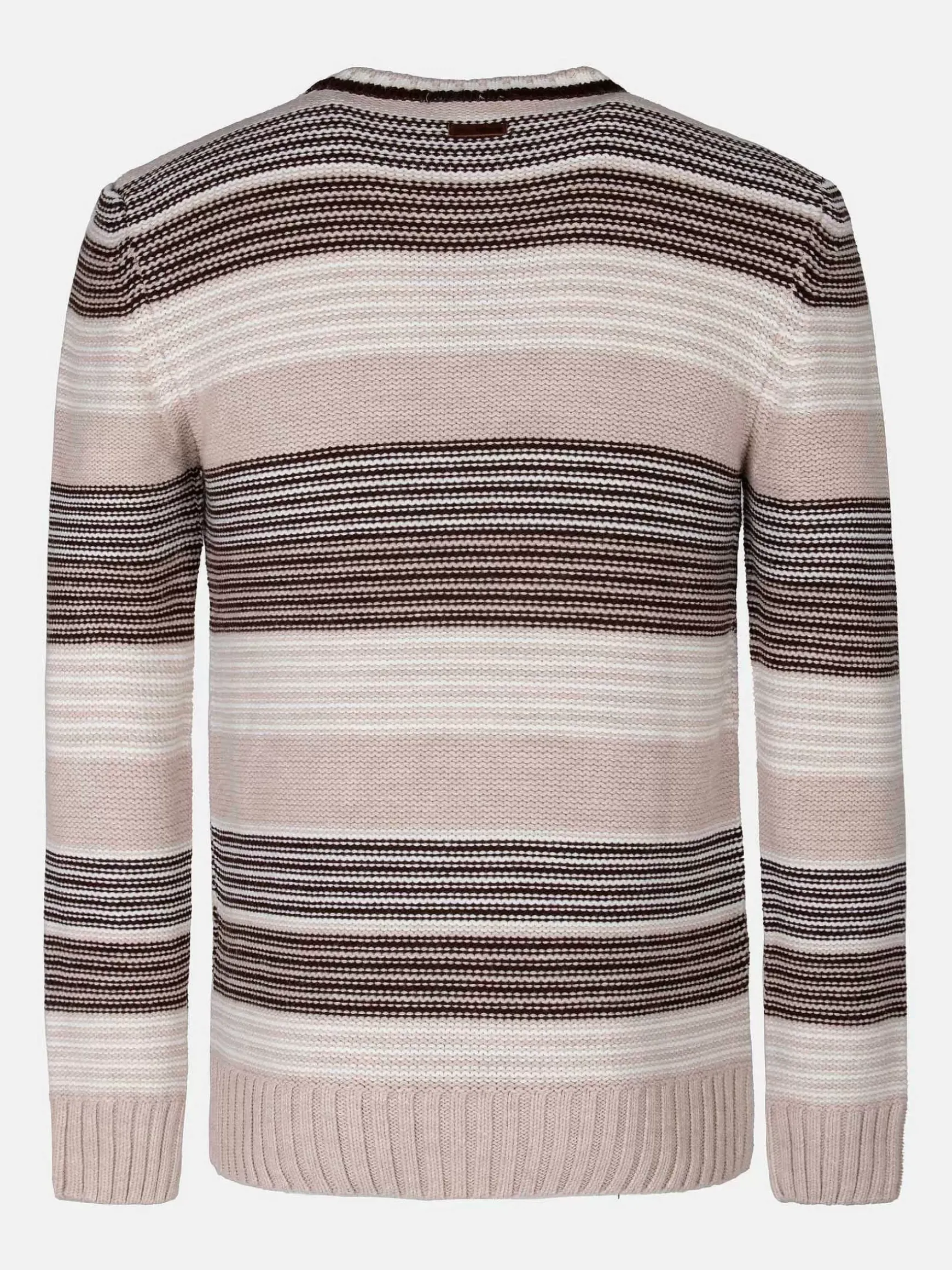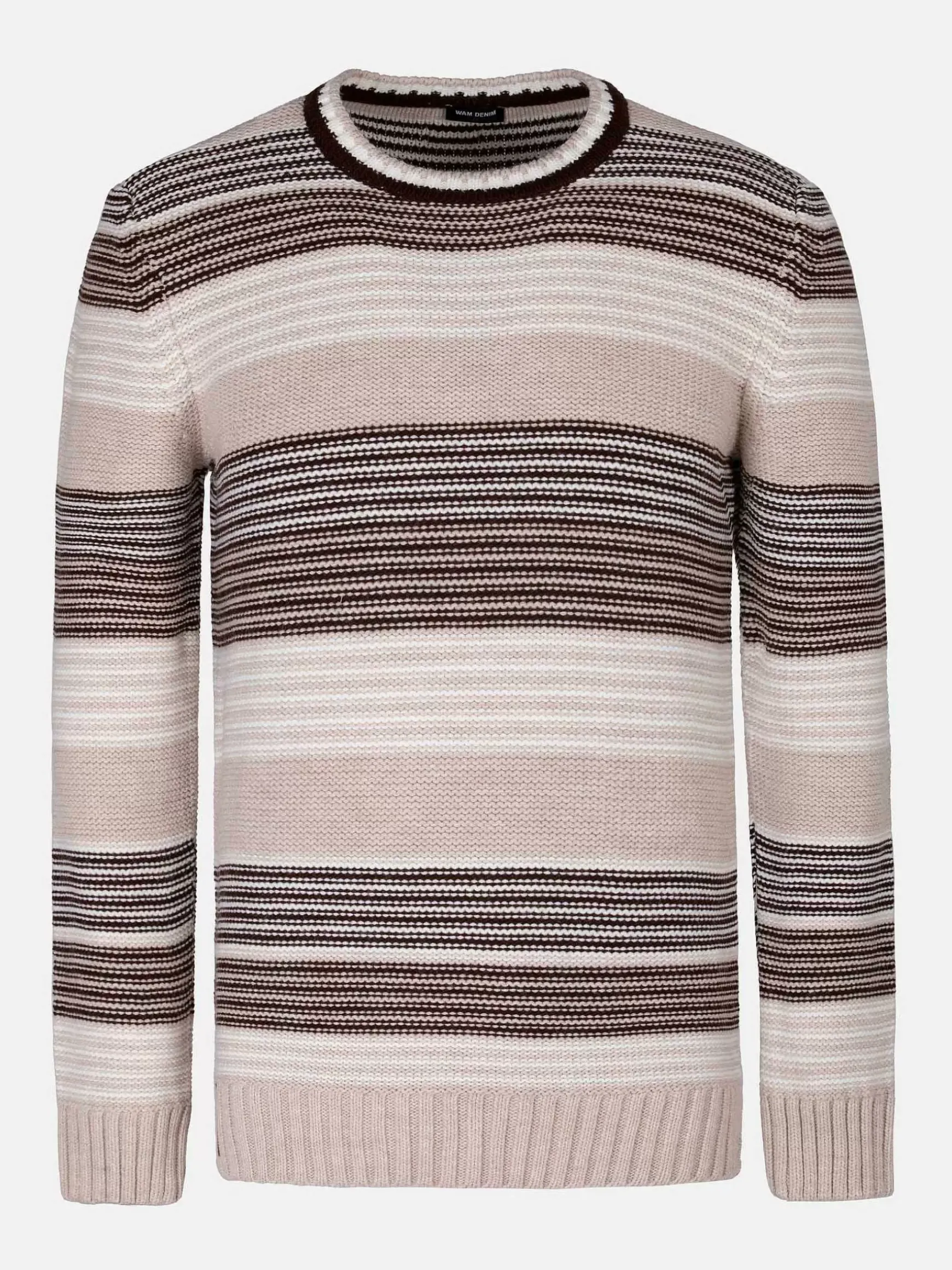 Beige Trui Met Gestreept Motief. Beige En Bruine Kleuren Wisselen Elkaar Af. De Trui Heeft Een Ronde Hals.