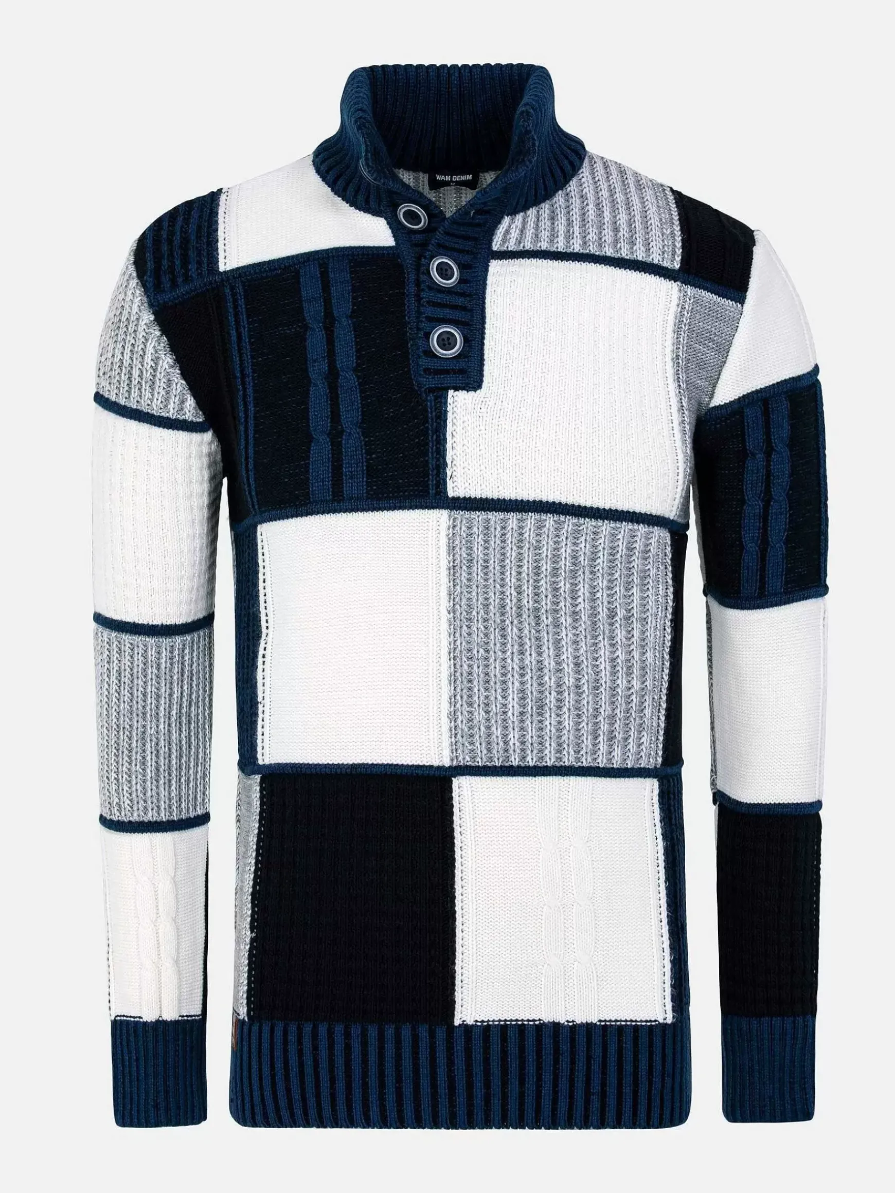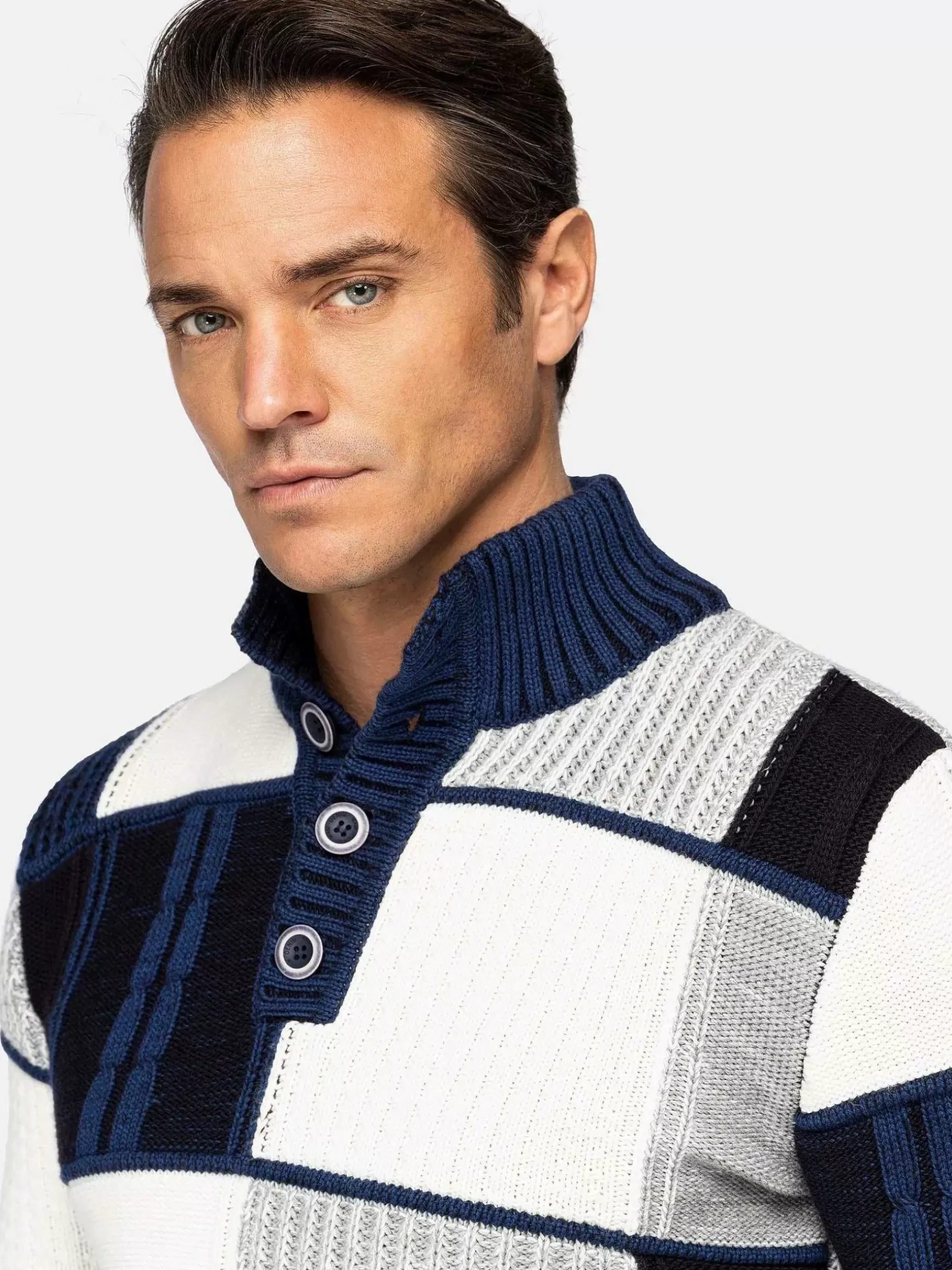 Prachtige Trui Met Een Elegante Uitstraling In Een Mooie Driekleur Combinatie. De Trui Heeft Een Opvallend Design Met Knopen In De Hals Die Dit Model Iets Extra’S Geven. Voor Een Stijlvolle Look Draag Je Deze Trui Op Een Nette Jeans Of Chino.